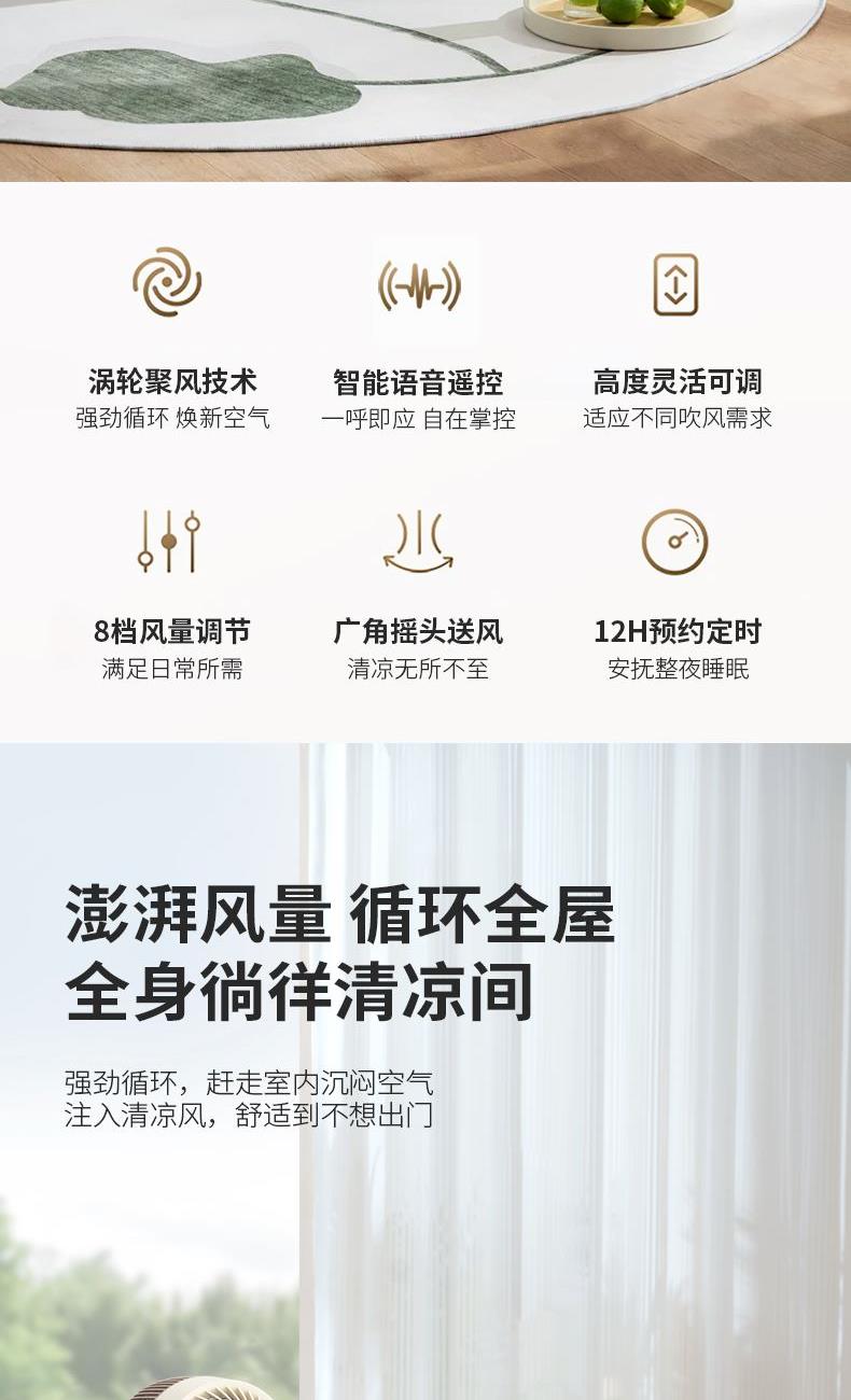 额定电压:220V~ 额定功率:40W 额定频率:50Hz 电源线长:150cm 材 质:前网、后网、风叶、底座:PP,立柱管:ABS > 智能语音操作,遥控器操作,无需走动,解放双腿 > 8档风速调节,满足全家使用 > 12h智能定时,到点即停,不怕着凉 > 高度随心可调,台立两用,上下左右自动摇头 > 贴心设计香薰盒,可放置防 蚊虫香薰,驱赶蚊虫