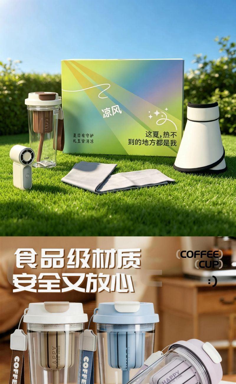 配置: 可卷双面冰丝帽*1 手持高速风扇*1 冰丝袖套*1 塑料铃兰咖啡杯*1 主要材质和功能: 可卷冰丝帽:涤纶(聚酯纤维),防晒,透气,遮阳 冰丝袖套:UPF50+,90%锦纶10%氨纶 手持高速风扇:100档调速 咖啡铃兰杯:550ml,食品级PP/PC/硅胶