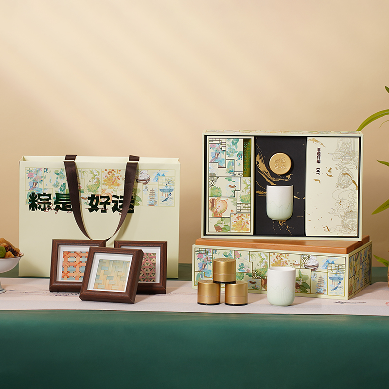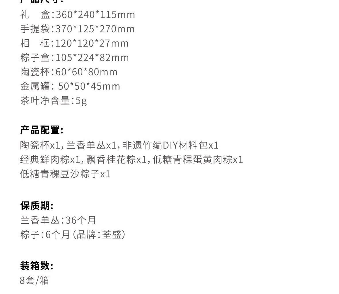 产品尺寸: 礼 盒:360*240*115mm 手提袋:370*125*270mm 相 框:120*120*27mm 粽子盒:105*224*82mm 陶瓷杯:60*60*80mm 金属罐:50*50*45mm 茶叶净含量:5g 产品配置: 陶瓷杯x1,兰香单丛x1,非遗竹编DIY材料包x1 经典鲜肉粽x1,飘香桂花粽x1,低糖青稞蛋黄肉粽x1 低糖青稞豆沙粽子x1 保质期: 兰香单丛:36个月 粽子:6个月