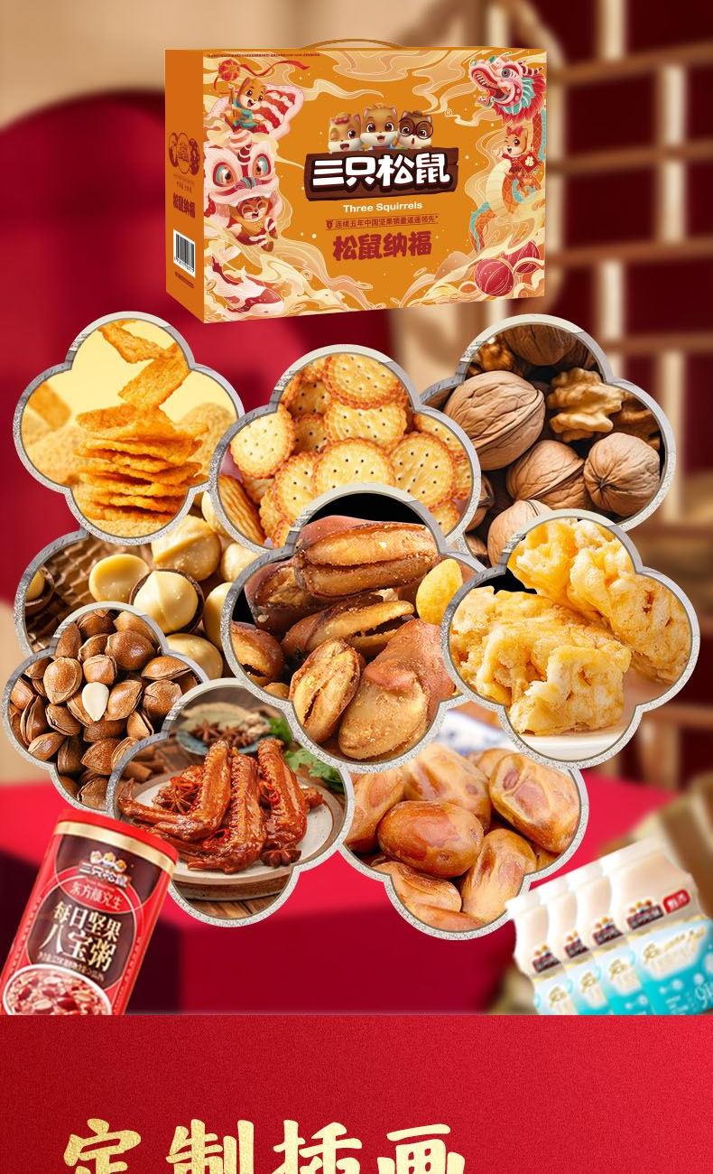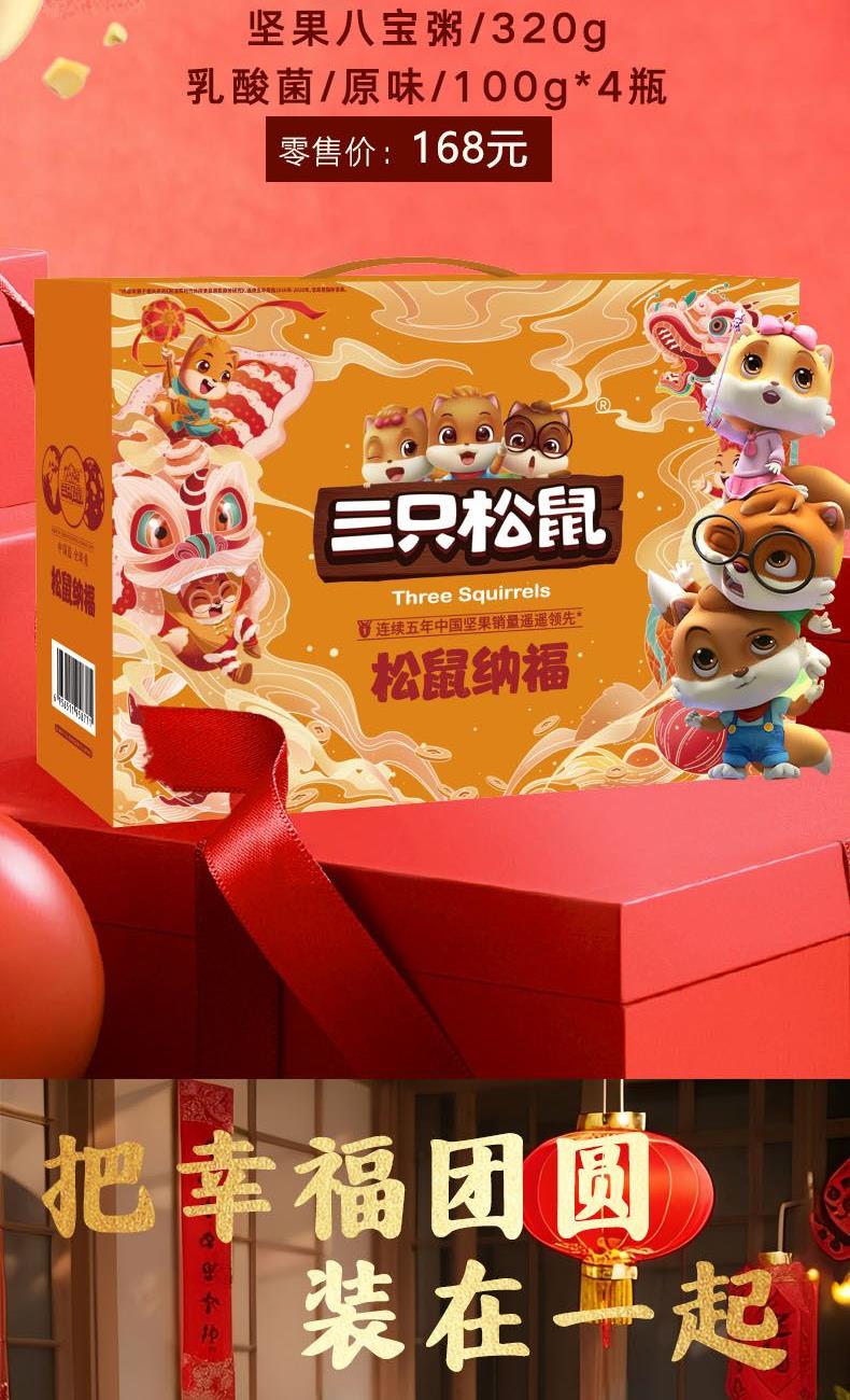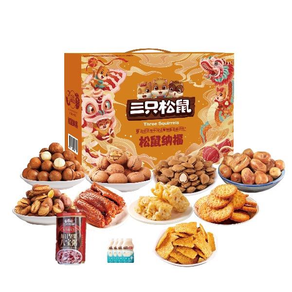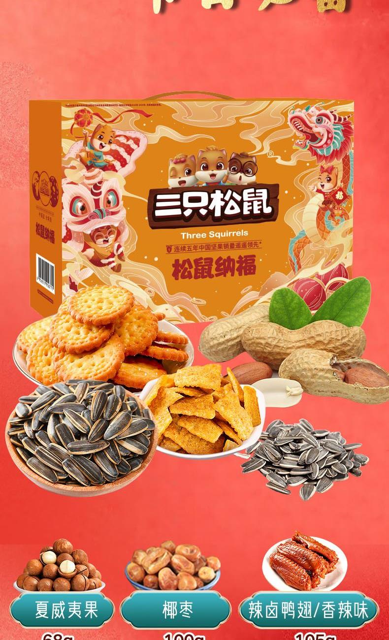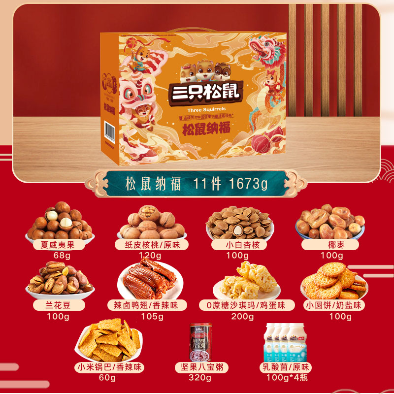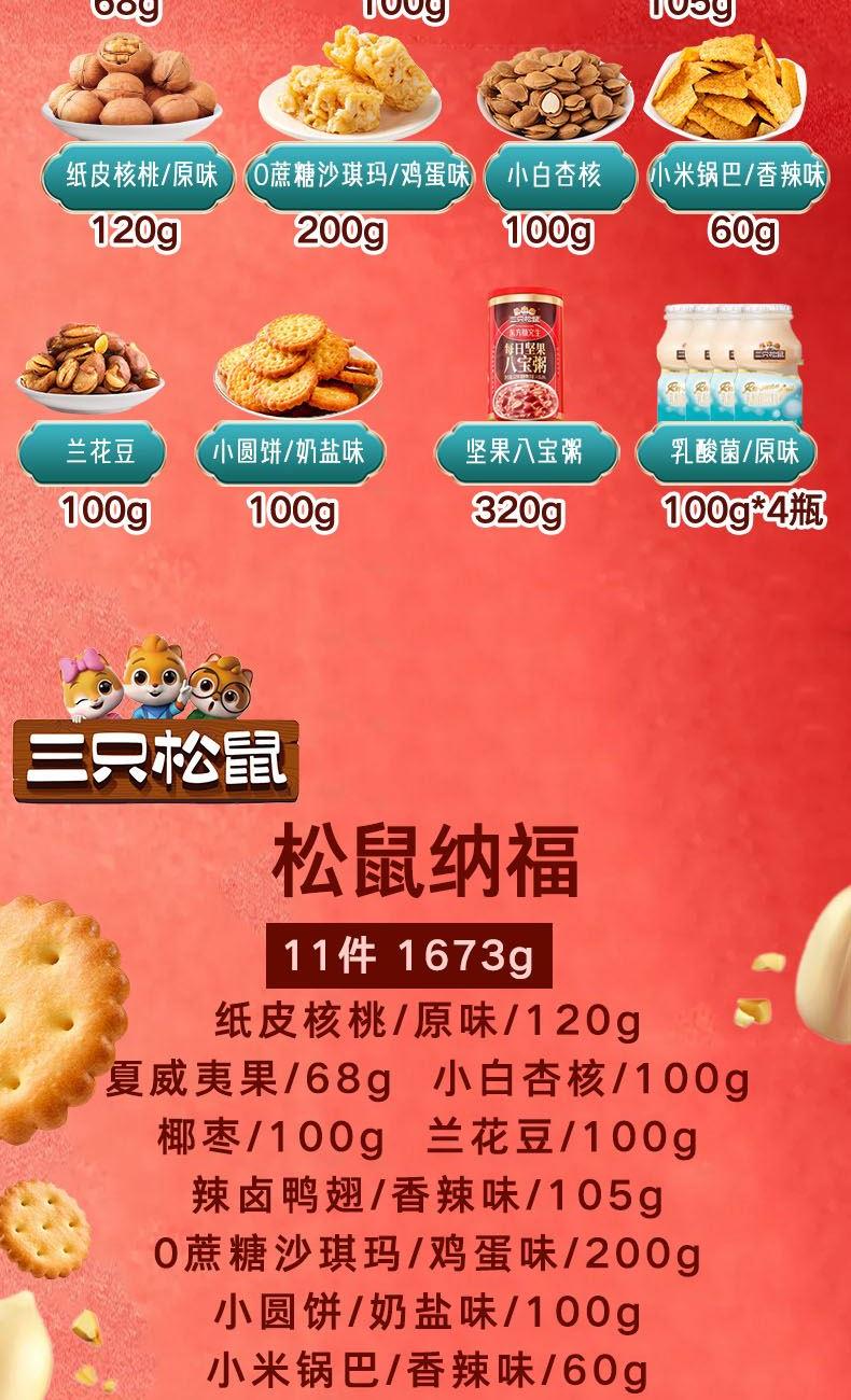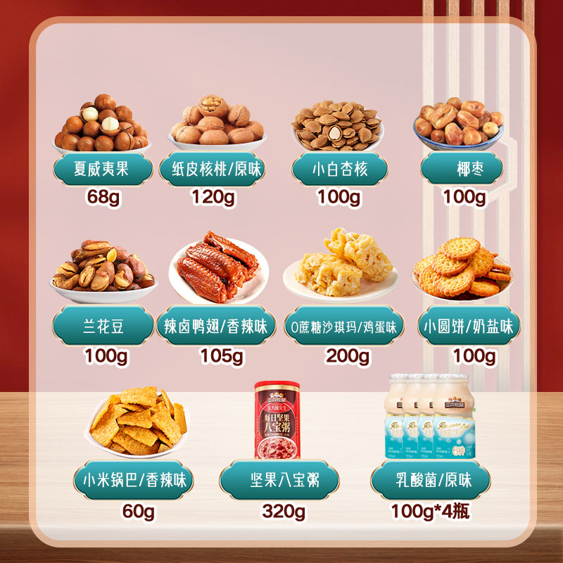 内容物:纸皮核桃/原味/120g 夏威夷果/68g 小白杏核/100g 椰枣/100g 兰花豆/100g 辣卤鸭翅/香辣味/105g 0蔗糖沙琪玛/鸡蛋味/200g 小圆饼/奶盐味/100g 小米锅巴/香辣味/60g 坚果八宝粥/320g 乳酸菌/原味/100g*4瓶 礼盒尺寸:37*27*12cm 品类丰富,产品便携包装 购物不止于下单,服务长期保持 性价比极高,各价位都有,满足不同选择
