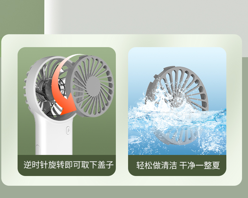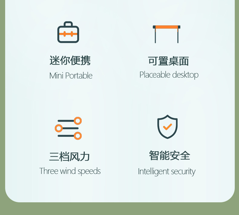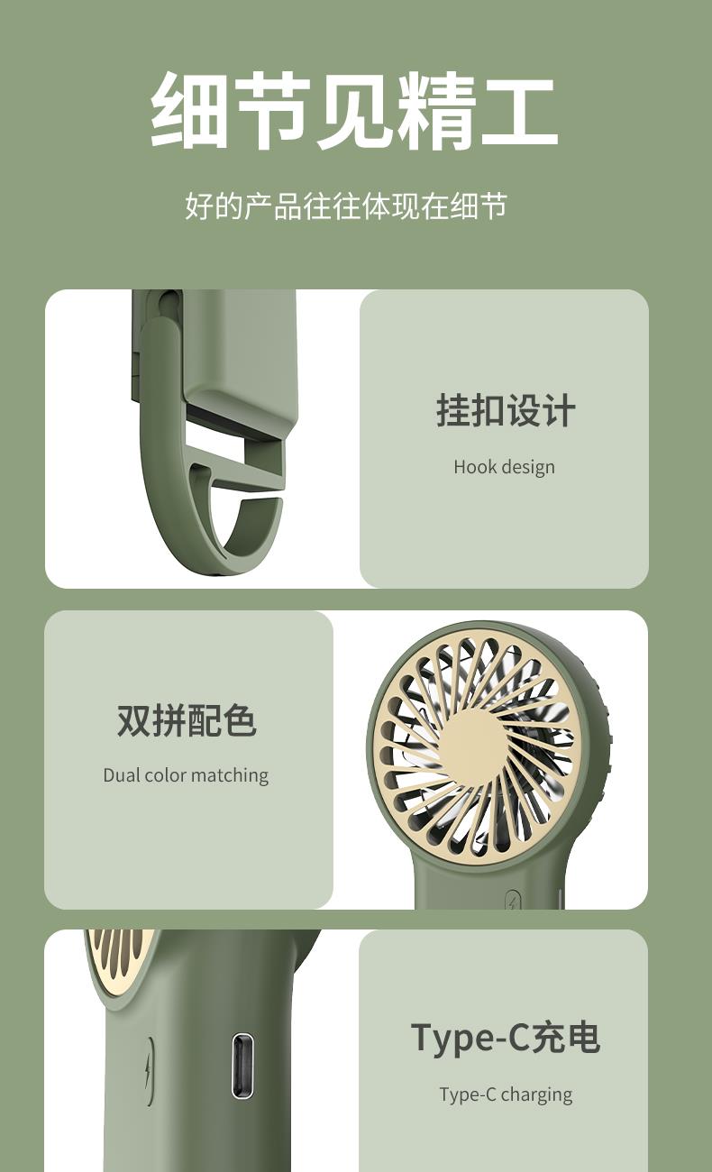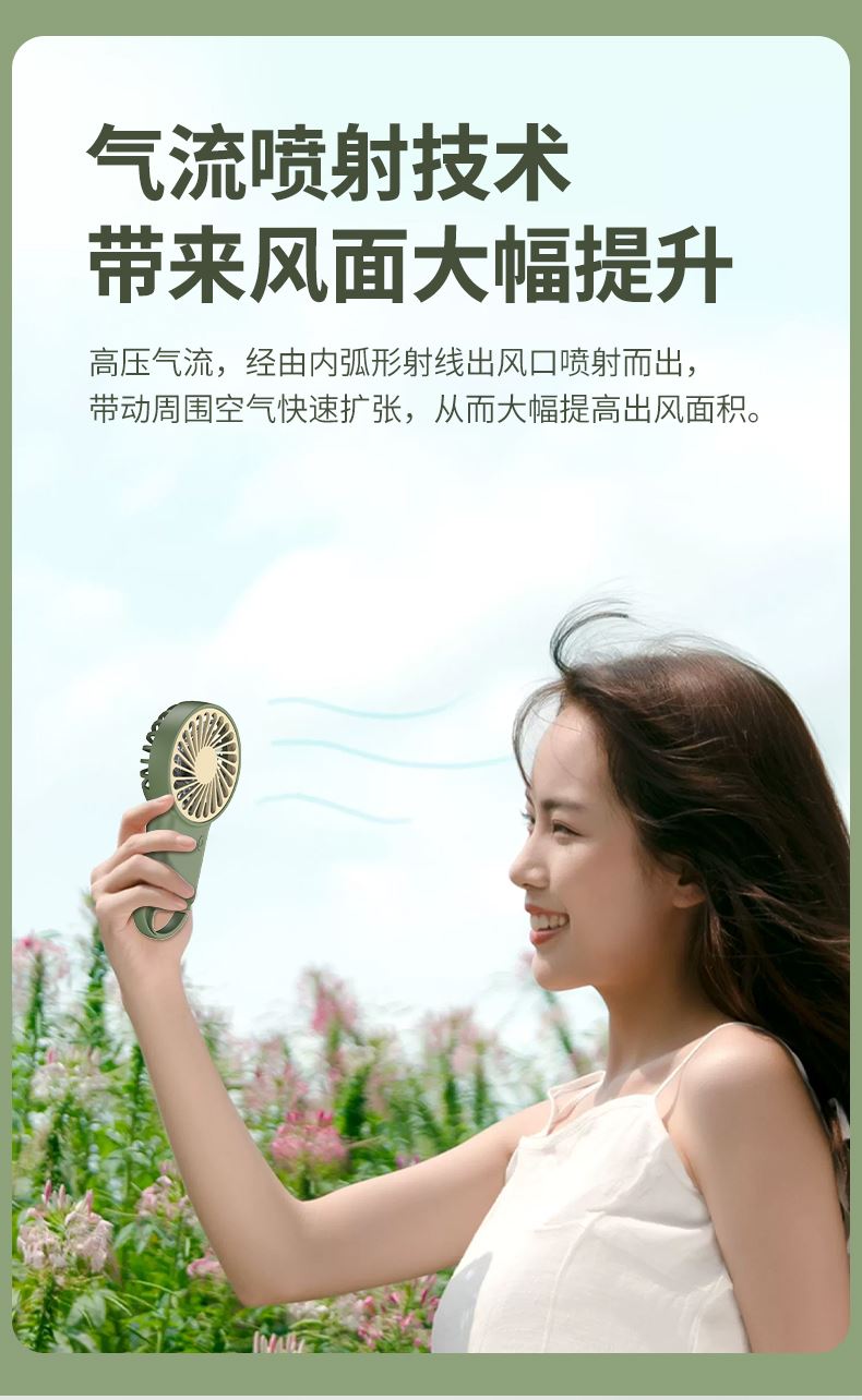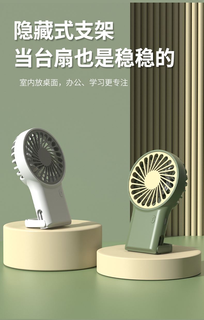 【推荐理由】: 精致小巧,方便携带 可挂背包,可立桌面 多场景 三档风速可调 风扇罩可拆卸清洁 颜色:绿色 白色 橙色 尺寸:85*33*160mm 容量:300mAh 包装:彩盒包装