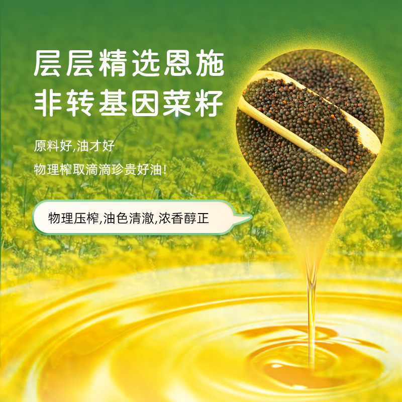 1、【原料】非转基因油菜籽为原料; 2、【加工工艺】采用压榨工艺,油品透亮; 3、【特点】烟点高、炒菜油烟少、低温下不易凝固等特点;菜籽油中还含有丰富的维生素E以及油酸、亚油酸、亚麻酸等;