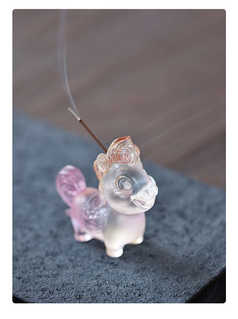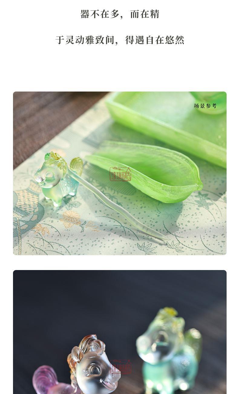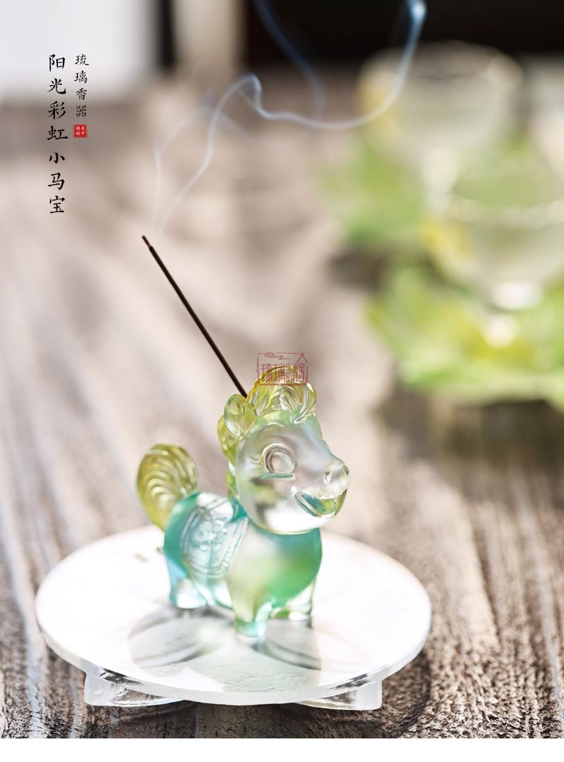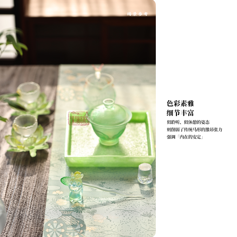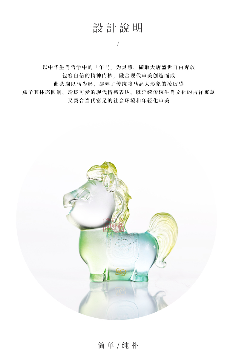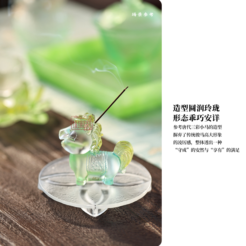 【功能】茶搁、香插、笔搁 【颜色】①琥绿渐变 ②琥粉渐变 【尺寸】72*71*29mm(长*宽*高) 【礼盒尺寸】167*145*64mm (长*宽*高)配套礼袋 【备注】附赠线香一盒 以中华生肖哲学中的「午马」为灵感,撷取大唐盛世自由奔放、包容自信的精神内核,融合现代审美创造而成。此茶搁以马为形,摒弃了传统骏马高大形象的凌厉感,赋予其体态圆润、玲珑可爱的现代情感表达,既延续传统生肖文化的吉祥寓意,又契合当代富足的社会环境和年轻化审美,寓意在安定祥和的当下,我们同样可以守护内心那份纯粹的愉悦与松弛。生肖为形:以十二生肖中的马为灵感,参考了唐代三彩小马的造型,与高大威猛的战马不同,这种小马的造型,往往体态圆润,神情温顺。反映了在社会稳定、物质丰盈的背景下,人们对美好生活的细致追求与乐观精神。小马四足稳稳站立,形态乖巧安详,透出一种“守成”的安然与“享有”的满足。