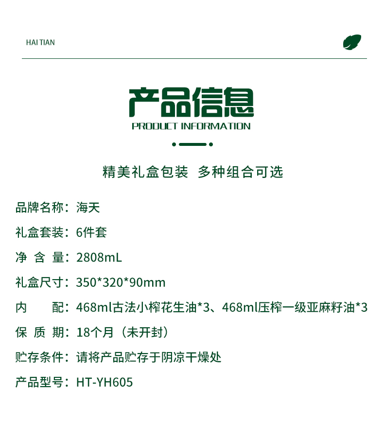 • 海天食用油非转基因花生油+亚麻籽油6件套HT-YH605