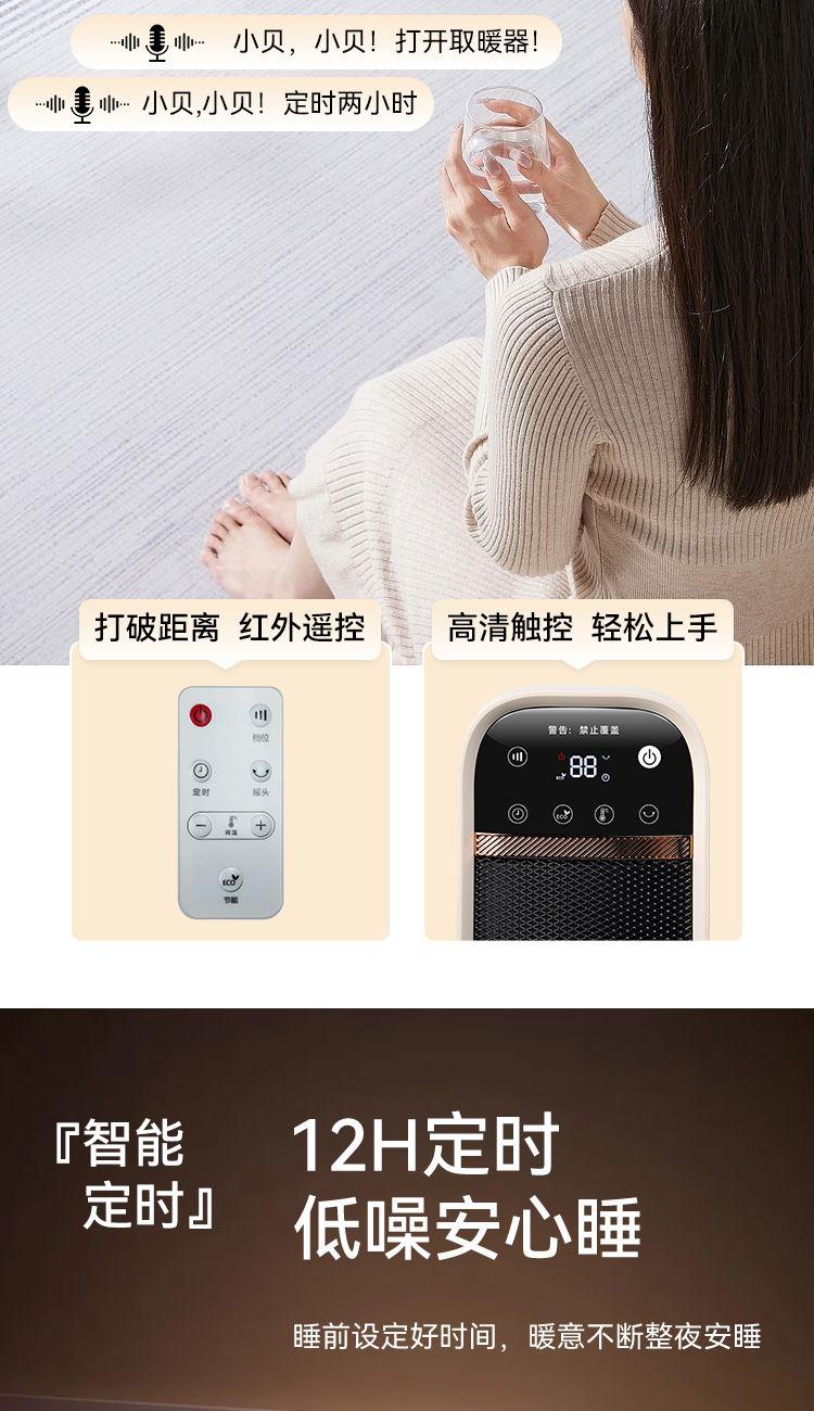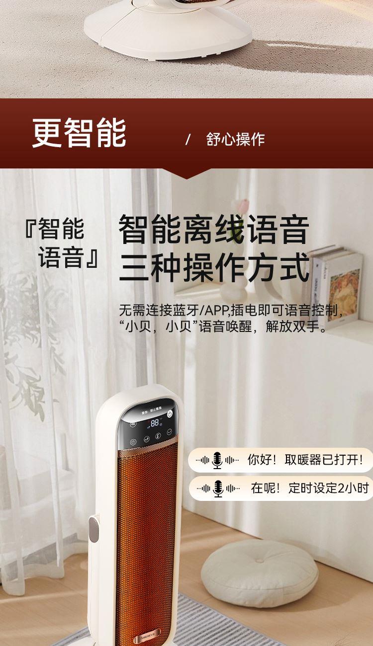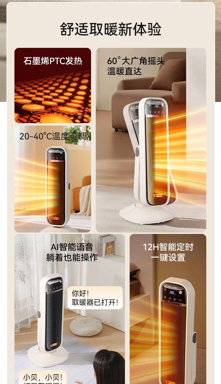 产品颜色:米白色 加热方式:石墨烯PTC陶瓷发热 额定电压:220V~ 额定频率:50Hz 摇头角度:俯仰上下60° 档位/功率:三档调节产品 净重:2.2kg 产品毛重:2.8kg 产品尺寸:262*263*636mm 包装尺寸:655*220*197mm ◁ 石墨烯速热科技,冬日取暖不等待 ◁ 远距遥控操作、语音控制、触控控制 ◁ 12H智能定时,轻音安心舒睡 ◁ 20-40°C广域调节,不同室温下都能找到理想温度 ◁ 60°大广角摇头,满足大空间多人取暖需求 ◁ 倾倒断电保护,家有宠物、孩童也能放心使用