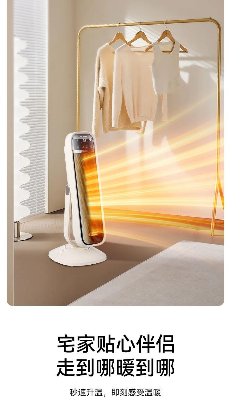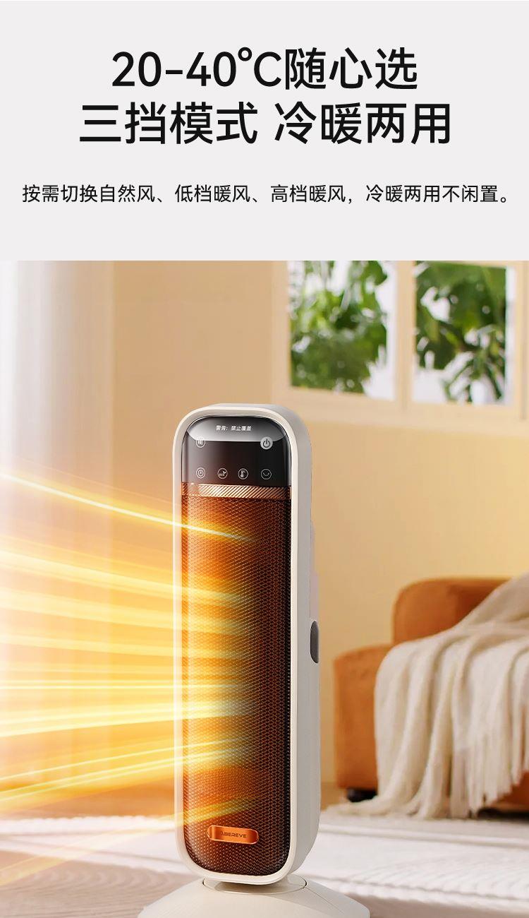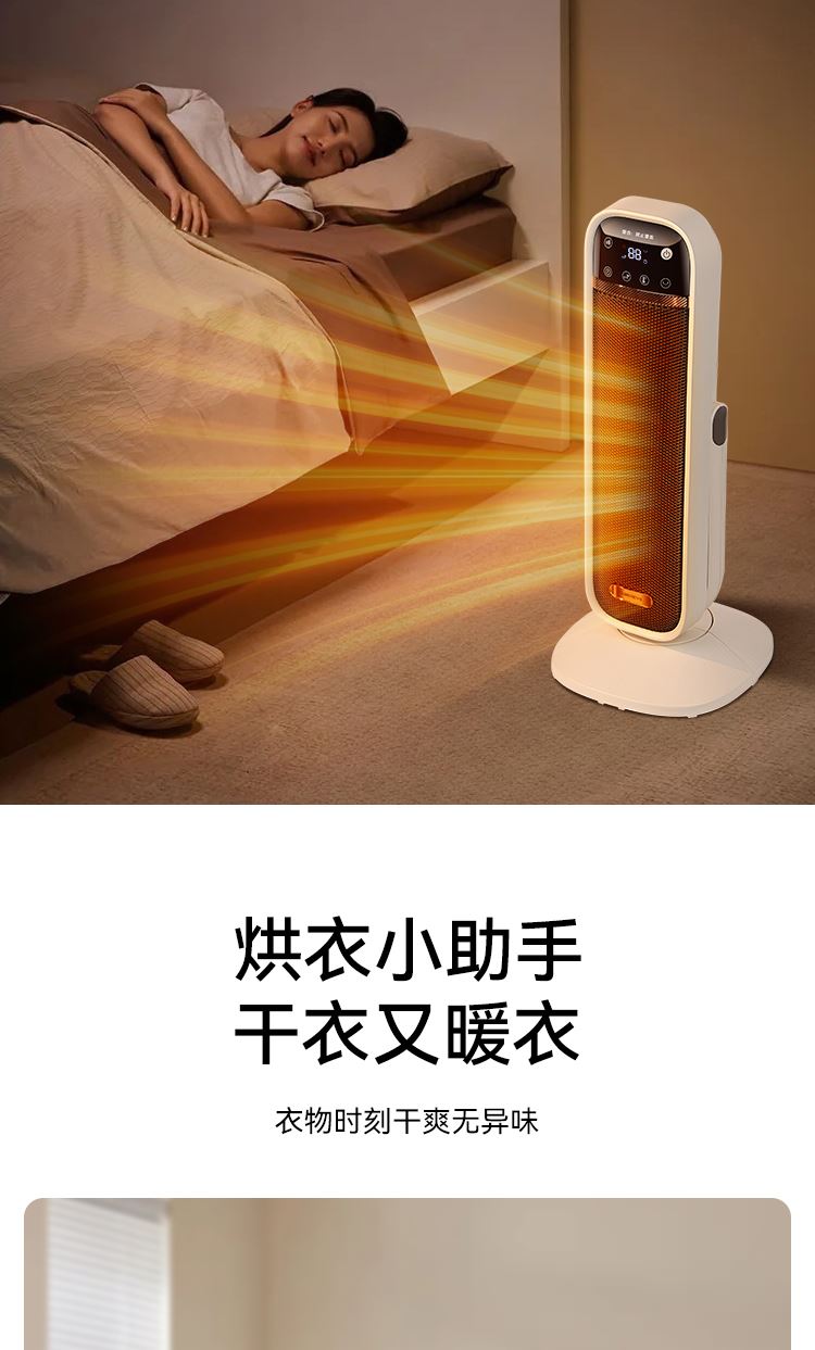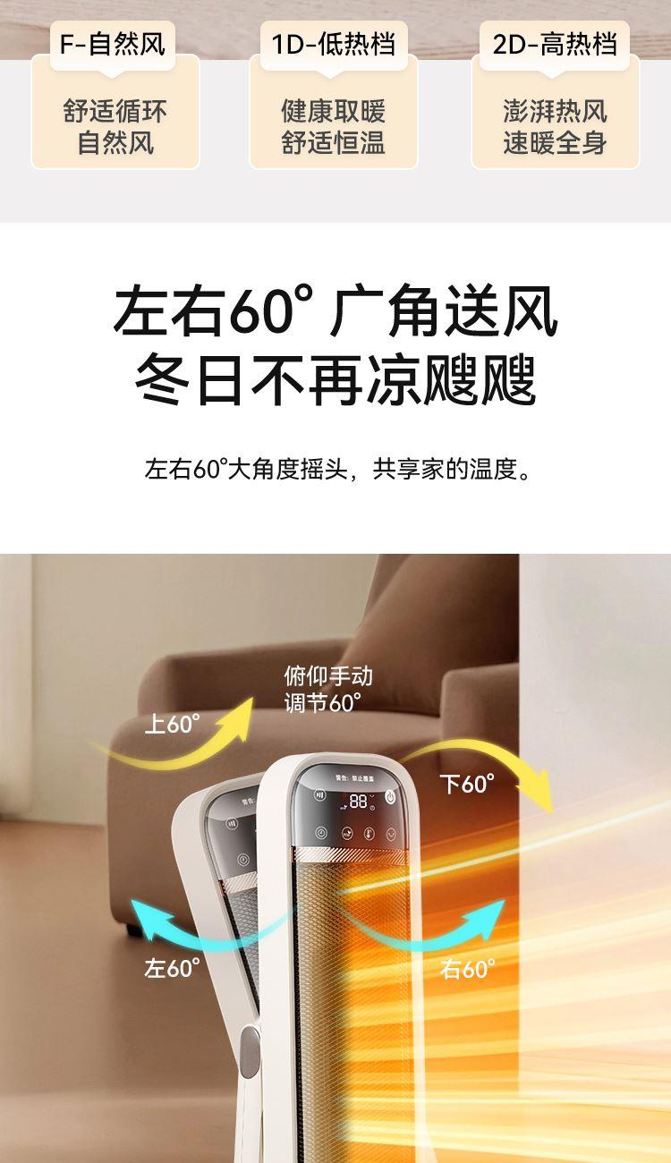 产品颜色:米白色 加热方式:石墨烯PTC陶瓷发热 额定电压:220V~ 额定频率:50Hz 摇头角度:俯仰上下60° 档位/功率:三档调节产品 净重:2.2kg 产品毛重:2.8kg 产品尺寸:262*263*636mm 包装尺寸:655*220*197mm ◁ 石墨烯速热科技,冬日取暖不等待 ◁ 远距遥控操作、语音控制、触控控制 ◁ 12H智能定时,轻音安心舒睡 ◁ 20-40°C广域调节,不同室温下都能找到理想温度 ◁ 60°大广角摇头,满足大空间多人取暖需求 ◁ 倾倒断电保护,家有宠物、孩童也能放心使用