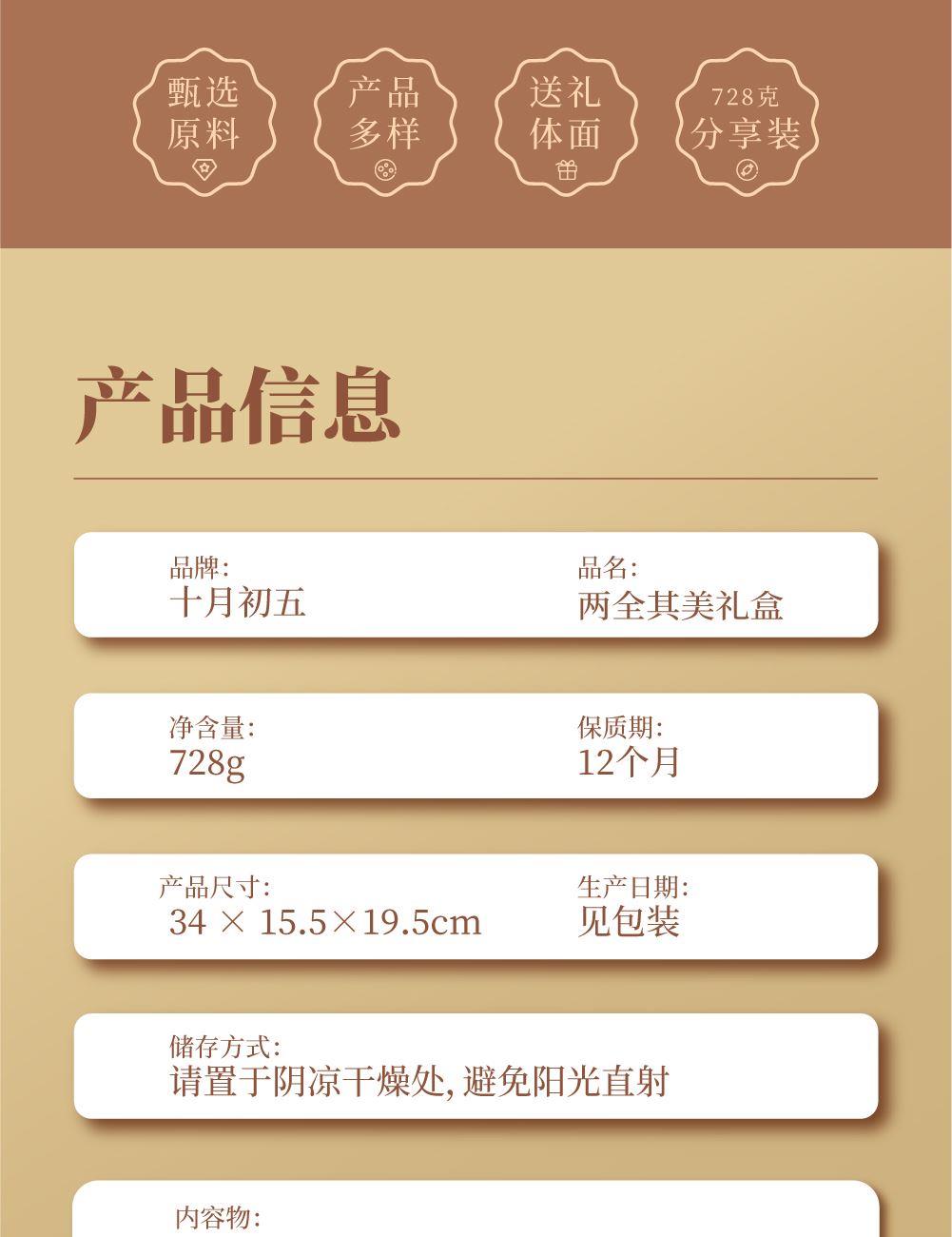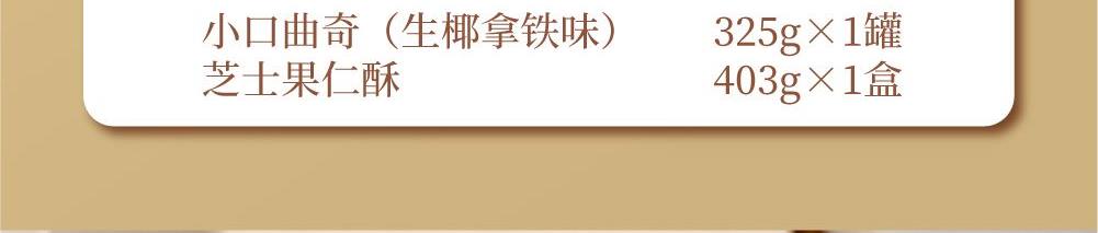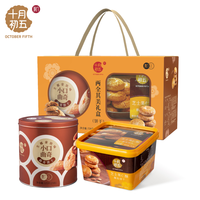 十月初五两全其美礼盒 净含量:728g 403g芝士果仁酥(储物盒)X1盒 325g小口曲奇(生椰拿铁味)X1罐