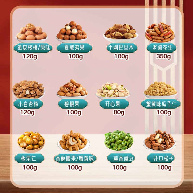 内容物:开心果/80g 碧根果/100g 开口松子/100g 夏威夷果/100g 手剥巴旦木/100g 香酥腰果/蟹黄味/100g 小白杏核/120g 纸皮核桃/120g 板栗仁/100g 老卤花生350g 蟹黄味瓜子仁/100g 蒜香豌豆/100g 礼盒尺寸:41*29*18cm 品类丰富,产品便携包装 购物不止于下单,服务长期保持 性价比极高,各价位都有,满足不同选择