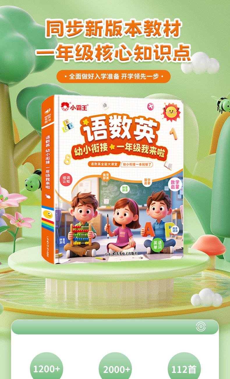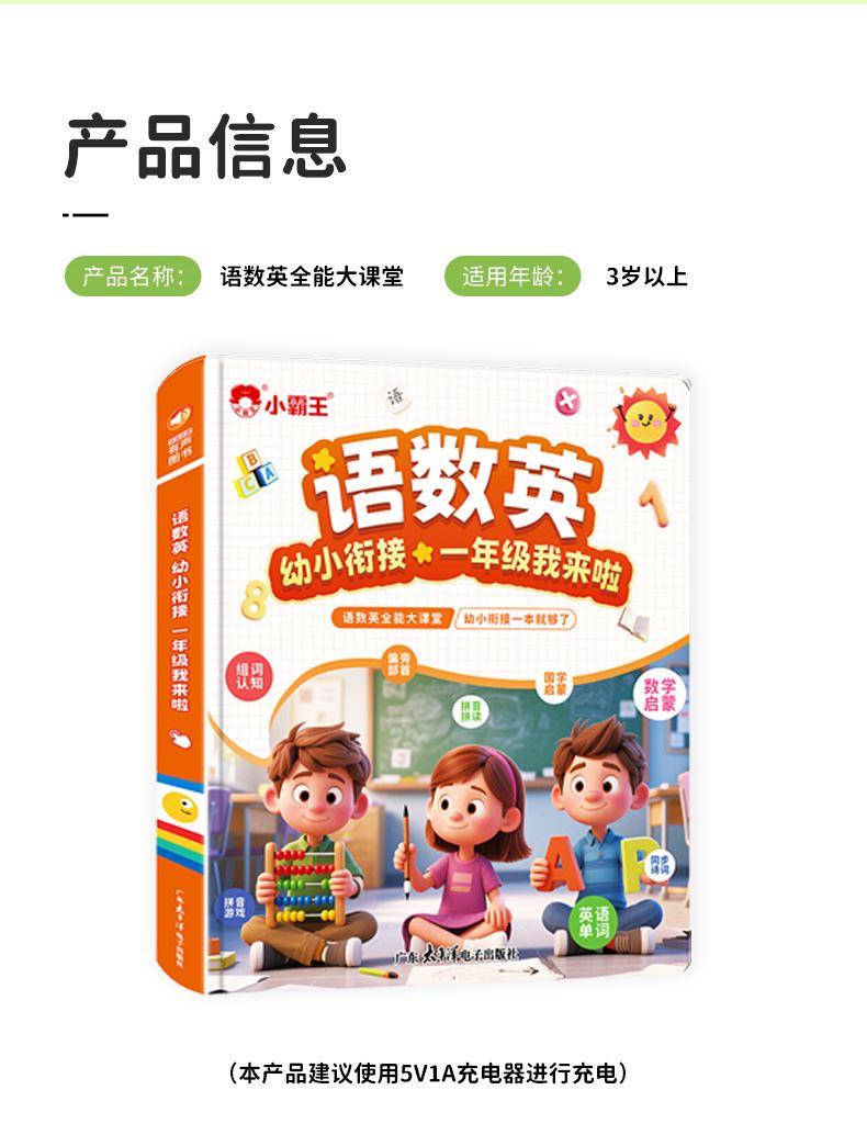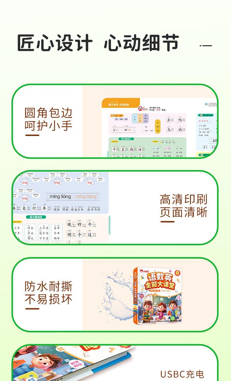 点读书+充电线+说明书+包装盒 1、幼小衔接的手指点读发声书,2000+识字,4000+组词,112首古诗 ,数学基础,英文字母,一本顶6本,合计12开面,59页,同步新版本教材一年级核心知识点,想听就听,提高孩子的学习兴趣和效率! 2、可增大音量,减小音量,根据宝宝的需要调整到适合的音量,呵护宝宝的听力发育。点读灵敏,真人录音发音清晰,想学哪里点哪里。每张都有自己的专属开关设计,避免出现串音,宝宝学习时更清晰,更专注。 3、厚实铜版纸,双面覆膜 ,不易撕烂,即防水又防污,并且还是环保油墨印刷,无异味,安全有保障。圆角书页切边,不割手,避免锐角伤害。 4、USB数据线充电,有3C认证,满电可连续使用4小时以上,让宝宝随地安心学习