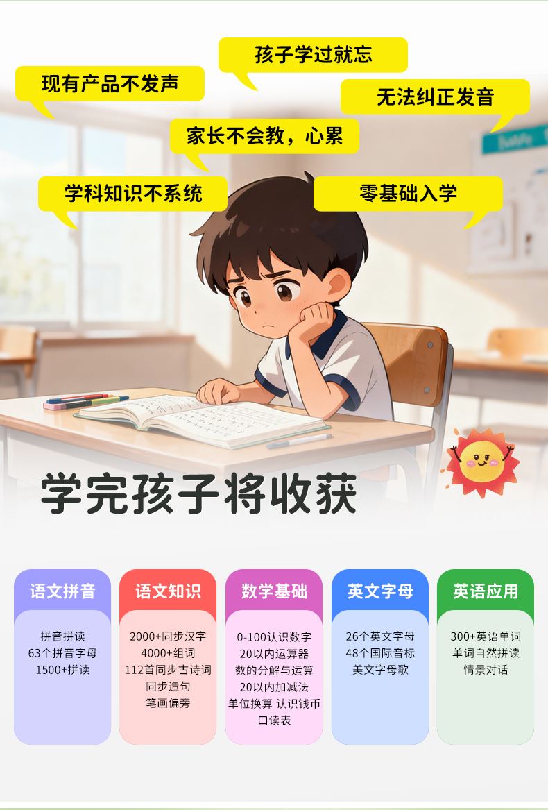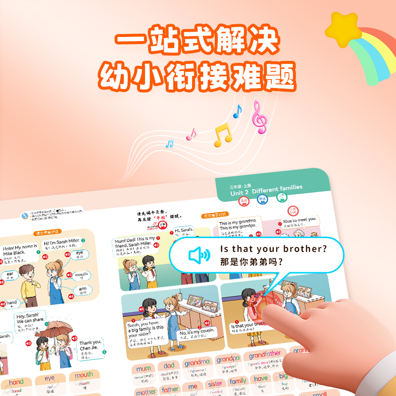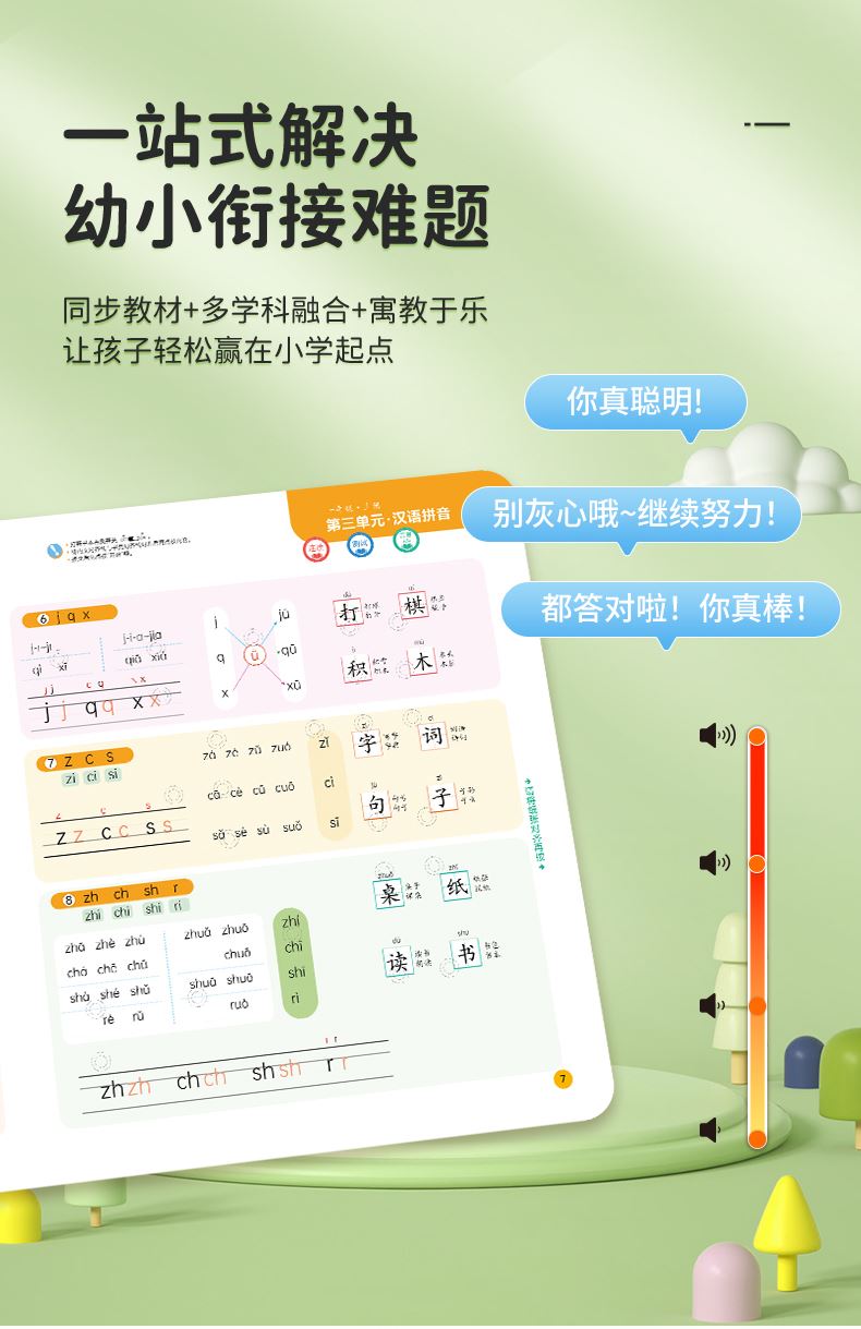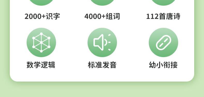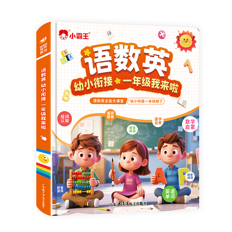 点读书+充电线+说明书+包装盒 1、幼小衔接的手指点读发声书,2000+识字,4000+组词,112首古诗 ,数学基础,英文字母,一本顶6本,合计12开面,59页,同步新版本教材一年级核心知识点,想听就听,提高孩子的学习兴趣和效率! 2、可增大音量,减小音量,根据宝宝的需要调整到适合的音量,呵护宝宝的听力发育。点读灵敏,真人录音发音清晰,想学哪里点哪里。每张都有自己的专属开关设计,避免出现串音,宝宝学习时更清晰,更专注。 3、厚实铜版纸,双面覆膜 ,不易撕烂,即防水又防污,并且还是环保油墨印刷,无异味,安全有保障。圆角书页切边,不割手,避免锐角伤害。 4、USB数据线充电,有3C认证,满电可连续使用4小时以上,让宝宝随地安心学习