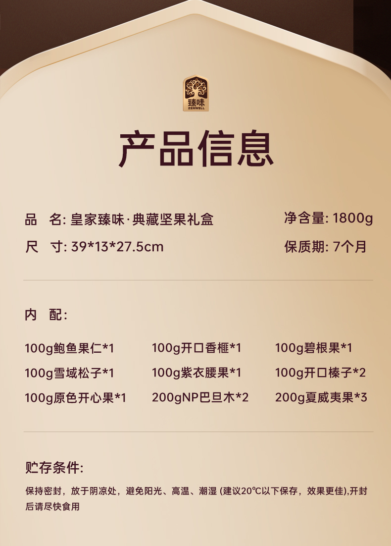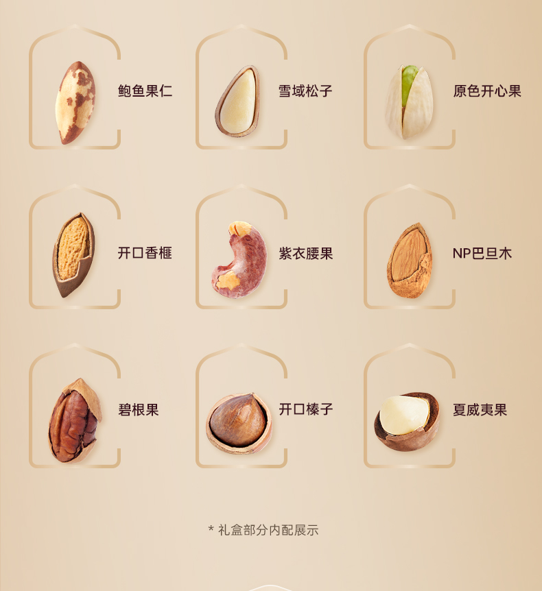 100g鲍鱼果仁*1 100g雪域松子*1 100g原色开心果*1 100g开口香榧*1 100g紫衣腰果*1 200gNP巴旦木*2 100g碧根果*1 100g开口榛子*2 200g夏威夷果*3 手提箱式盒型,搭配皮革装饰与金属扣件,重工工艺,复古风与轻奢感拉满; 净含量:1800g,内含9种纯坚果,大克重份量足,还可作为收纳箱二次利用,实用与美观兼具。