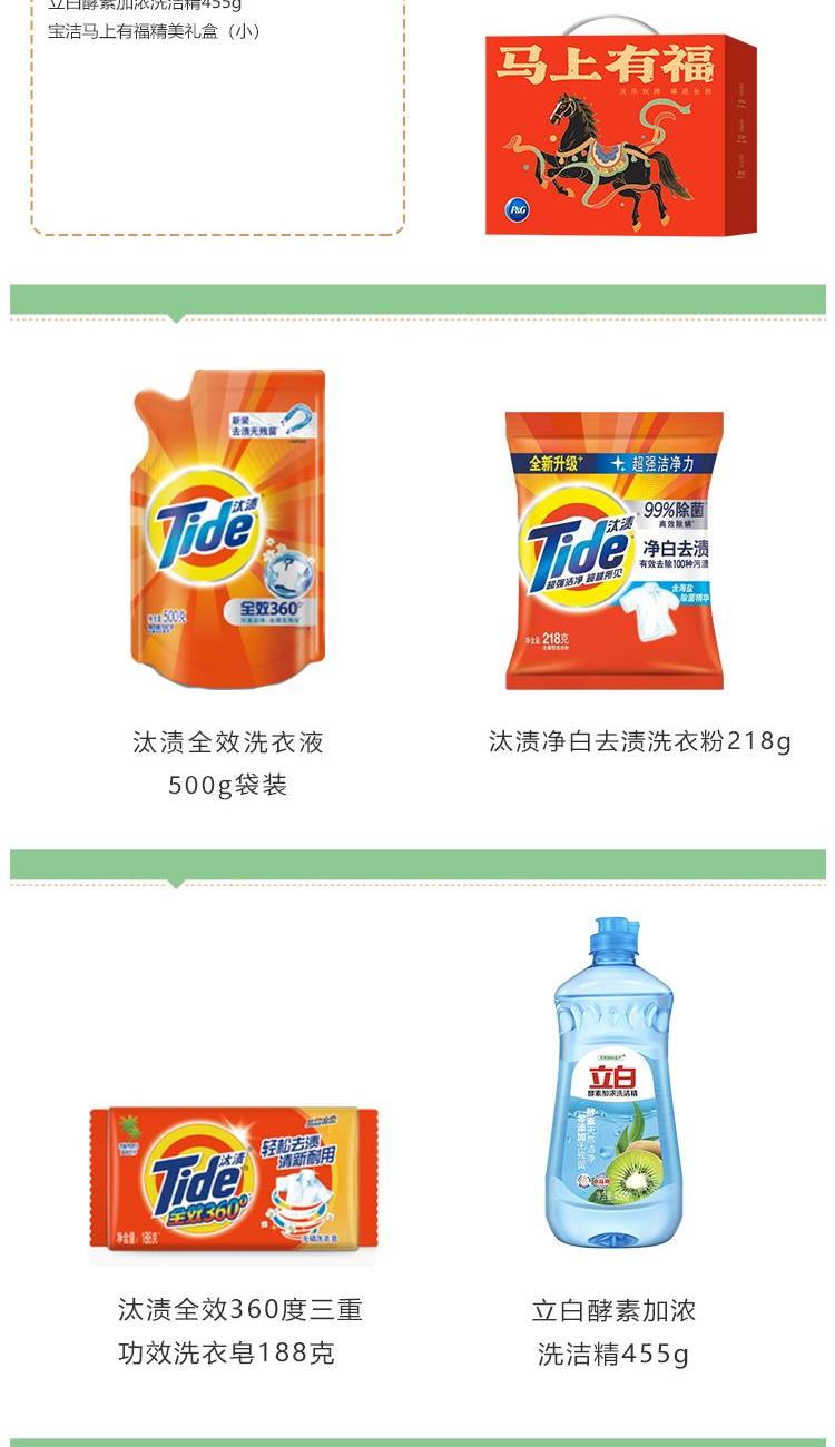 汰渍全效洗衣液500G袋装 汰渍净白去渍洗衣粉218g 汰渍全效360度三重功效洗衣皂188克 立白超威强效洁厕净500g 立白酵素加浓洗洁精455g 宝洁马上有福精美礼盒(小)