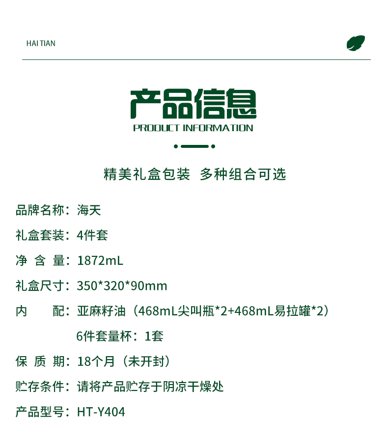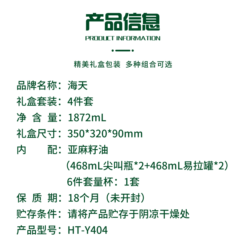 净含量:1872mL 内配:亚麻籽油(468mL尖叫瓶*2+468mL易拉罐*2) 6件套量杯*1 礼盒尺寸:350*320*90mm 推荐理由:员工福利、积分兑换、项目招标 物理低温冷榨 冷烹两用 油体清澈 味道清香 头道初榨 0胆固 醇 亚麻酸大于52%