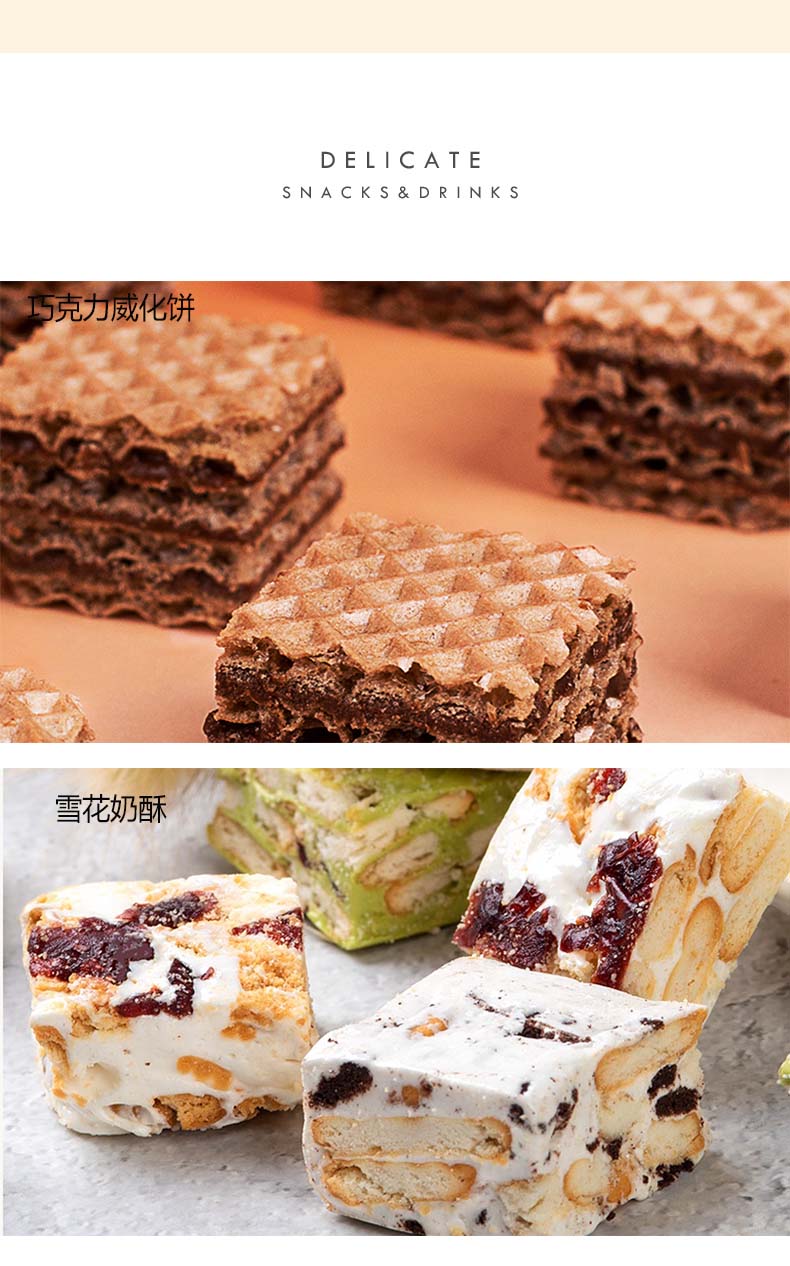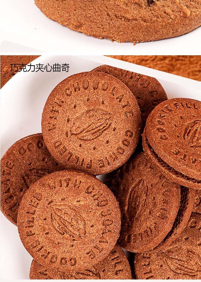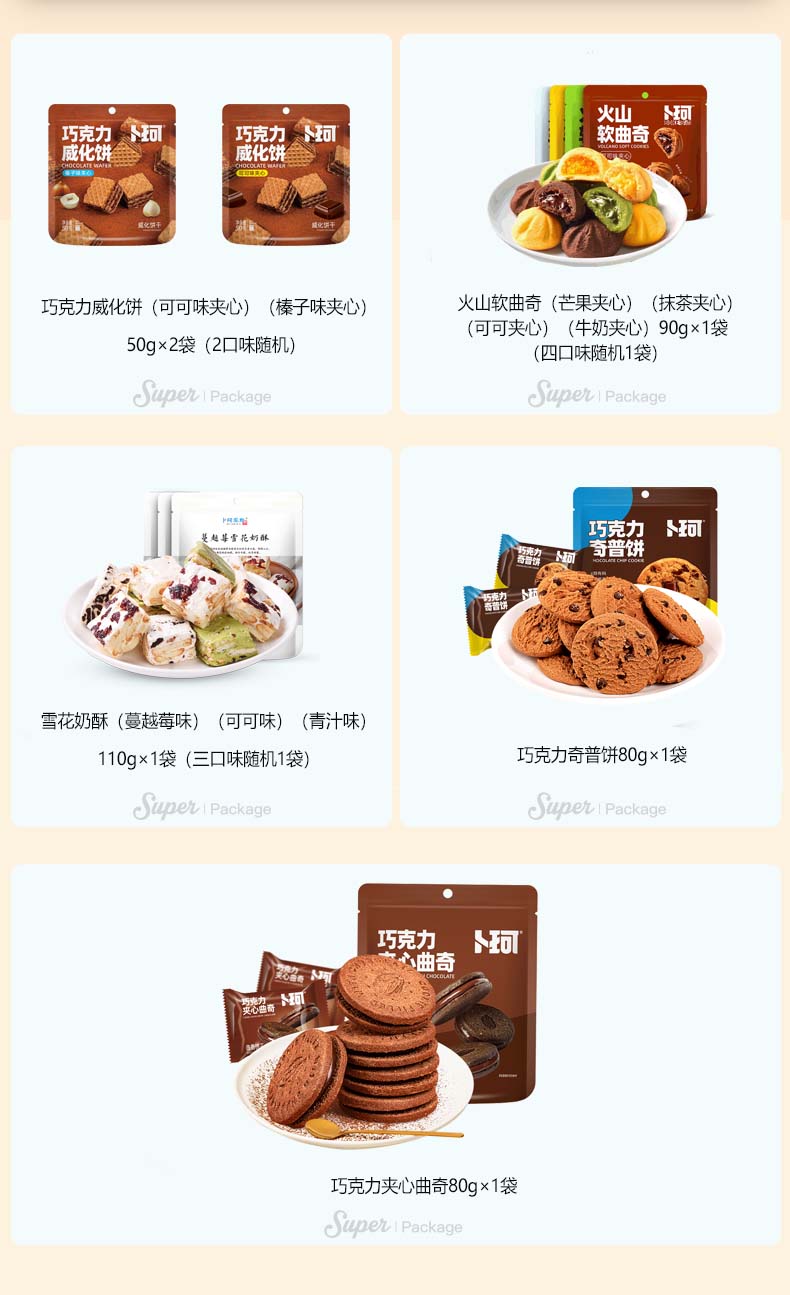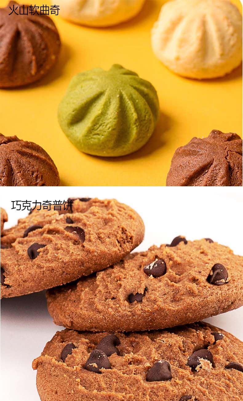 克重:460克 内配: 1、巧克力威化饼(可可味夹心)(榛子味夹心)50g×2袋(2口味随机) 2、火山软曲奇(芒果夹心)(抹茶夹心)(可可夹心)(牛奶夹心)90g×1袋(四口味随机) 3、雪花奶酥(蔓越莓味)(可可味)(青汁味)110g×1袋(三口味随机) 4、巧克力奇普饼80g×1袋 5、巧克力夹心曲奇80g×1袋 礼盒规格:350*240*145mm 保质期:9月