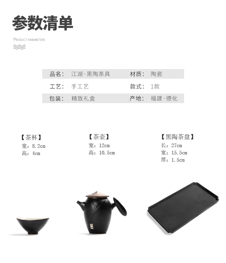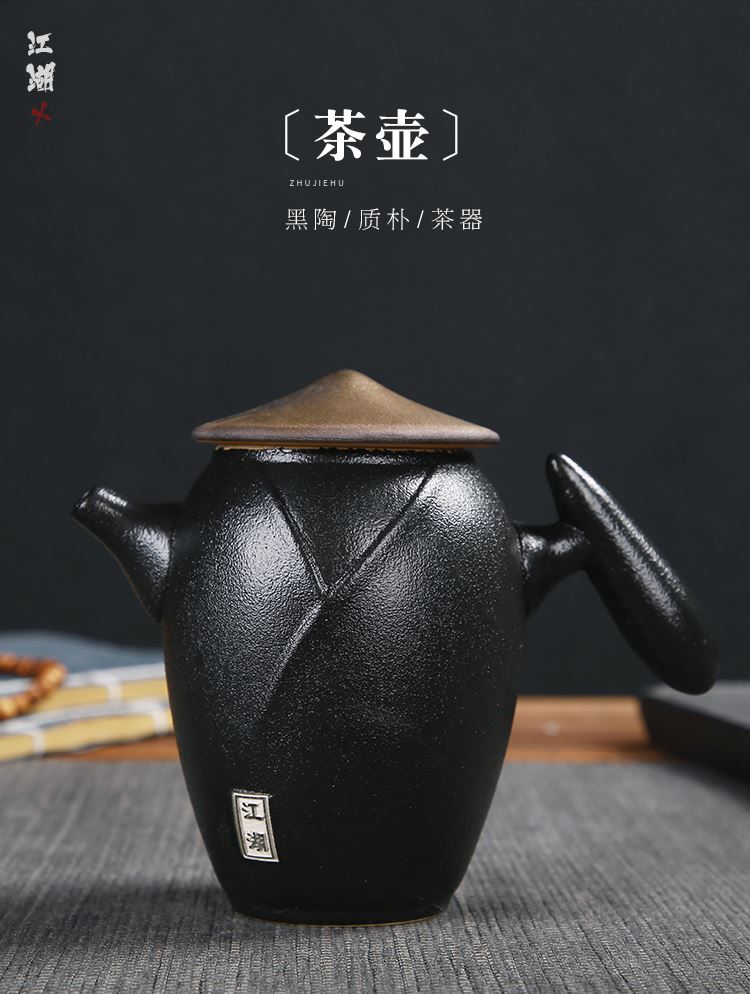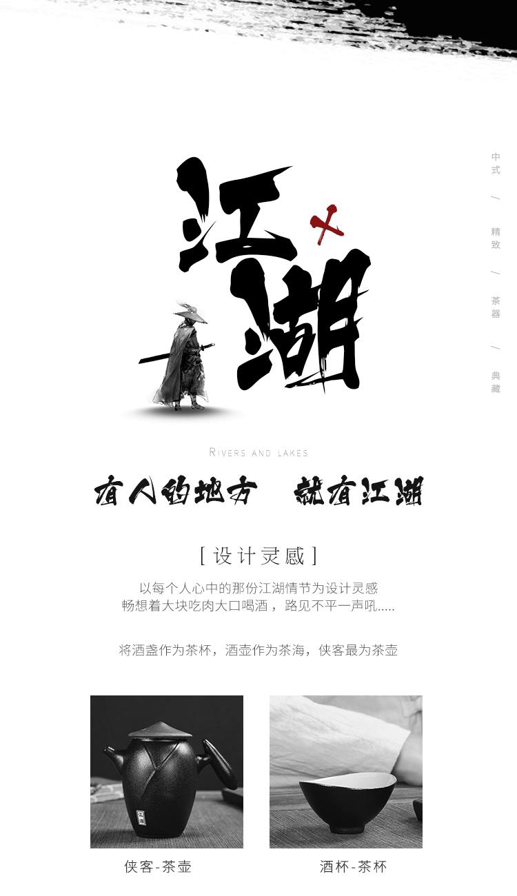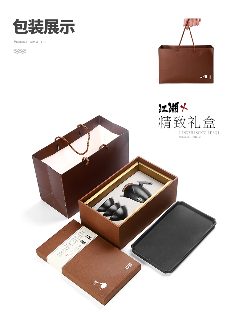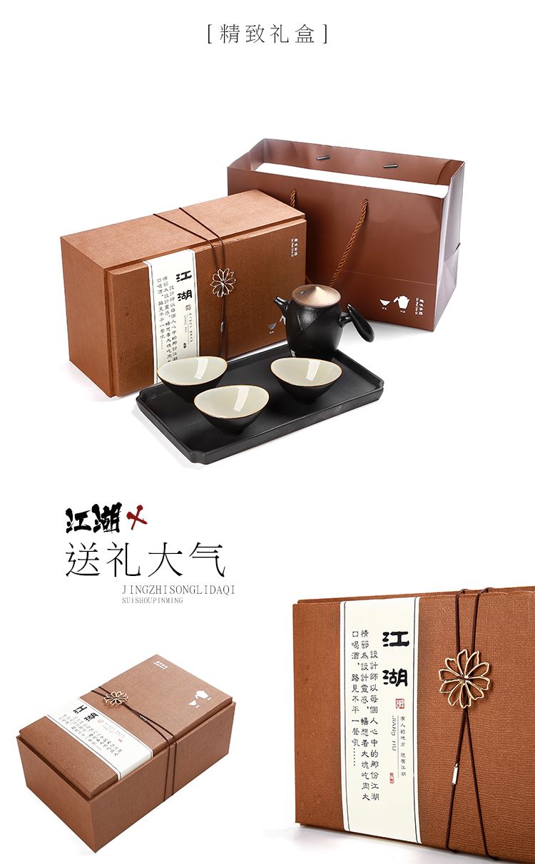 《江湖-五件套黑陶干泡茶具套装》 中国风产品符合当下热潮,设计以侠客为器型,体现江湖主题。每一个人都是单枪匹马闯荡这个世界,带着七分豪气三分胆气。每个人心中都有那份大口吃肉大口喝酒的江湖情怀。 材质:黑陶、陶瓷 配置:茶壶*1+茶盘*1+茶杯*3+礼盒+手提袋