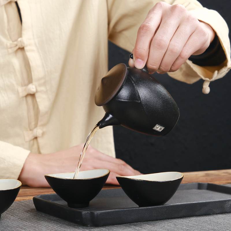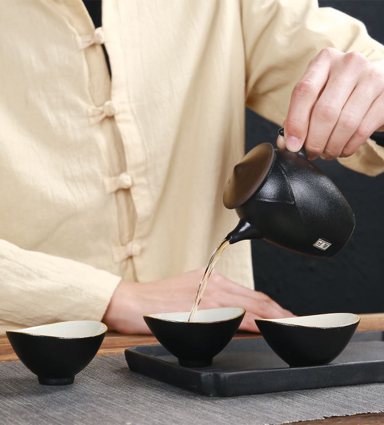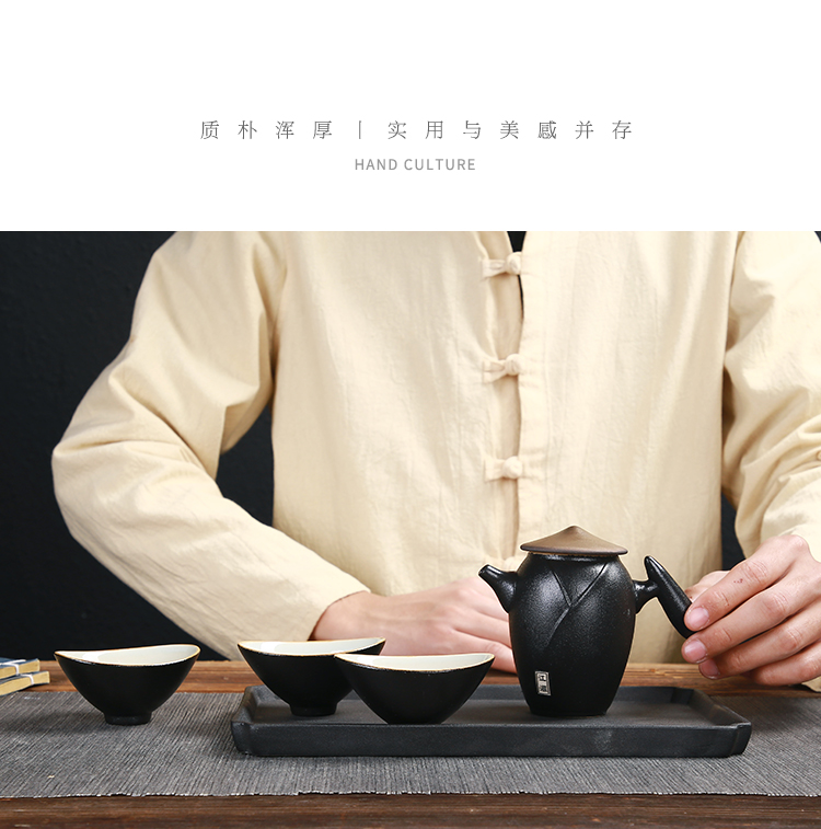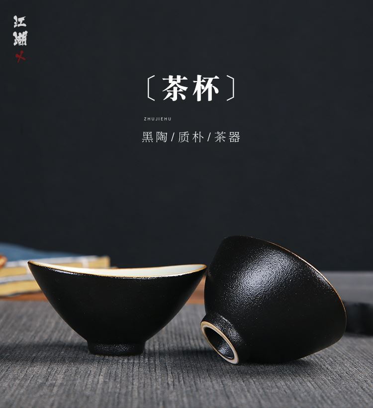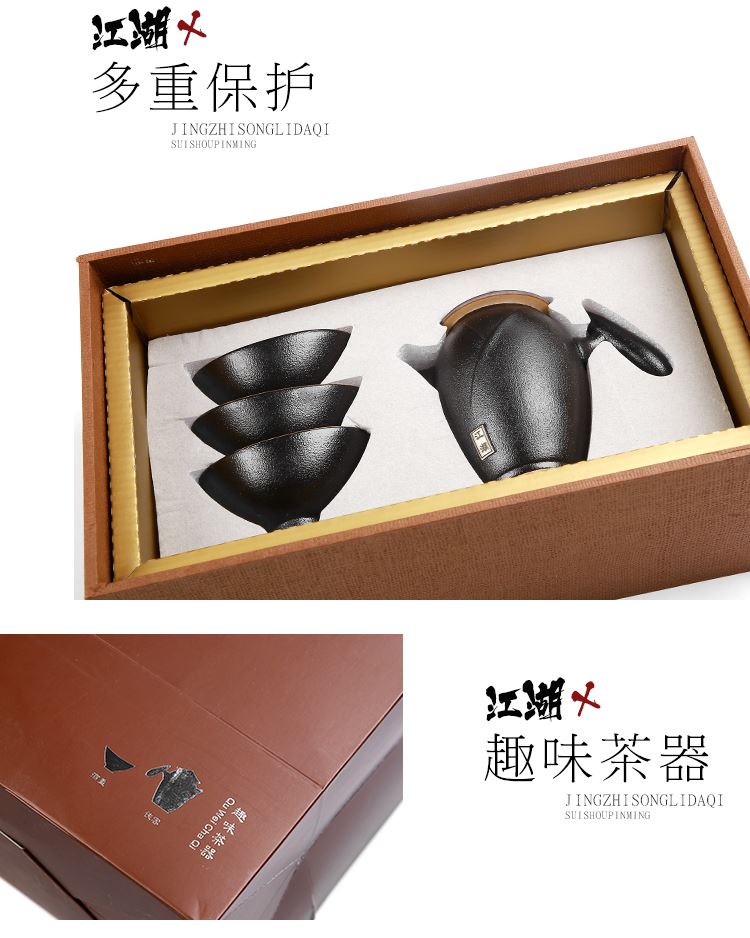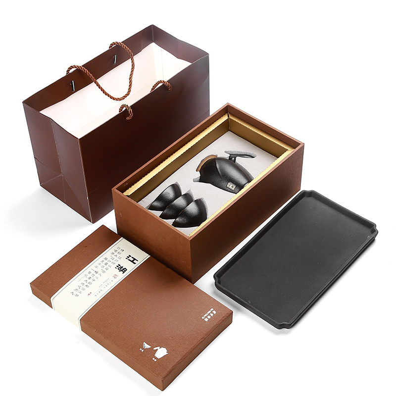 《江湖-五件套黑陶干泡茶具套装》 中国风产品符合当下热潮,设计以侠客为器型,体现江湖主题。每一个人都是单枪匹马闯荡这个世界,带着七分豪气三分胆气。每个人心中都有那份大口吃肉大口喝酒的江湖情怀。 材质:黑陶、陶瓷 配置:茶壶*1+茶盘*1+茶杯*3+礼盒+手提袋