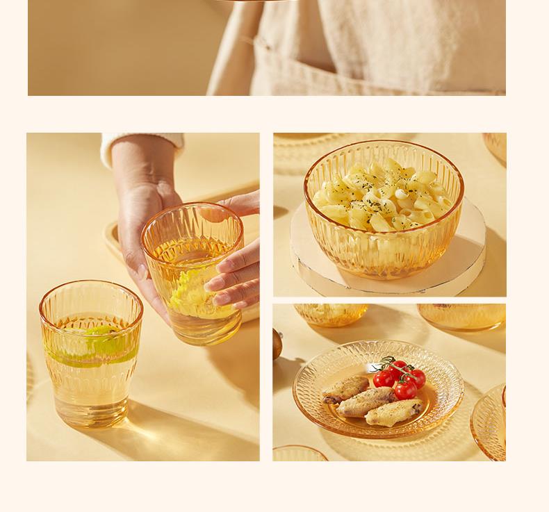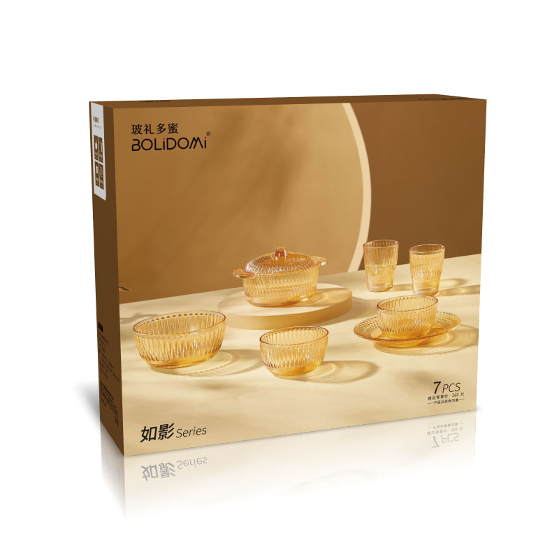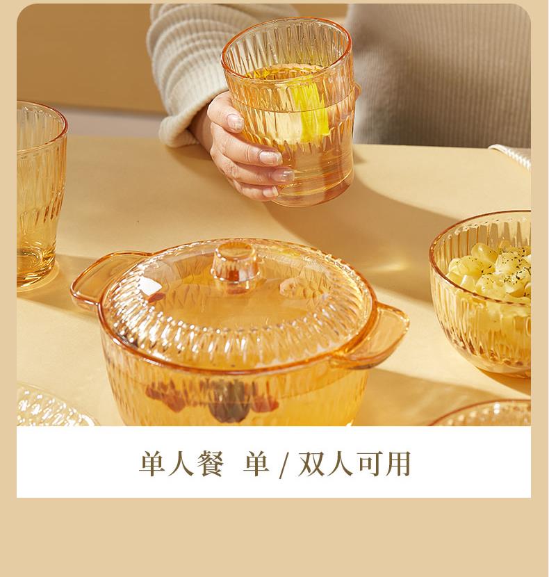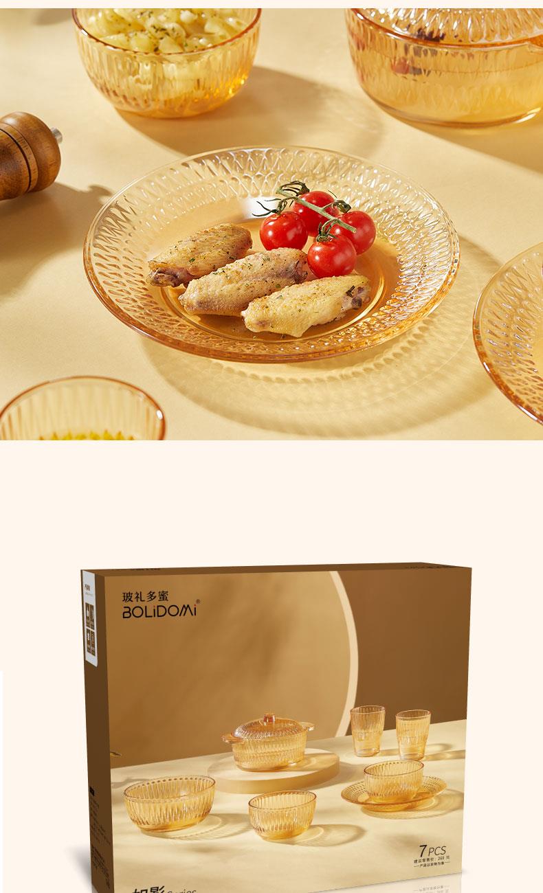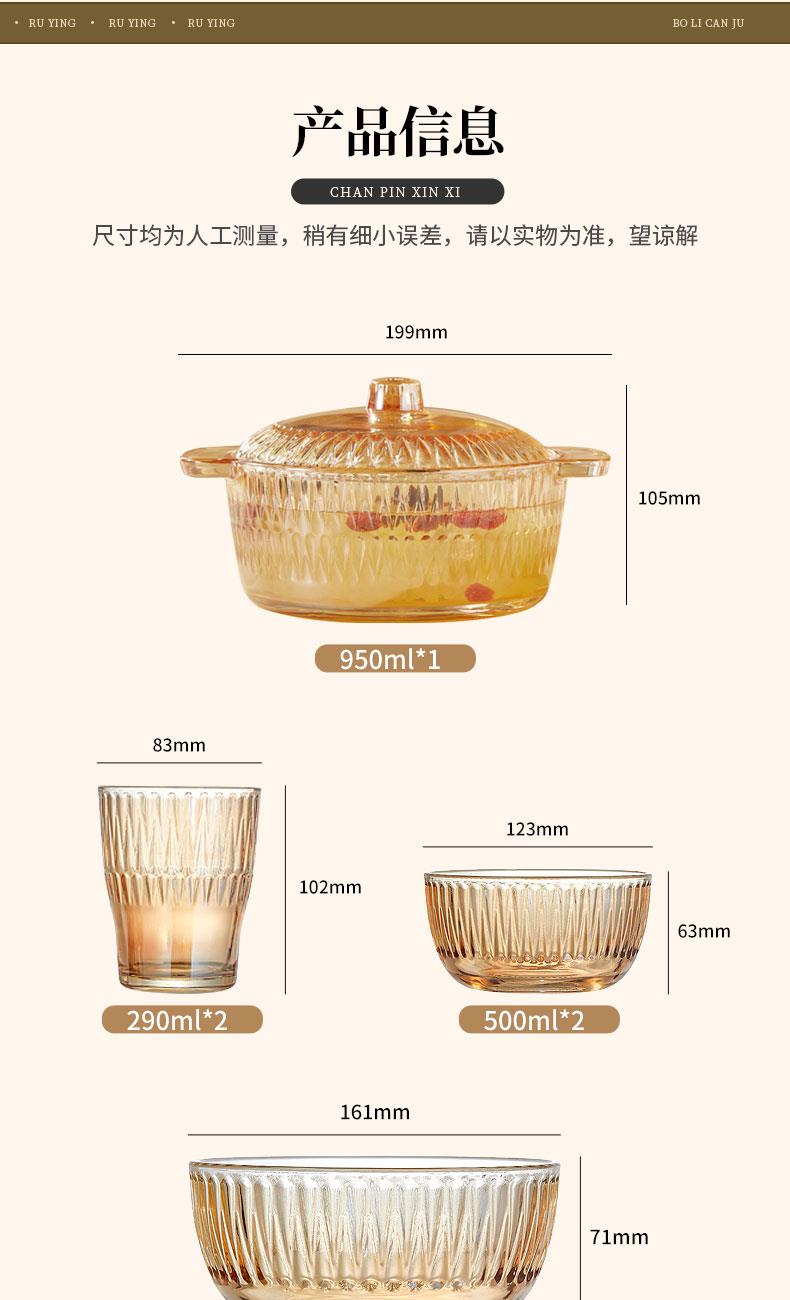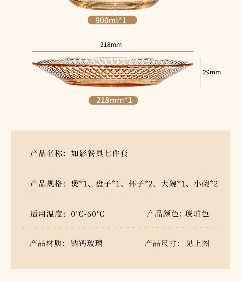 【组合】:水晶煲950ml*1、小碗500ml*2、水杯290ml*2 大碗900ml*1、盘子218mm*1 【材质】:钠钙玻璃 0~60℃ 【彩盒尺寸】:416*112*361mm 【外箱尺寸】:70*43*38cm 【毛重】: 15KG 【69码】: 6972526481684 产品卖点: 1、经过精心设计,采用优雅的琥珀色调,为您的餐桌增添一抹温暖的色彩。无论是日常用餐还是特殊场合,都能彰显出不凡的品味。 2、适用于冷饮、甜品等各类食物, 无论是家庭聚餐还是朋友聚会,都能轻松应对各种需求。 3、所有产品均采用环保材料制作而成,不含任何有害物质,让您吃得放心、用得安心。