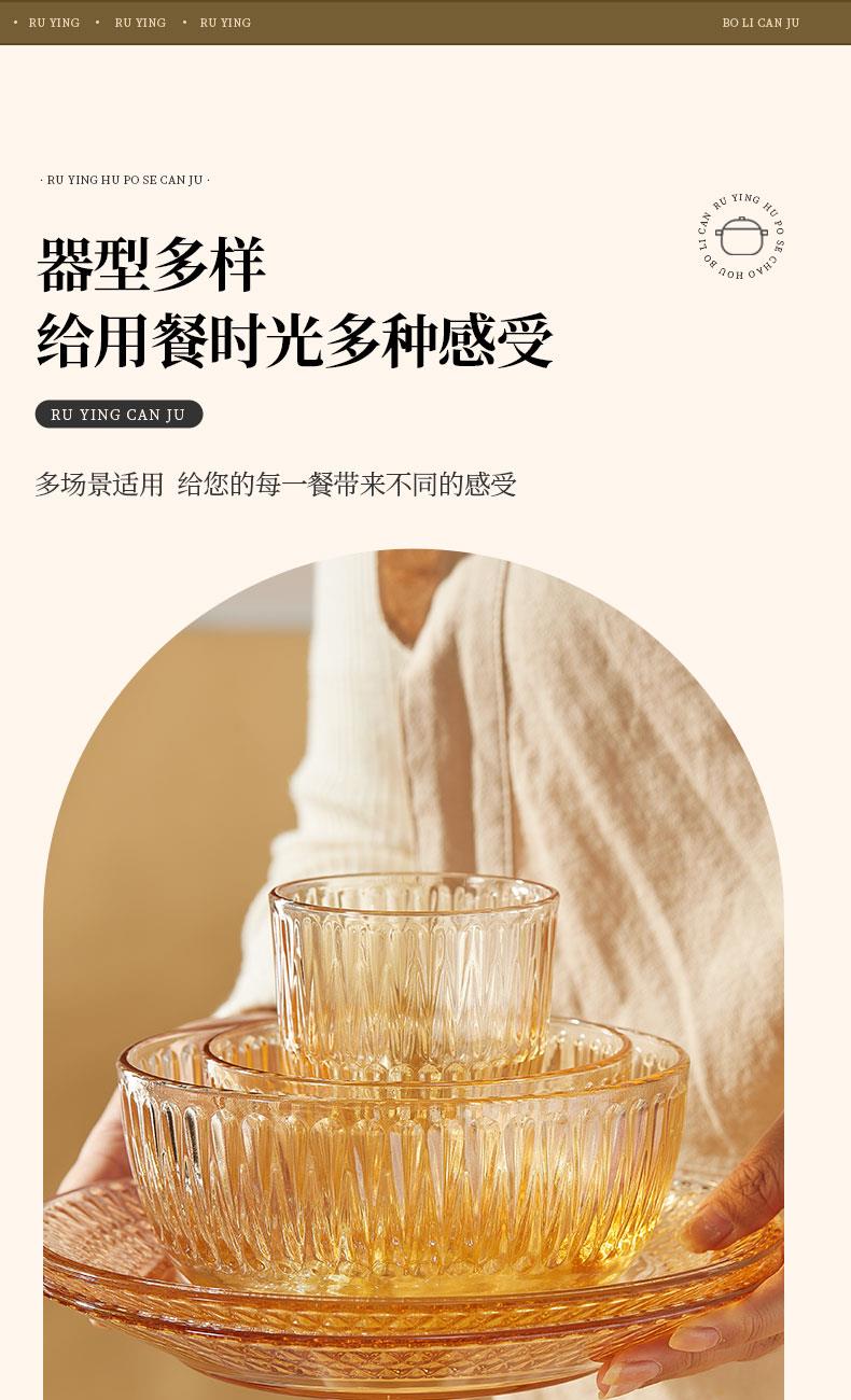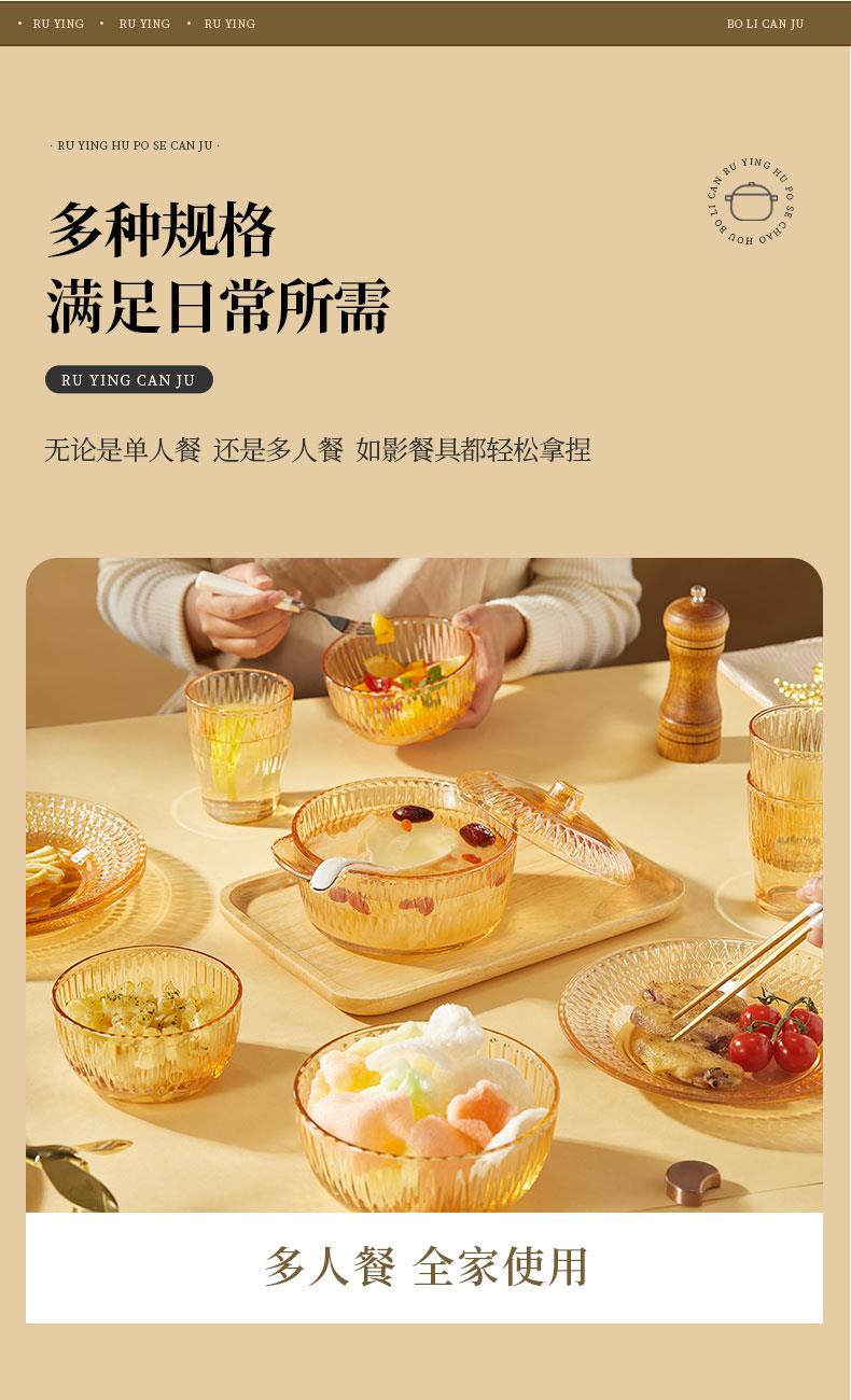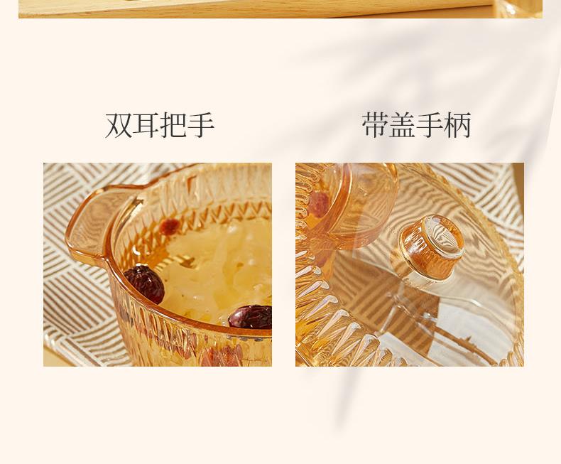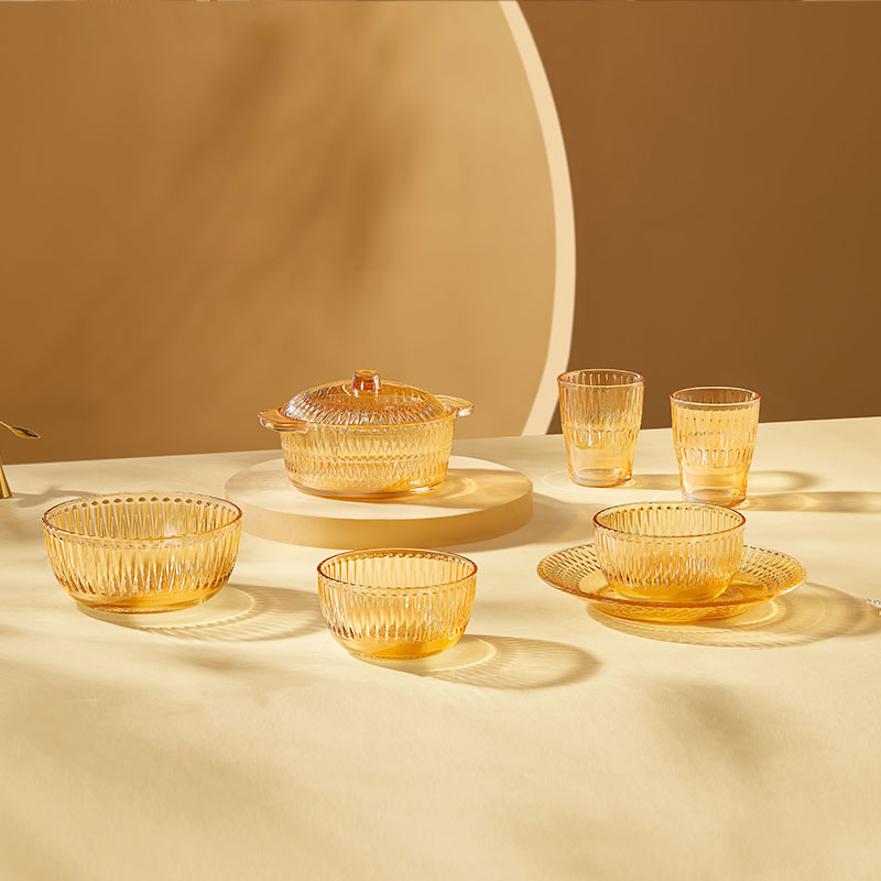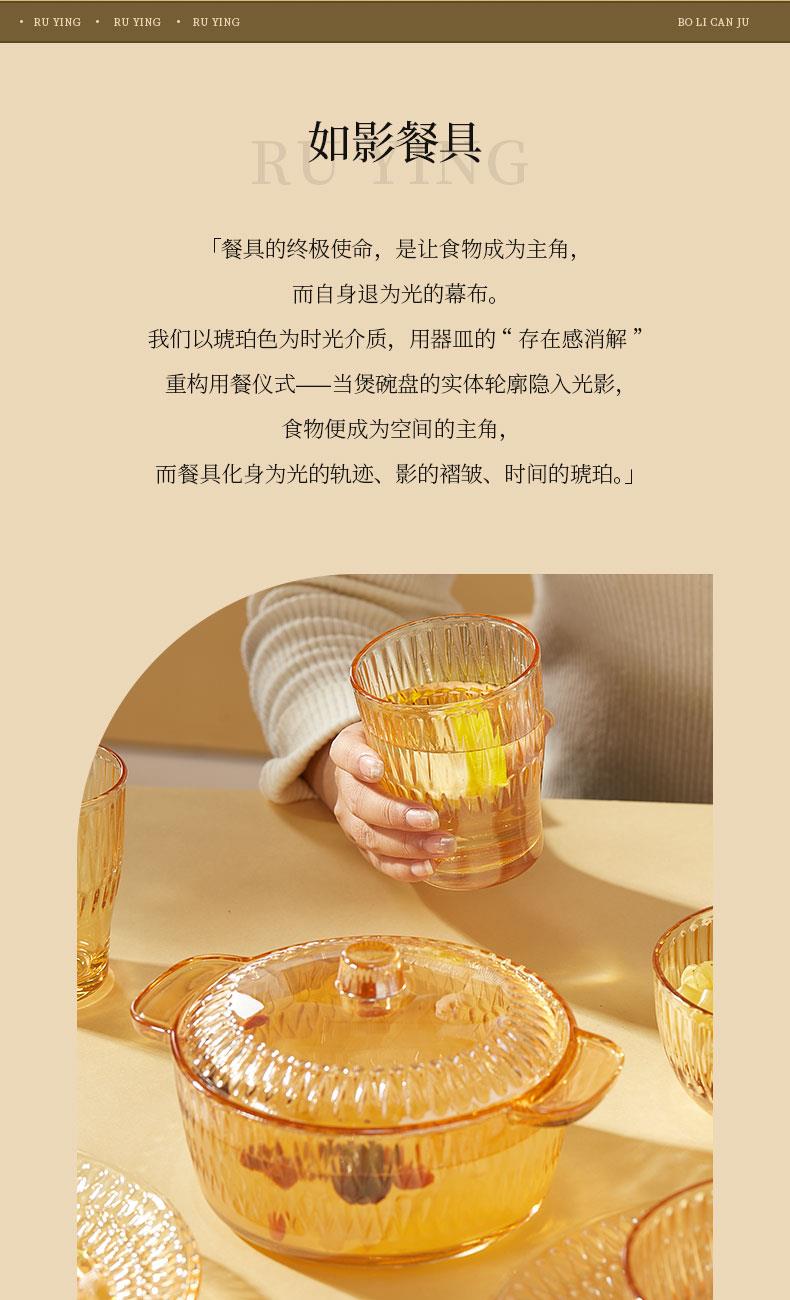 【组合】:水晶煲950ml*1、小碗500ml*2、水杯290ml*2 大碗900ml*1、盘子218mm*1 【材质】:钠钙玻璃 0~60℃ 【彩盒尺寸】:416*112*361mm 【外箱尺寸】:70*43*38cm 【毛重】: 15KG 【69码】: 6972526481684 产品卖点: 1、经过精心设计,采用优雅的琥珀色调,为您的餐桌增添一抹温暖的色彩。无论是日常用餐还是特殊场合,都能彰显出不凡的品味。 2、适用于冷饮、甜品等各类食物, 无论是家庭聚餐还是朋友聚会,都能轻松应对各种需求。 3、所有产品均采用环保材料制作而成,不含任何有害物质,让您吃得放心、用得安心。