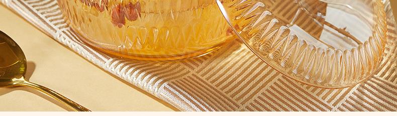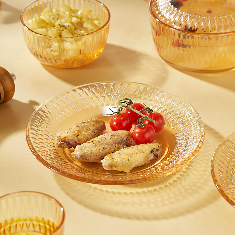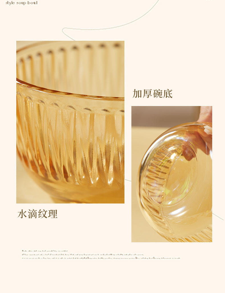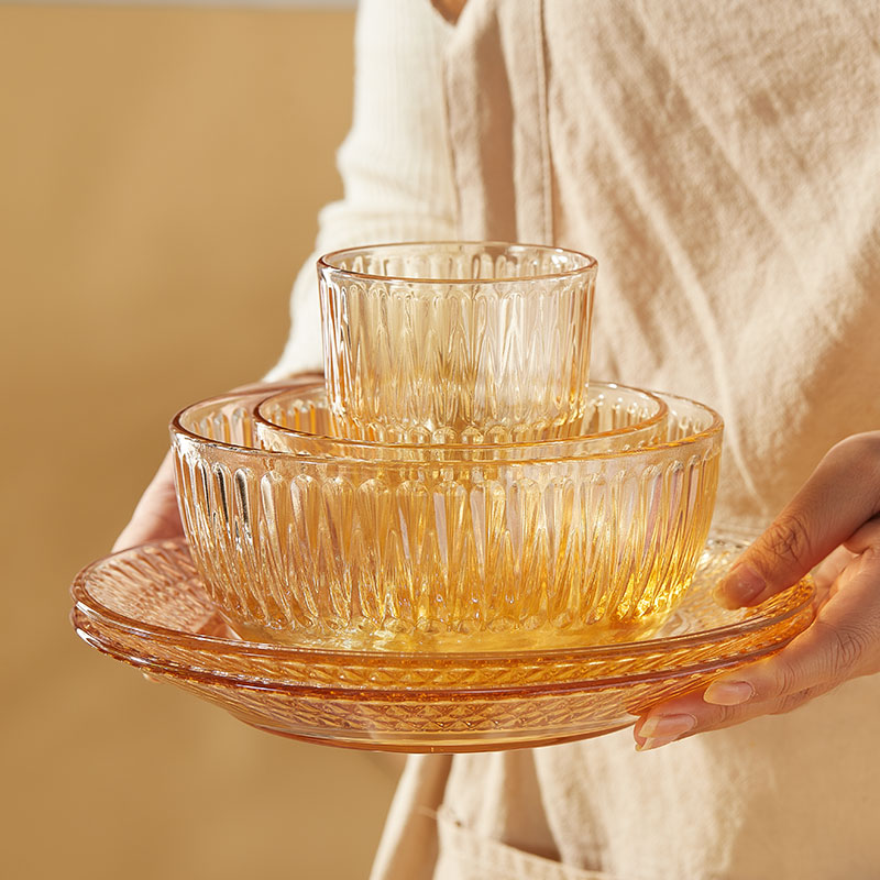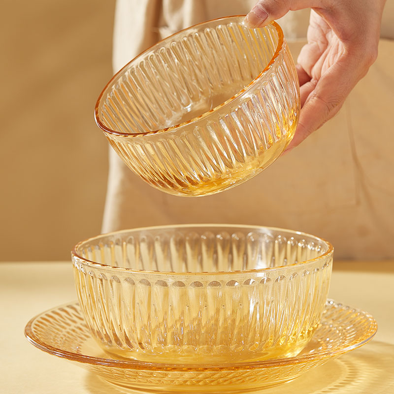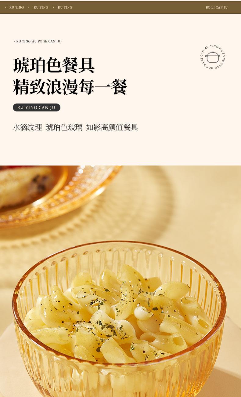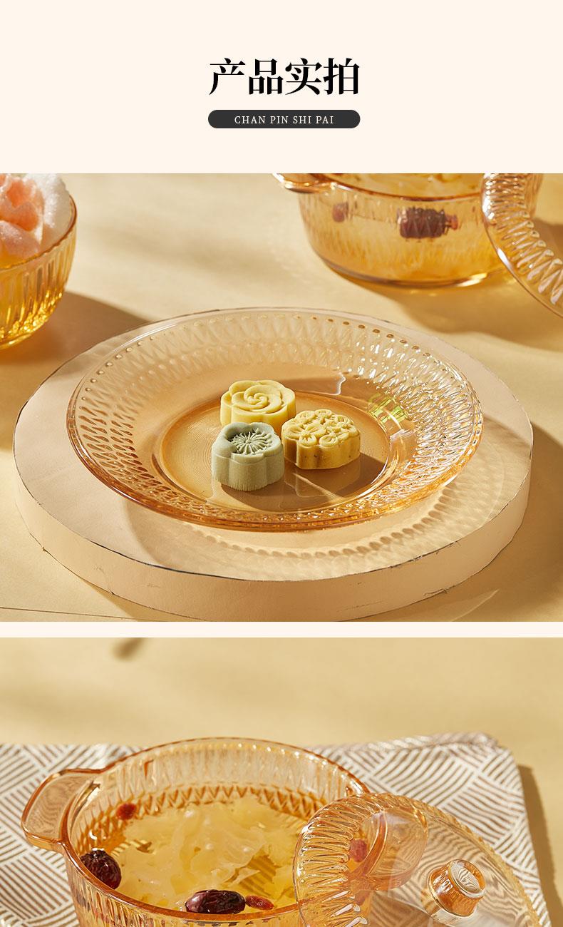 【组合】:水晶煲950ml*1、小碗500ml*2、水杯290ml*2 大碗900ml*1、盘子218mm*1 【材质】:钠钙玻璃 0~60℃ 【彩盒尺寸】:416*112*361mm 【外箱尺寸】:70*43*38cm 【毛重】: 15KG 【69码】: 6972526481684 产品卖点: 1、经过精心设计,采用优雅的琥珀色调,为您的餐桌增添一抹温暖的色彩。无论是日常用餐还是特殊场合,都能彰显出不凡的品味。 2、适用于冷饮、甜品等各类食物, 无论是家庭聚餐还是朋友聚会,都能轻松应对各种需求。 3、所有产品均采用环保材料制作而成,不含任何有害物质,让您吃得放心、用得安心。
