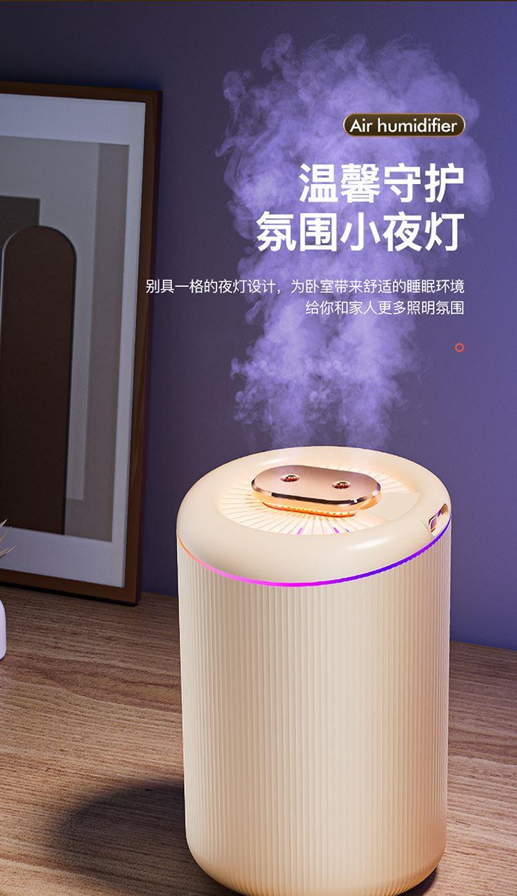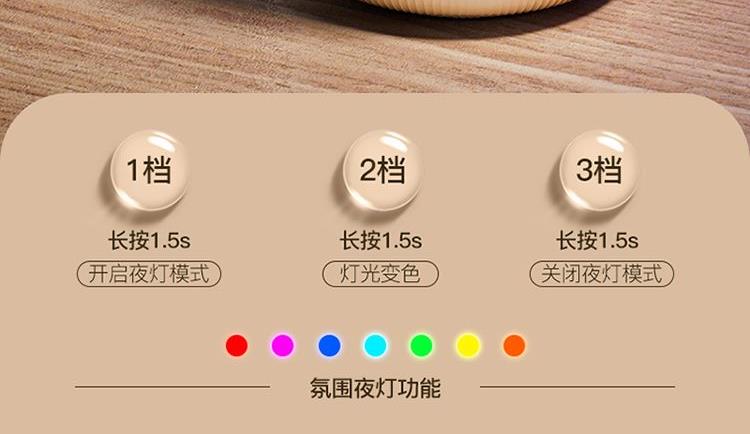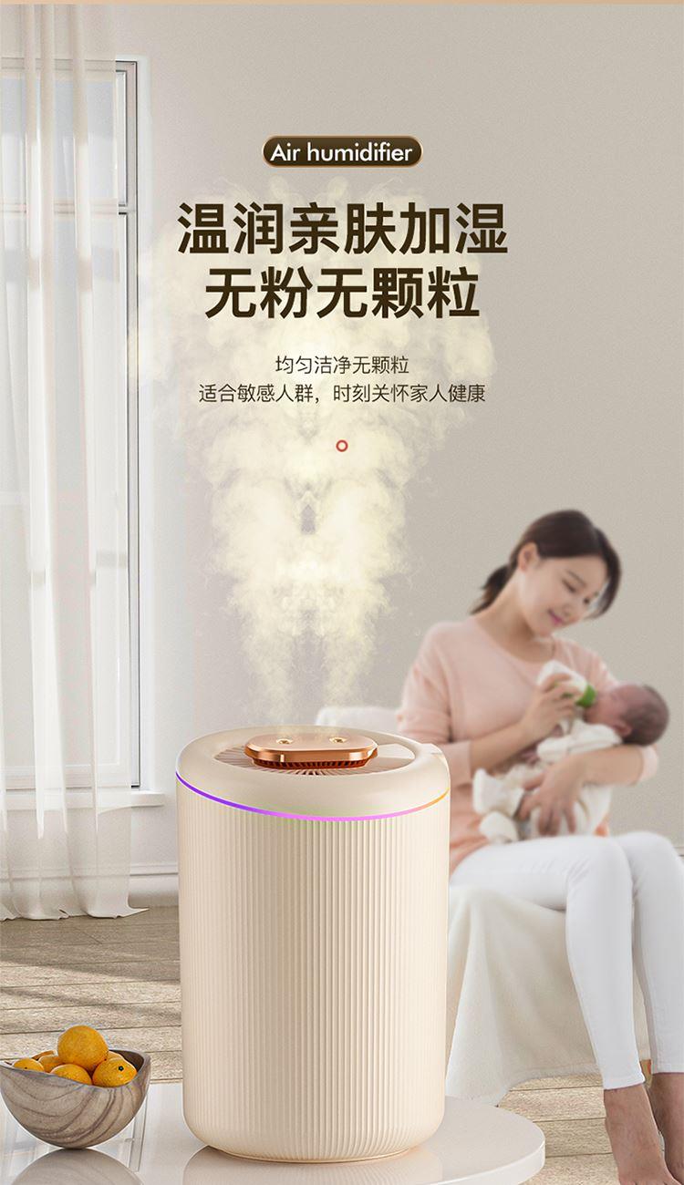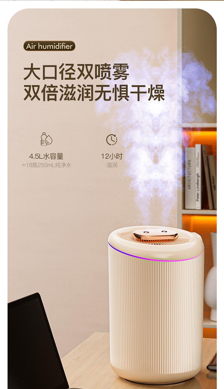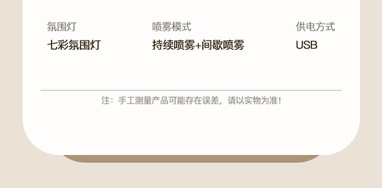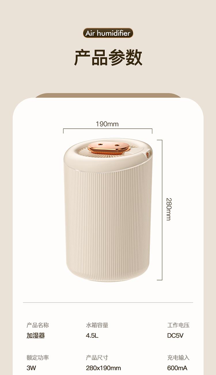 额定功率:4.5W 额定容量:4.5L 产品毛重:0.8kg/台 产品接口:USB接口 产品颜色:米白色 产品尺寸:280x190mm(mm) 包装清单:主机、充电线 主要材质:PP聚丙烯 1.4.5L大容量,母婴适用,轻音低噪运行 2.全新智能恒湿,纳米级细雾,均匀大雾量 3.自动断电保护,七彩呼吸氛围灯,营造浪温氛围 4.两种喷头调节,满足不同湿度需求,呵护家人健康呼吸