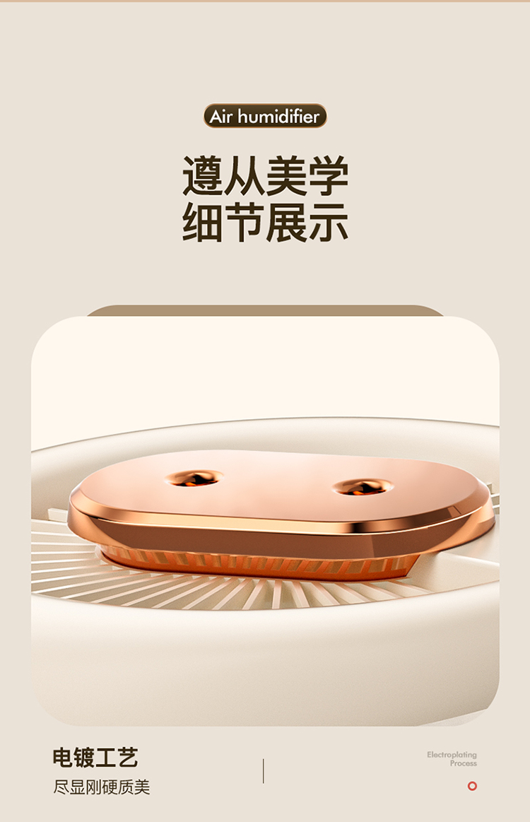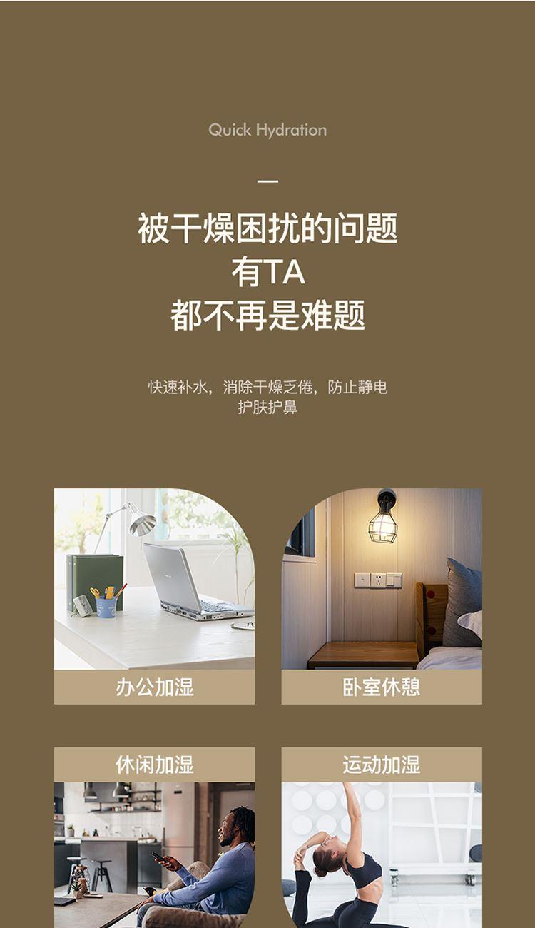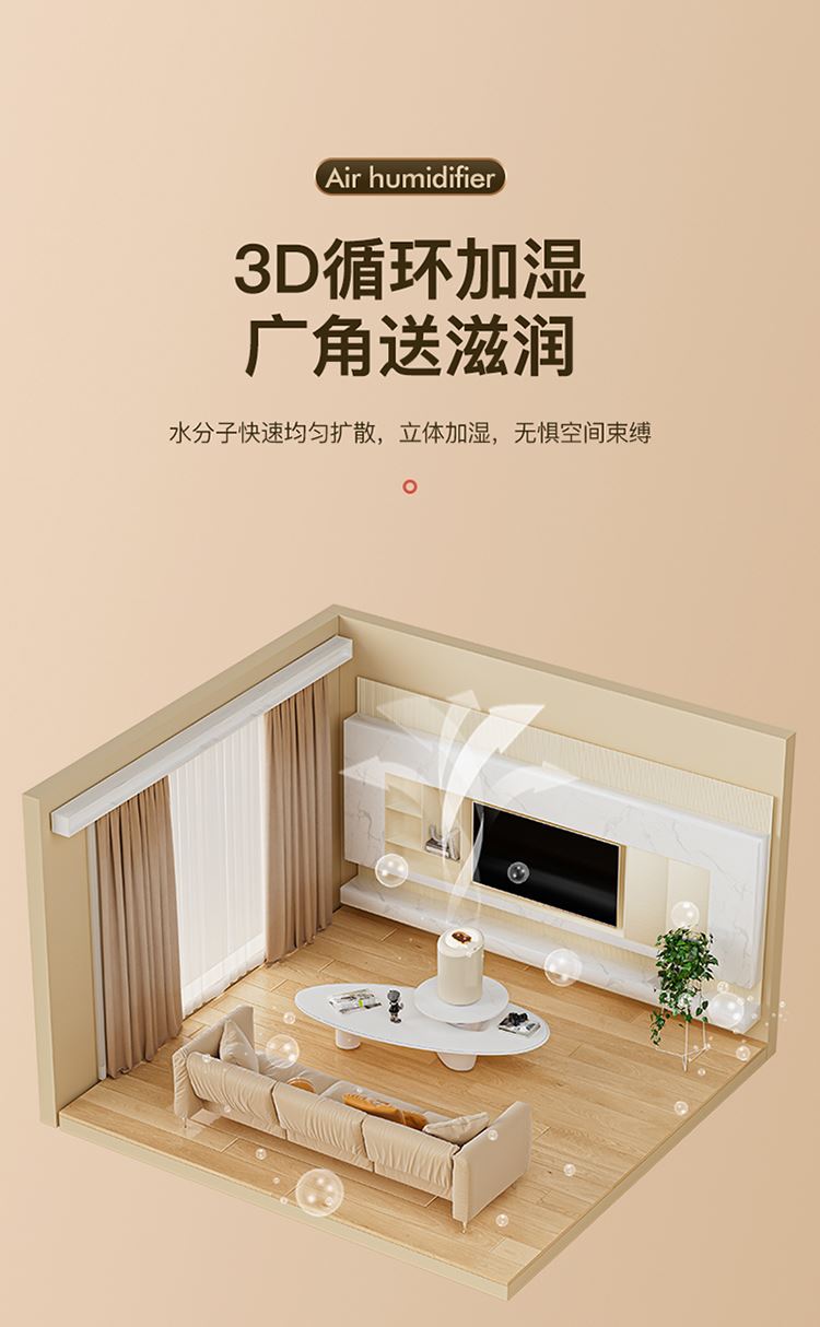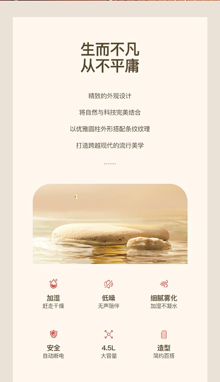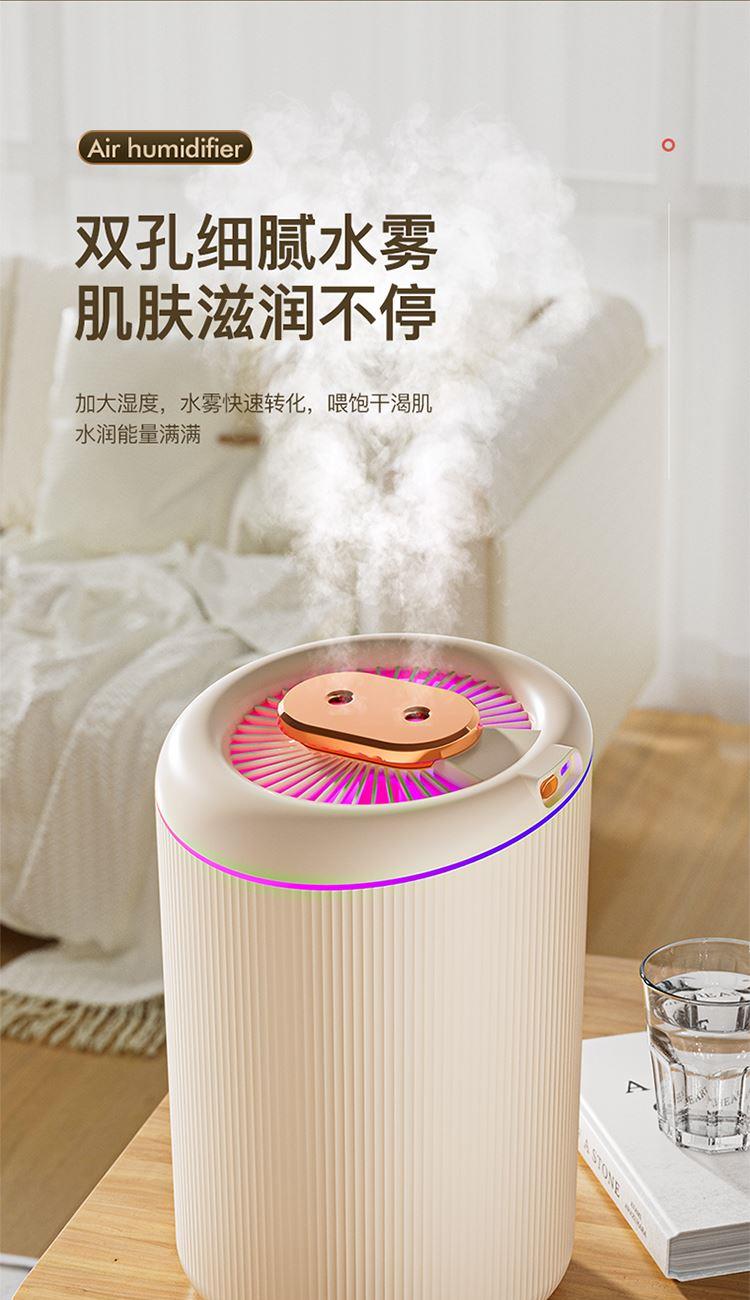 额定功率:4.5W 额定容量:4.5L 产品毛重:0.8kg/台 产品接口:USB接口 产品颜色:米白色 产品尺寸:280x190mm(mm) 包装清单:主机、充电线 主要材质:PP聚丙烯 1.4.5L大容量,母婴适用,轻音低噪运行 2.全新智能恒湿,纳米级细雾,均匀大雾量 3.自动断电保护,七彩呼吸氛围灯,营造浪温氛围 4.两种喷头调节,满足不同湿度需求,呵护家人健康呼吸