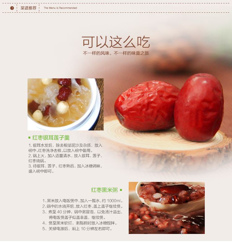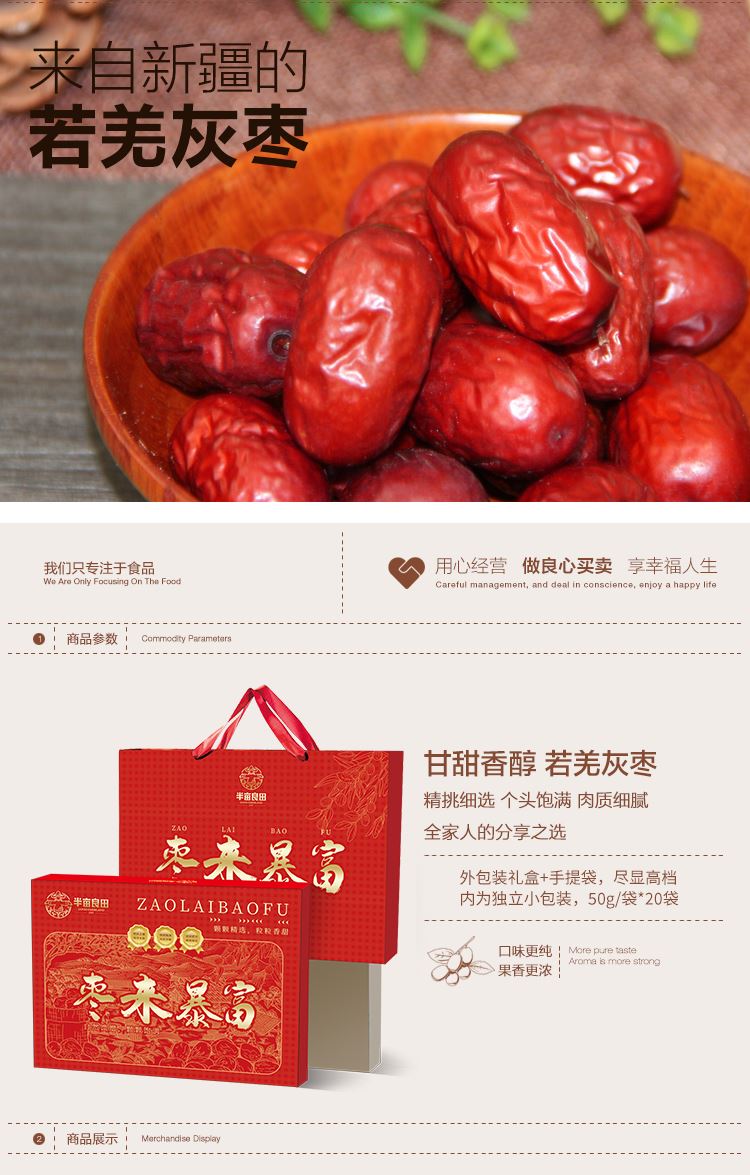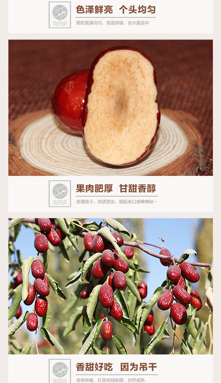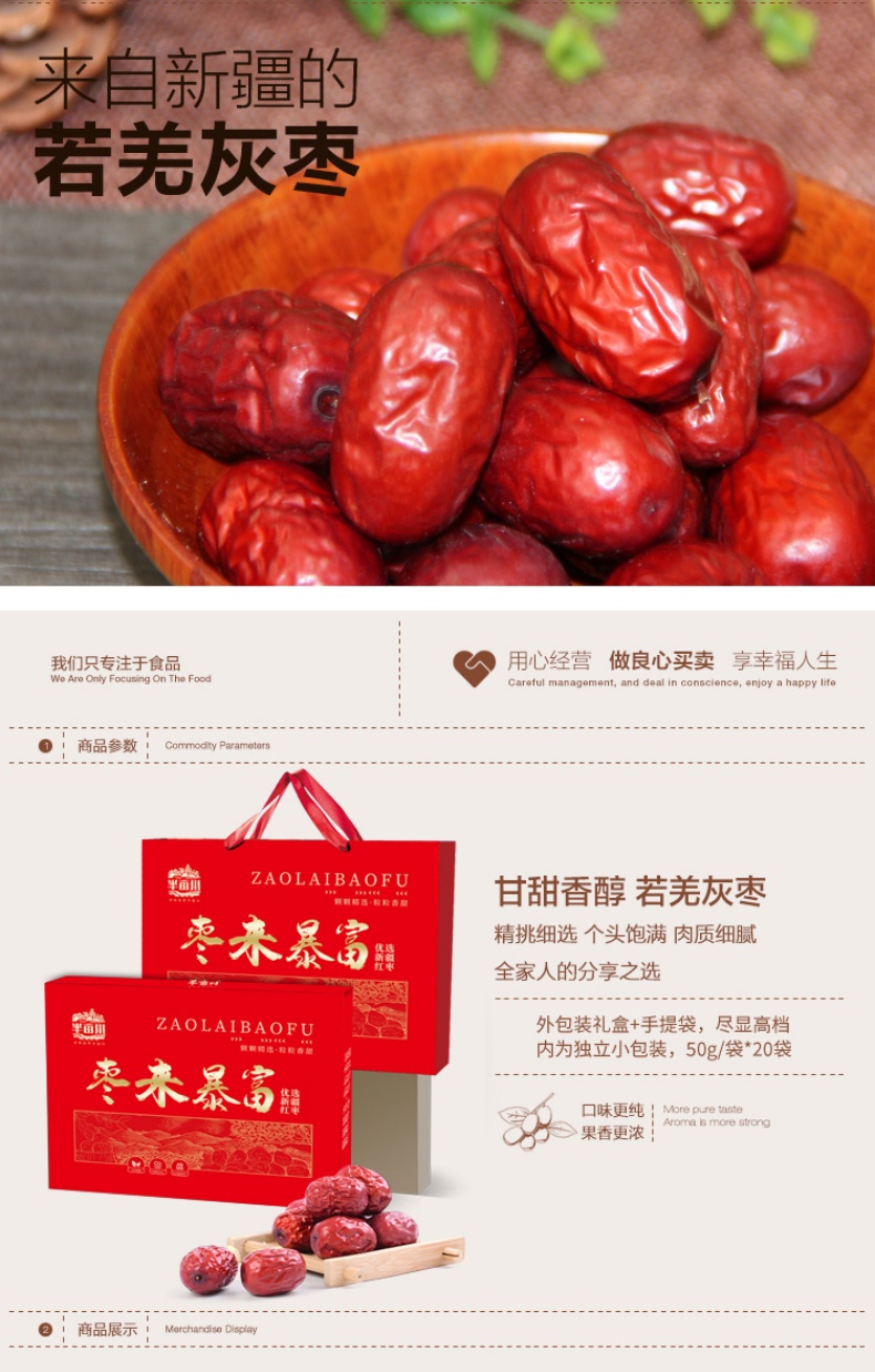 产品配置: 新疆红枣50g/袋*20袋(内袋独立小包装) 净含量:1.0Kg 礼盒尺寸:40*10*32cm 精选新疆若羌灰枣,枣肉厚实,枣核小巧,口感甘甜细腻,独立小袋封装,储存方便,携带轻松 ,方便随地享受甜蜜。