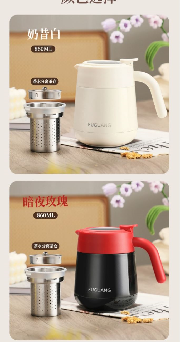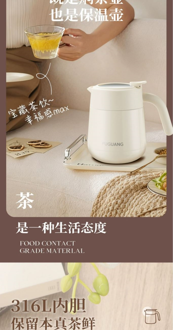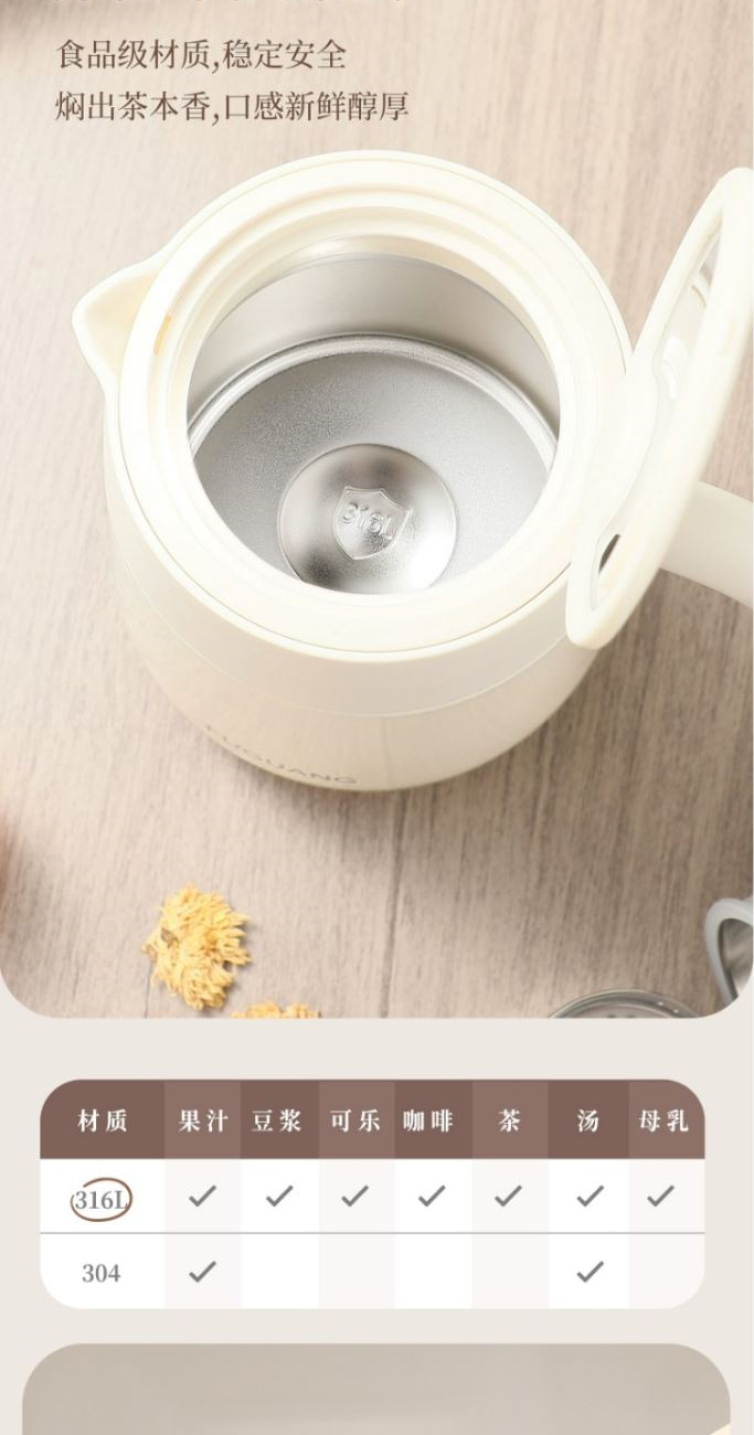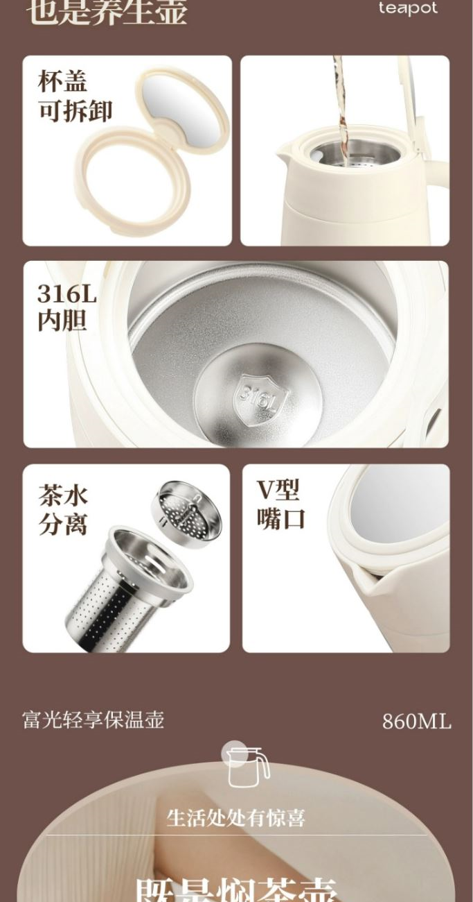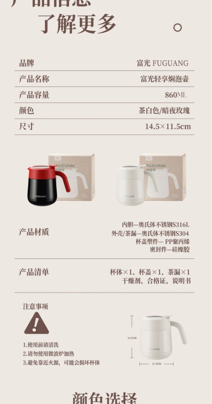 颜色:茶白色 暗夜玫瑰 尺寸:14.5高度*11.5底部直径cm 材质:31L6不锈钢内胆设计,食品级PP内盖,每一处都是安心的材质。 一体式壶盖,搭配食品级pp材质饮用放心,滴水不漏,仿鹰喙出水口防烫伤。 手柄初符合人体工程学设计,提握安全不费力。 包装:单瓦盒