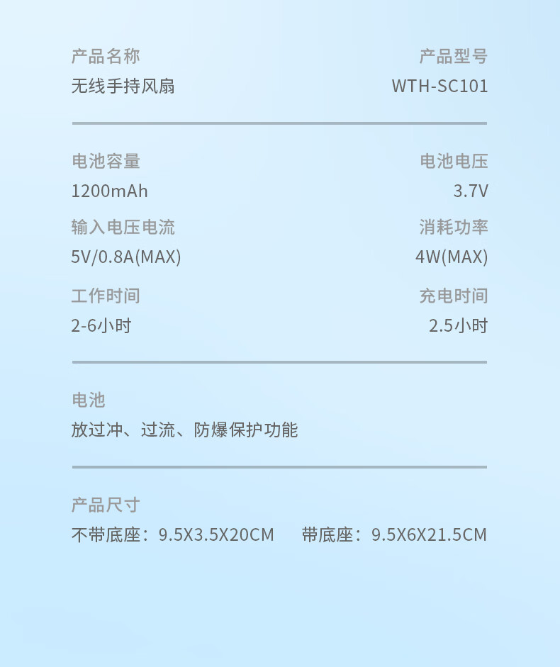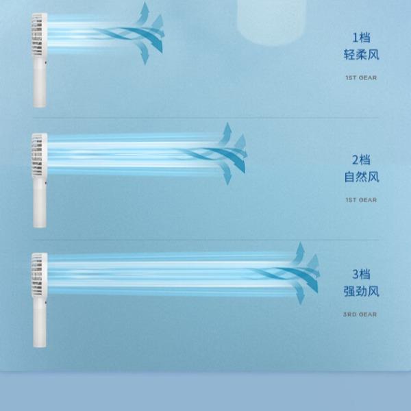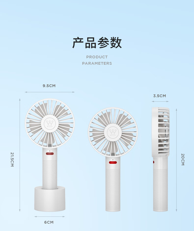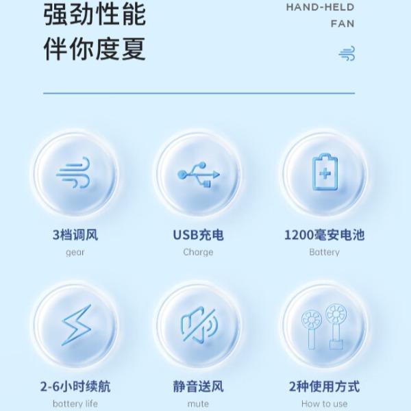 功率:4W 毛重:0.4kg 档位:3档 产品尺寸: 95*35*215mm 3档风速调节 USB快速充电 1200mA电池 轻音送风 小巧便携