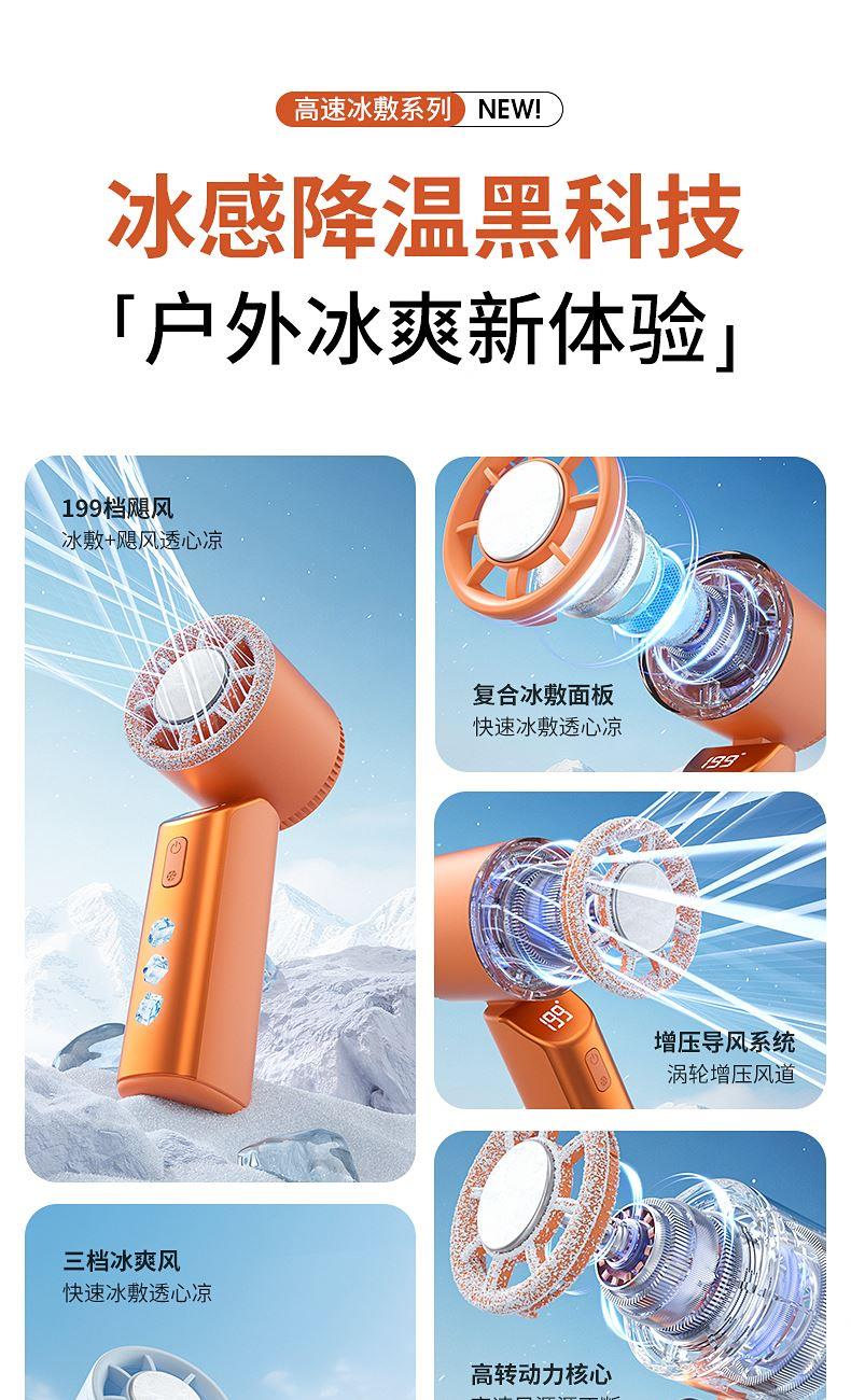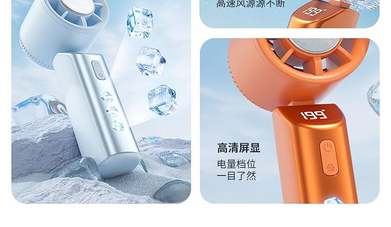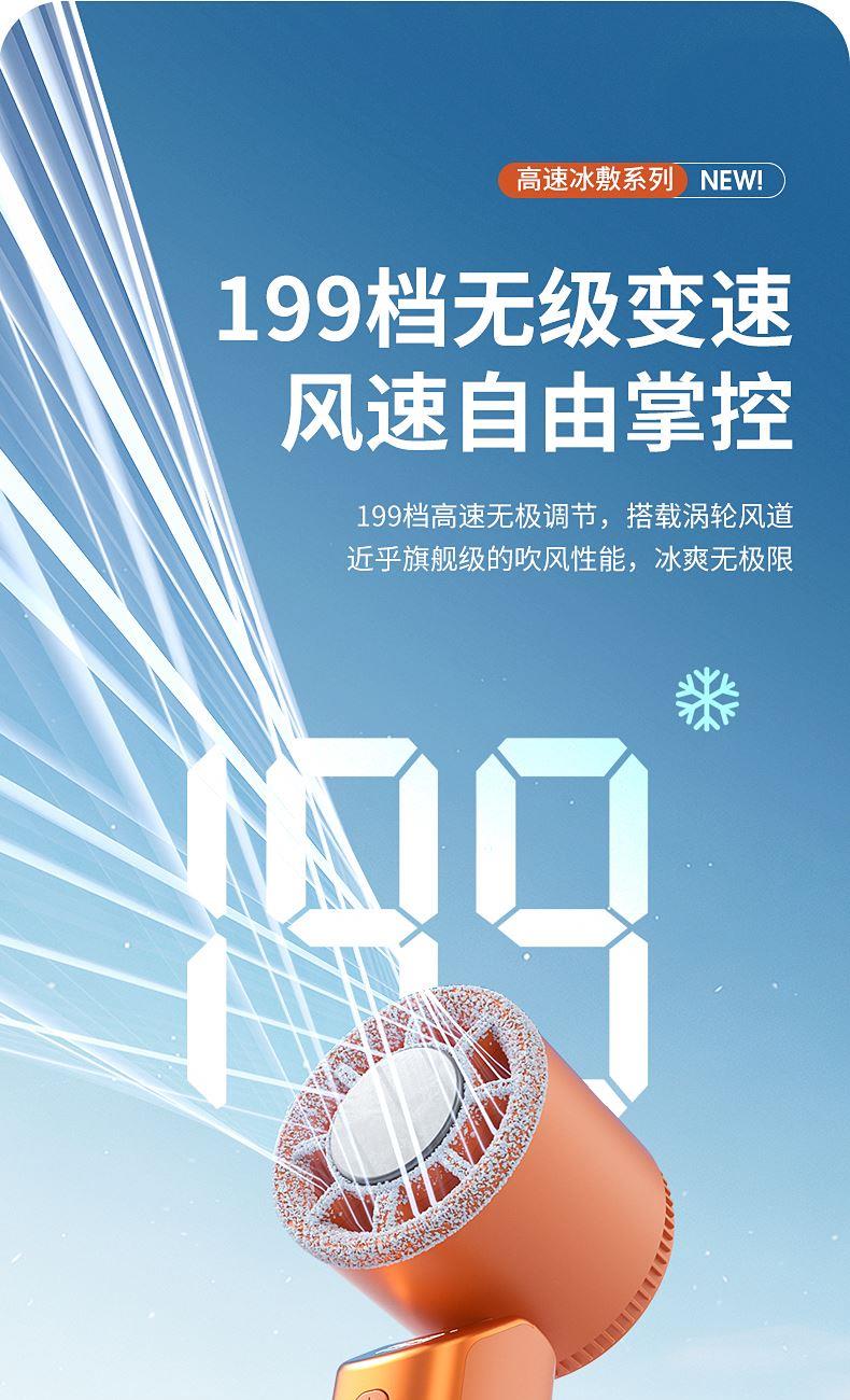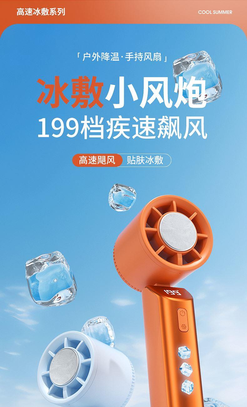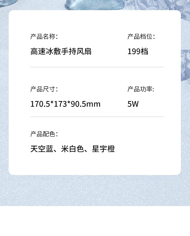 产品材质:ABS 产品功能:199档风力调节 产品容量:3000mAh 产品尺寸:90.5*173*170.5mm 产品颜色:米白色,蓝色,橙色 活力撞色设计,搭配电镀工艺,质感拉满;199档风力调节,超大风力,为你的夏天带来丝丝清凉。ICE智冷系统,3档冷风选择,智能冰感屏,带来不一样的体验。