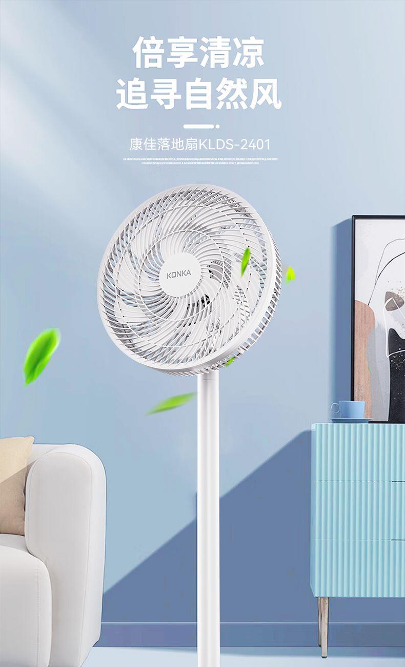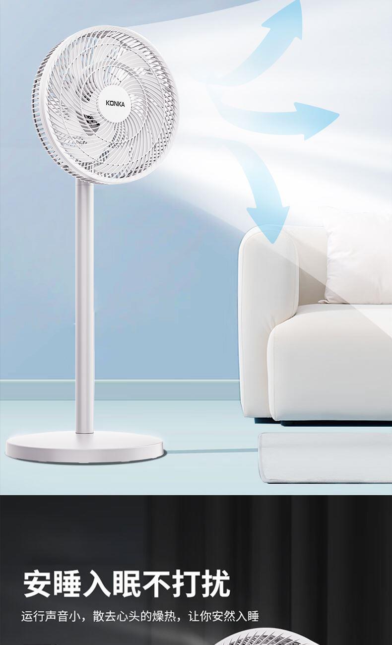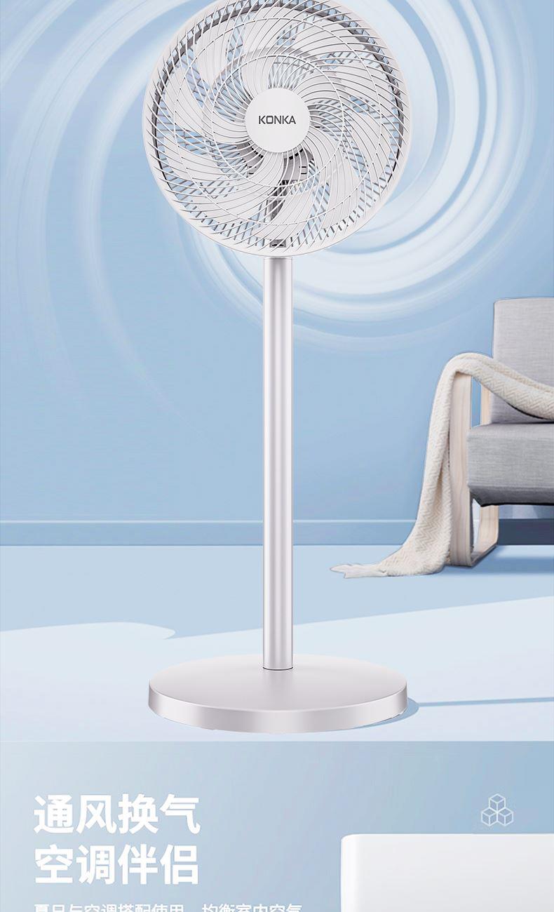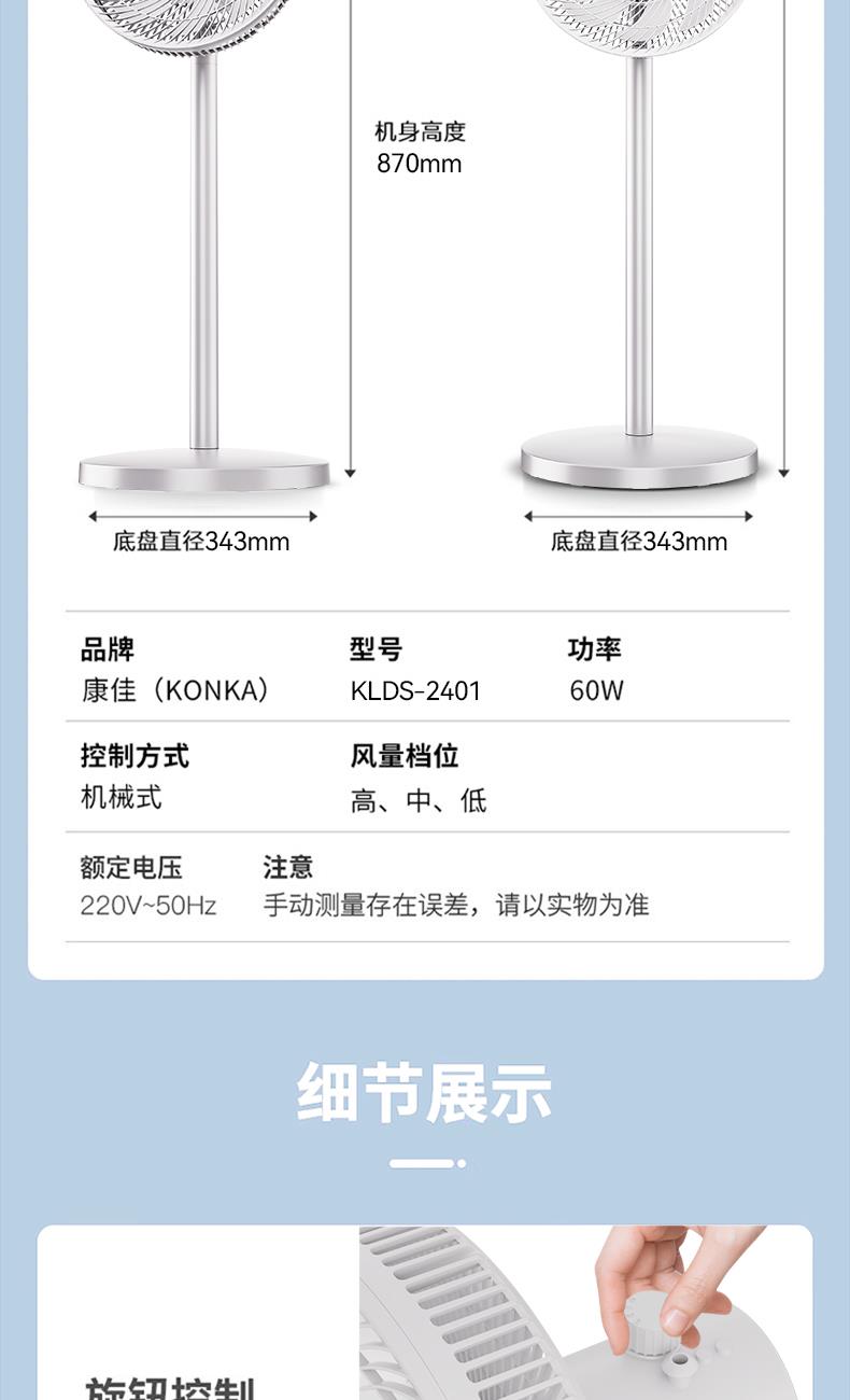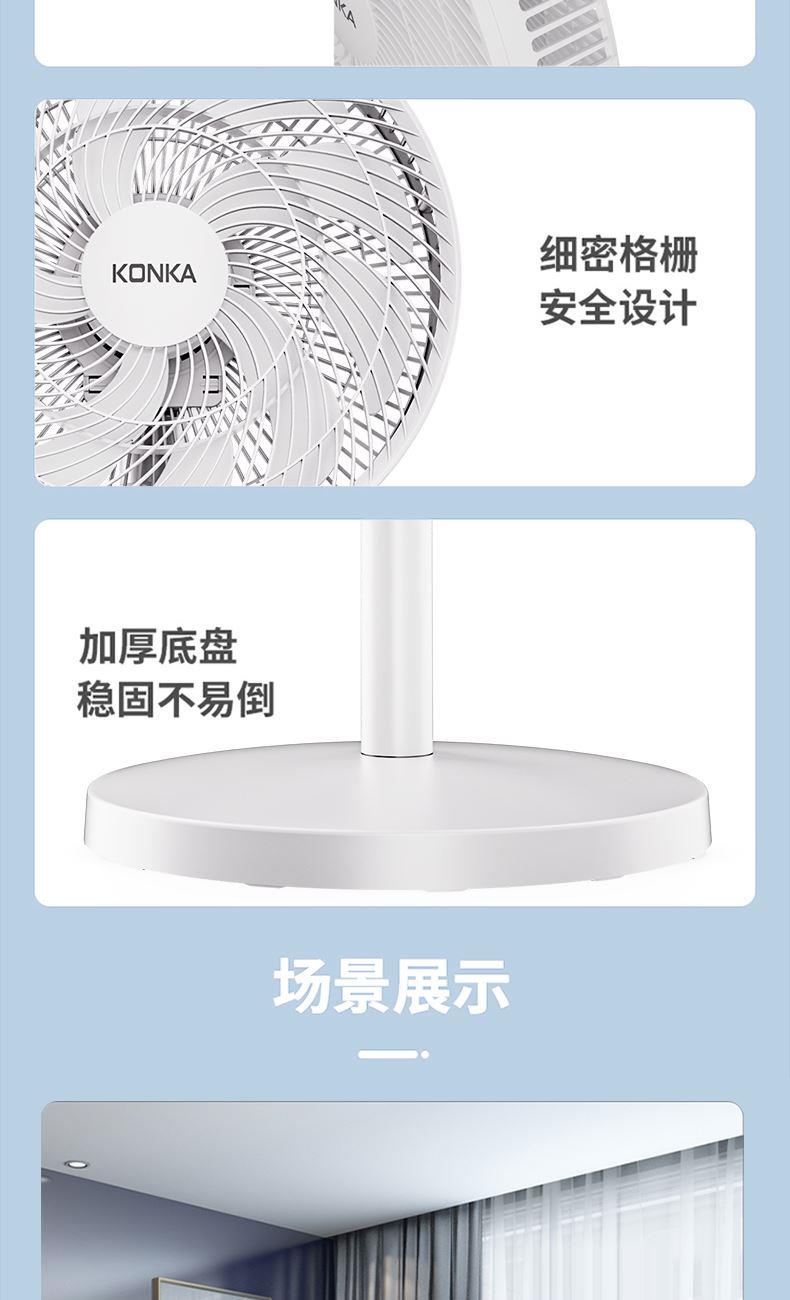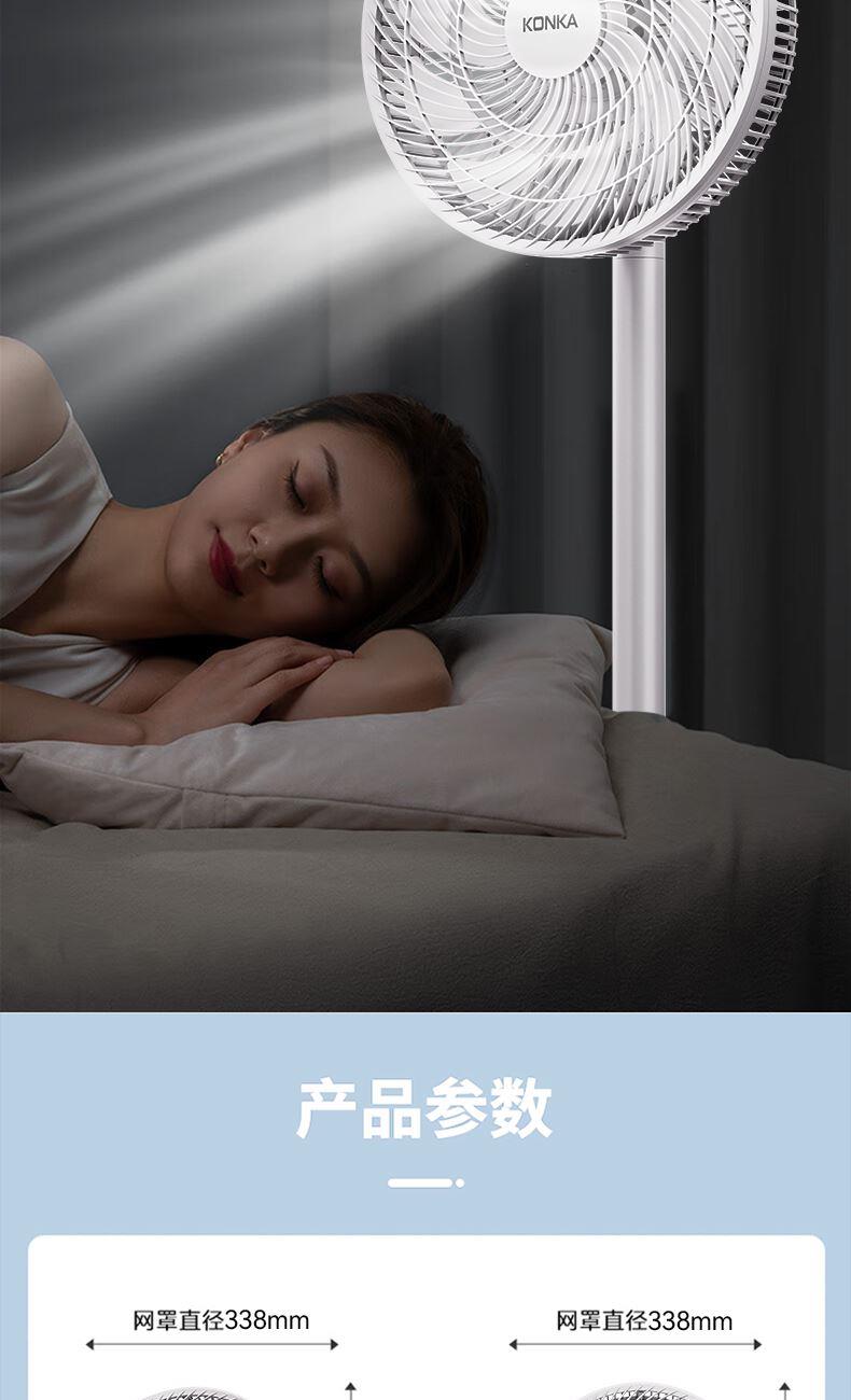 功 率:60W 颜 色:白色 电压/频率:220V/50HZ 网罩直径:338mm; 机身高度:870mm; 底盘直径:343mm; 康佳落地扇,解暑神器,风力强劲; 外形简约雅致,风力旋钮设计简便明了; 多档位风速,方便实用 60W功率风力强劲;带摇头功能; 三档风力,低挡(静音睡眠风),中档(和煦自然风)、三档(强劲清凉风)