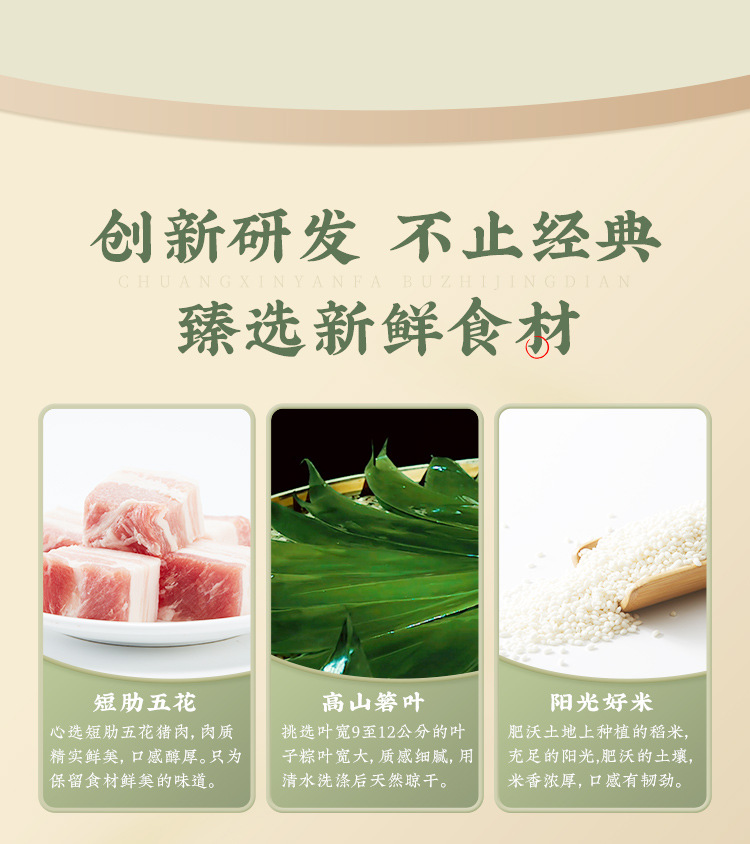 臻选短肋五花肉,肉质精实鲜美,口感醇厚;精心挑选9-12公分的高山箬叶,粽叶宽大,质感细腻;精选肥沃土地种植的稻米,米香浓厚,口感有韧劲。既可做聚会茶点,加盒牛奶又可做早餐,上市企业生产,品质有保障