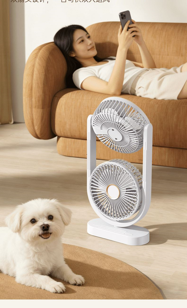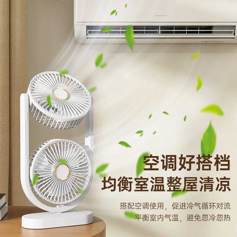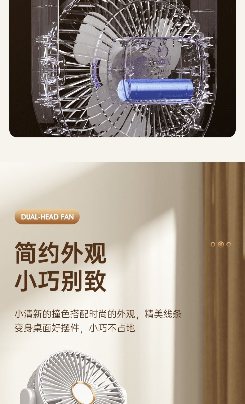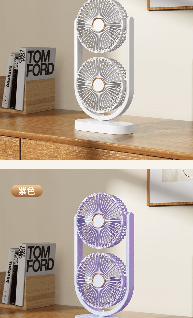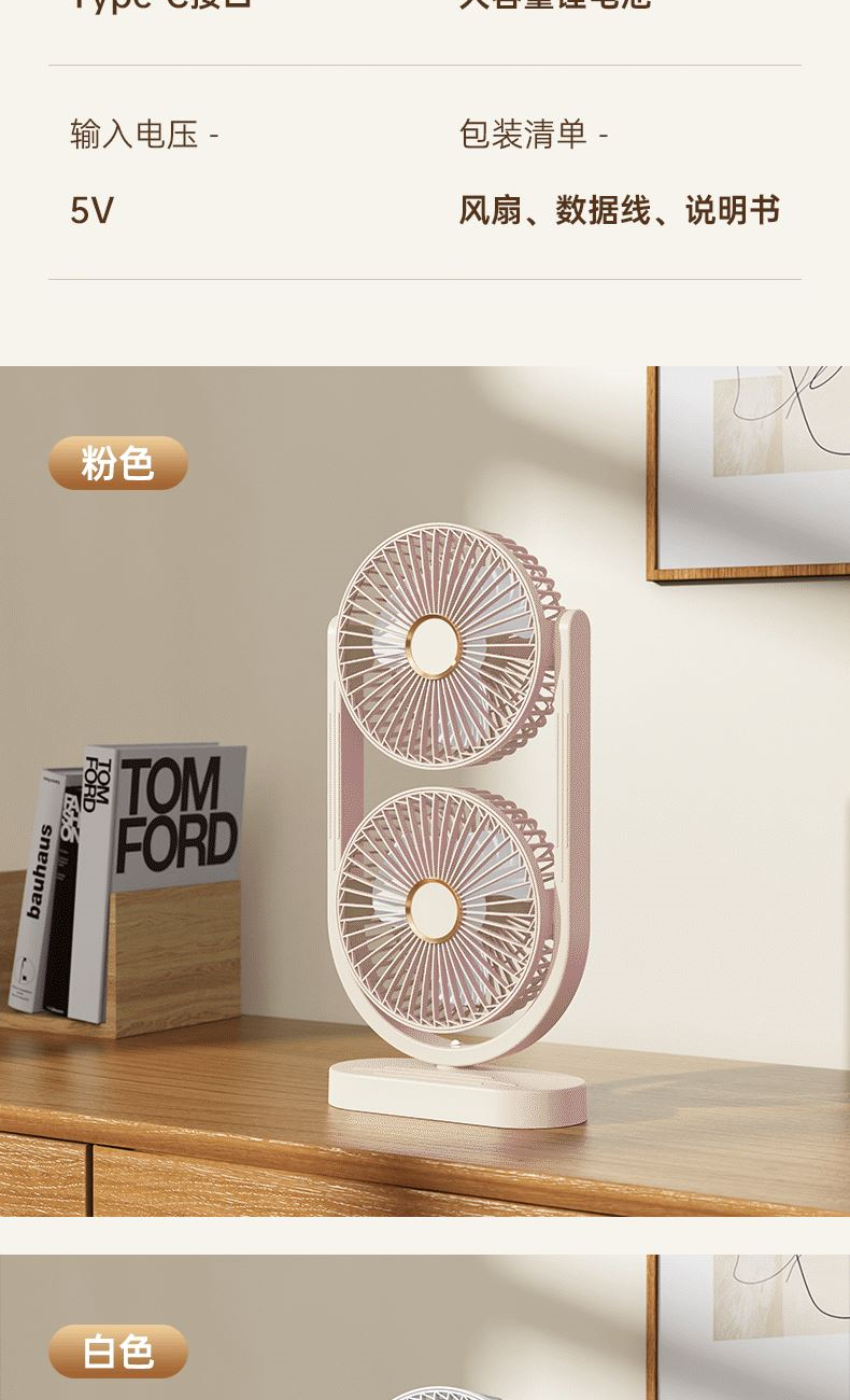 电池容量:2400mAh 产品重量:480g/587g 产品尺寸:18*7.8*36cm 产品尺寸:18*8.5*37cm 整箱数量:74*55*45cm/30个/18kg 产品颜色:白色、粉色、蓝色 5档风可调节,360度角度可调 内置2400mAh大容量电池 双头可独立控制风速 静音无刷电机