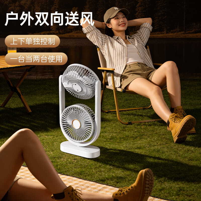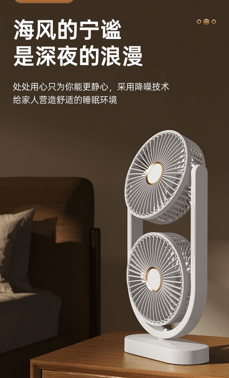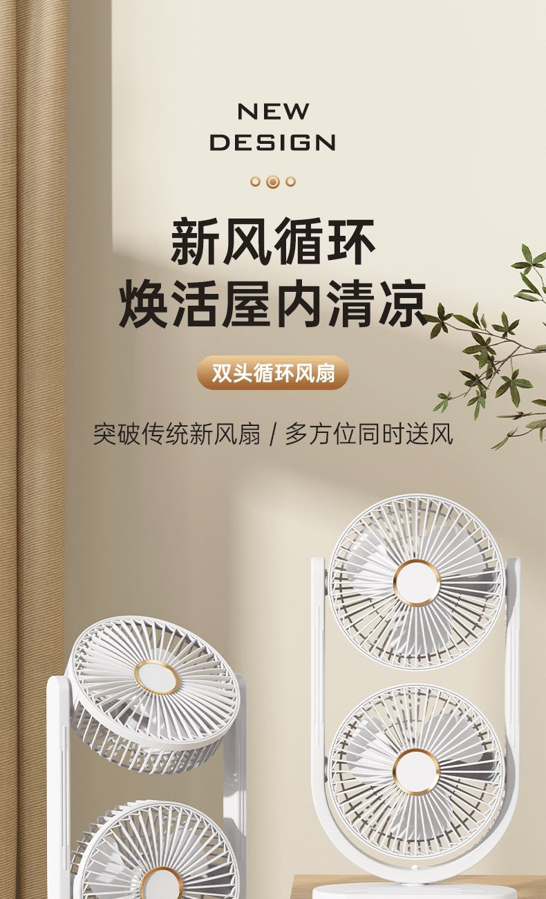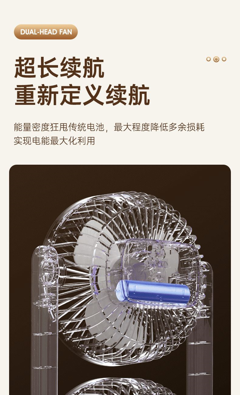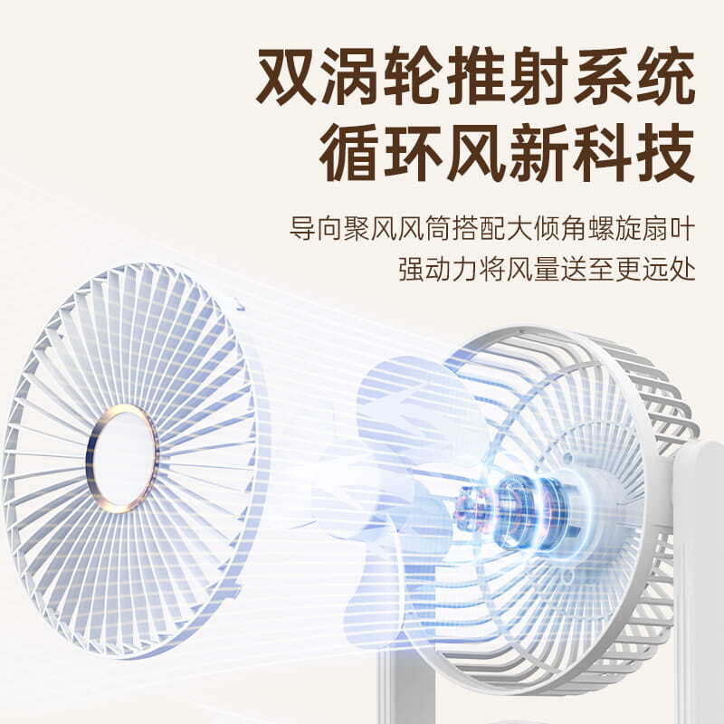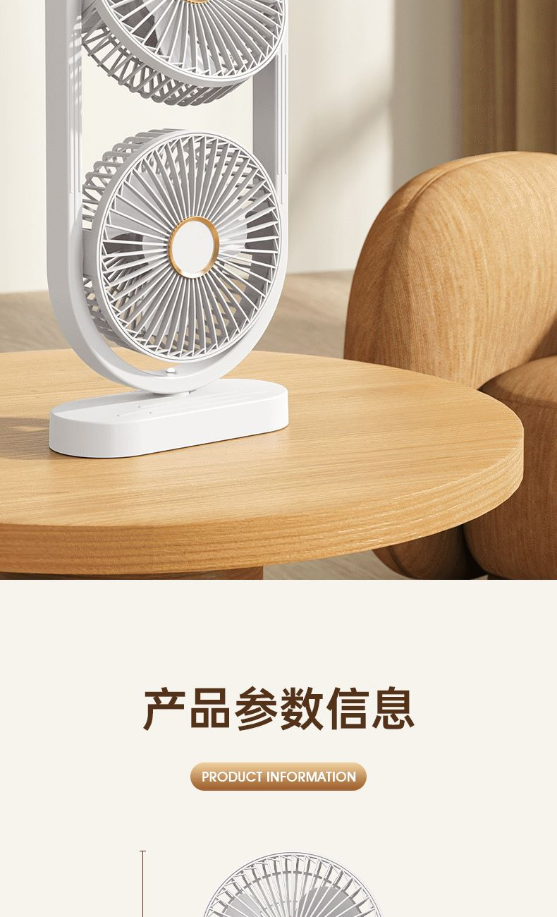 电池容量:2400mAh 产品重量:480g/587g 产品尺寸:18*7.8*36cm 产品尺寸:18*8.5*37cm 整箱数量:74*55*45cm/30个/18kg 产品颜色:白色、粉色、蓝色 5档风可调节,360度角度可调 内置2400mAh大容量电池 双头可独立控制风速 静音无刷电机