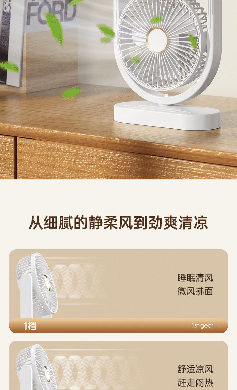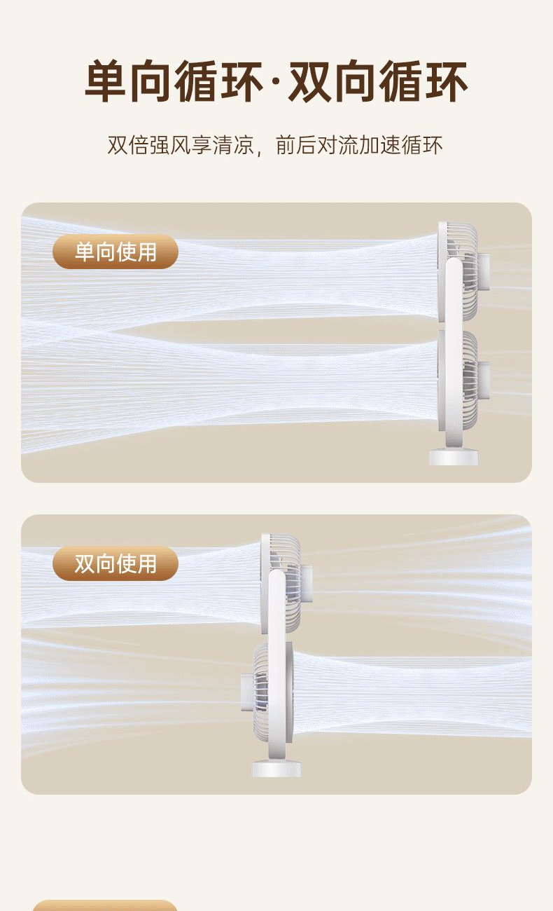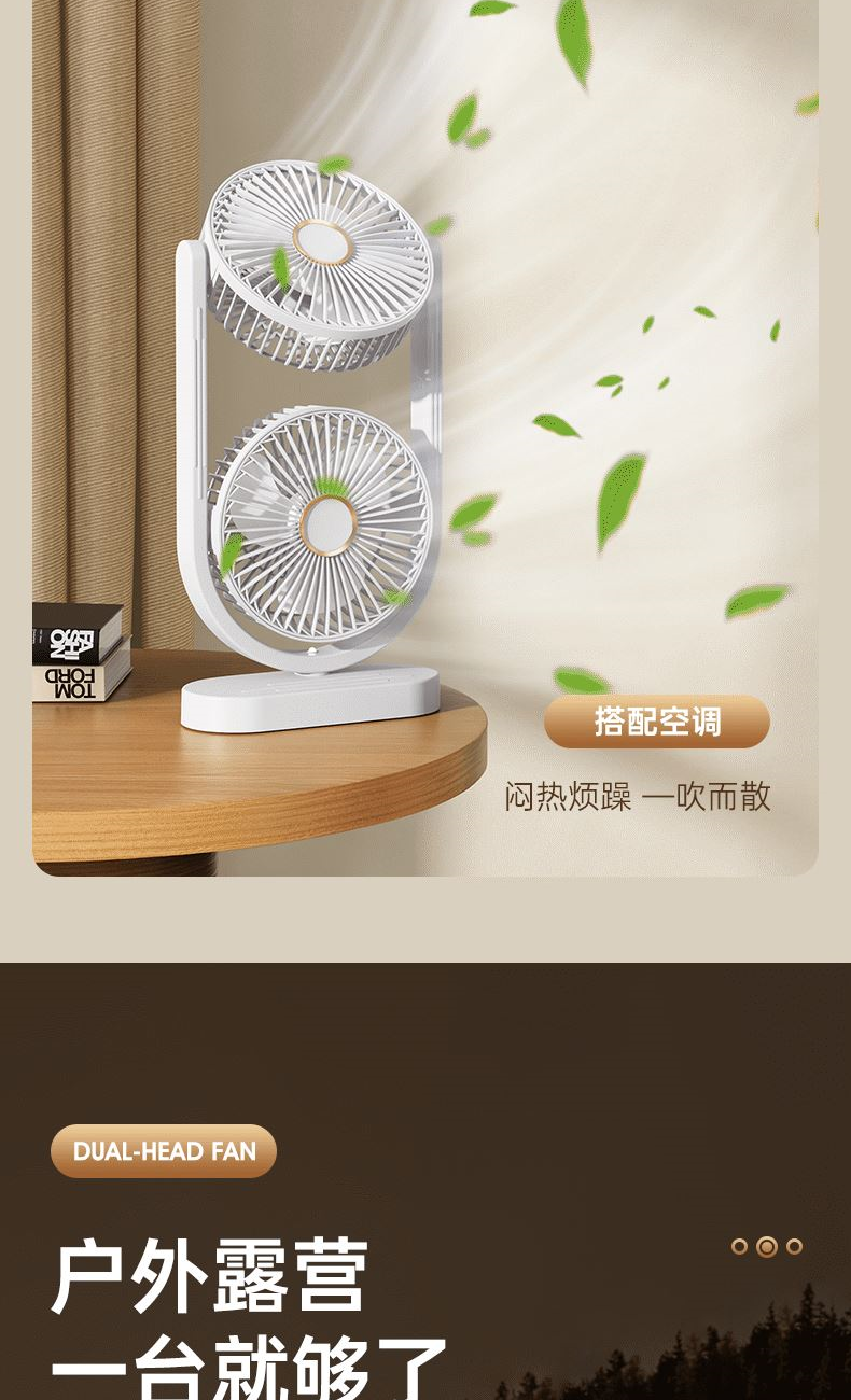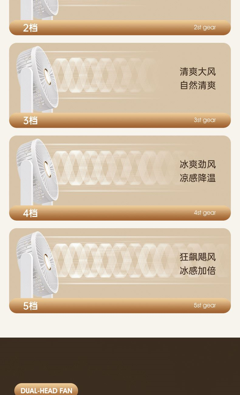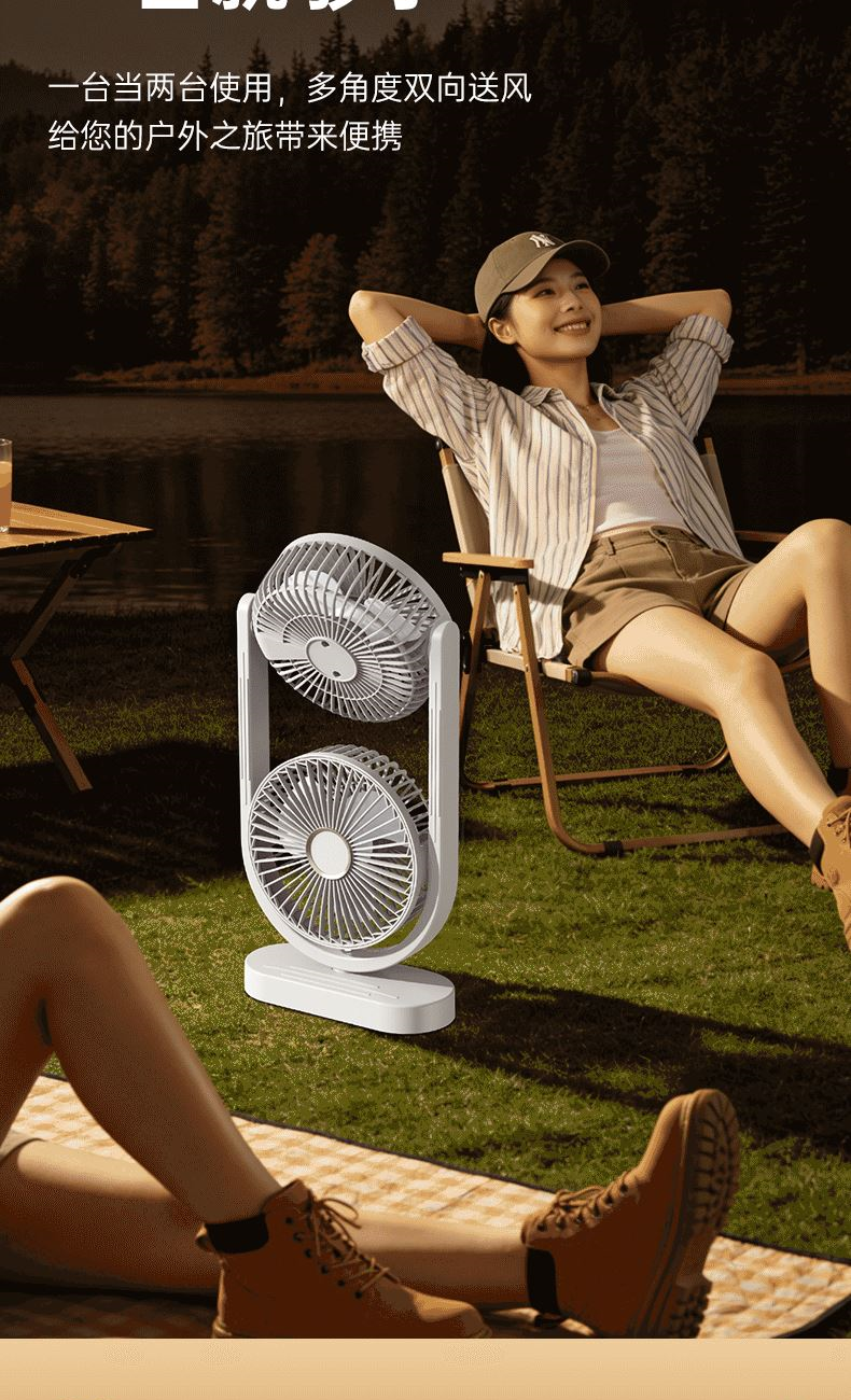 电池容量:2400mAh 产品重量:480g/587g 产品尺寸:18*7.8*36cm 产品尺寸:18*8.5*37cm 整箱数量:74*55*45cm/30个/18kg 产品颜色:白色、粉色、蓝色 5档风可调节,360度角度可调 内置2400mAh大容量电池 双头可独立控制风速 静音无刷电机