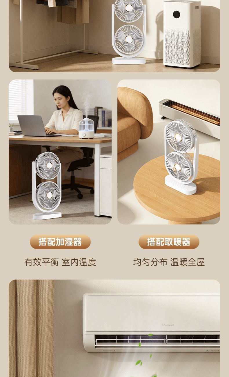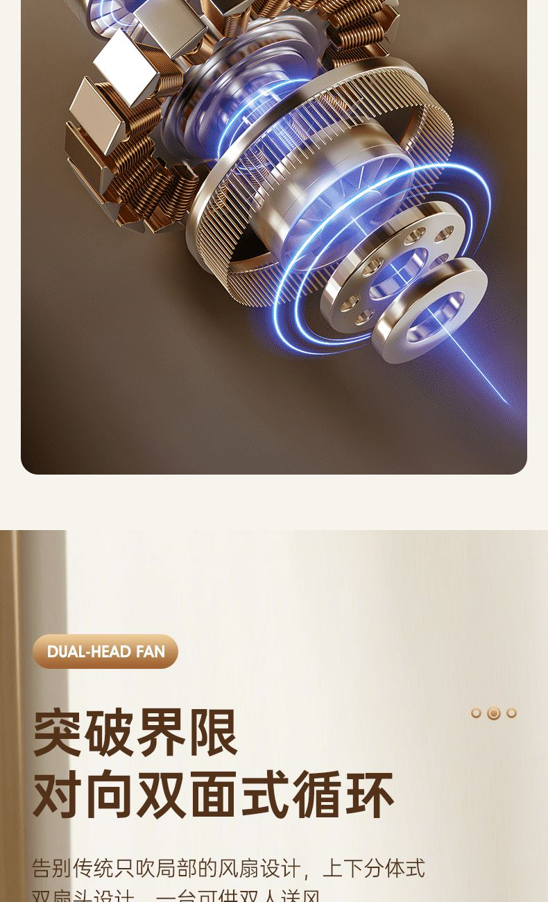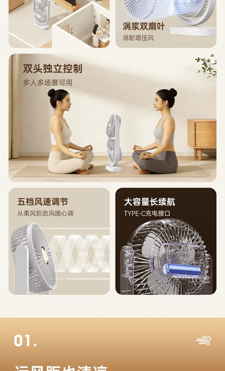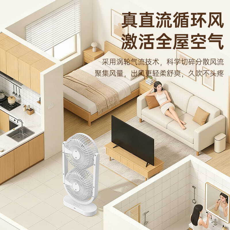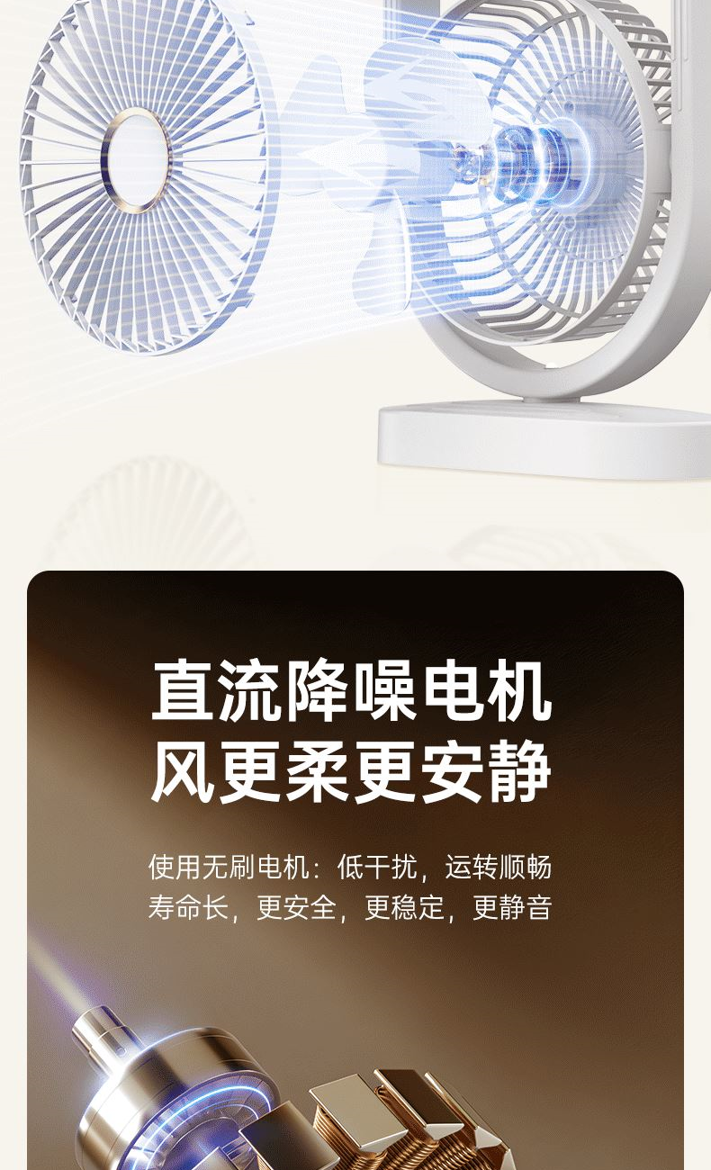 电池容量:2400mAh 产品重量:480g/587g 产品尺寸:18*7.8*36cm 产品尺寸:18*8.5*37cm 整箱数量:74*55*45cm/30个/18kg 产品颜色:白色、粉色、蓝色 5档风可调节,360度角度可调 内置2400mAh大容量电池 双头可独立控制风速 静音无刷电机