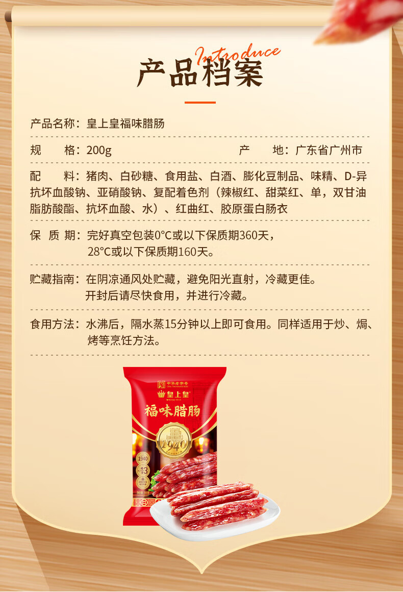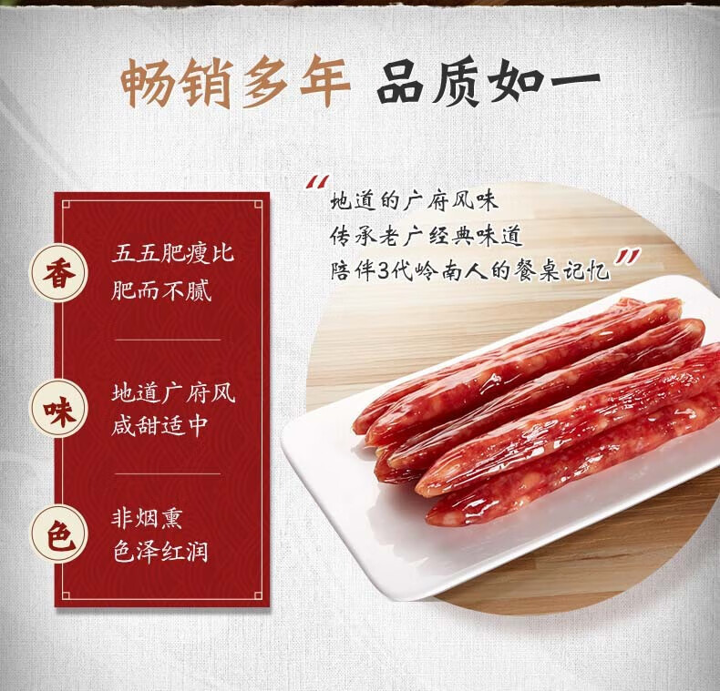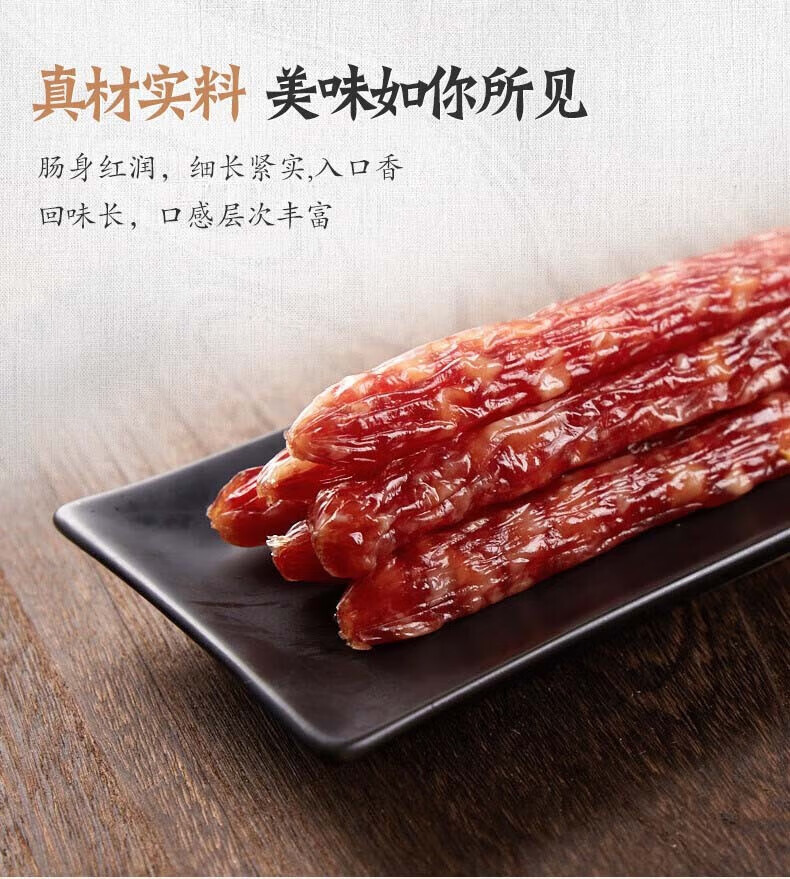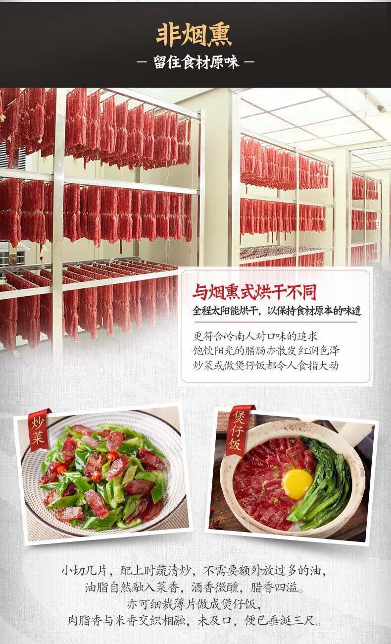 产地:广东 特产品类:广式腊肠 包装形式:袋装 食用方法:烹饪食用 加工工艺:烘干 保质期:360天