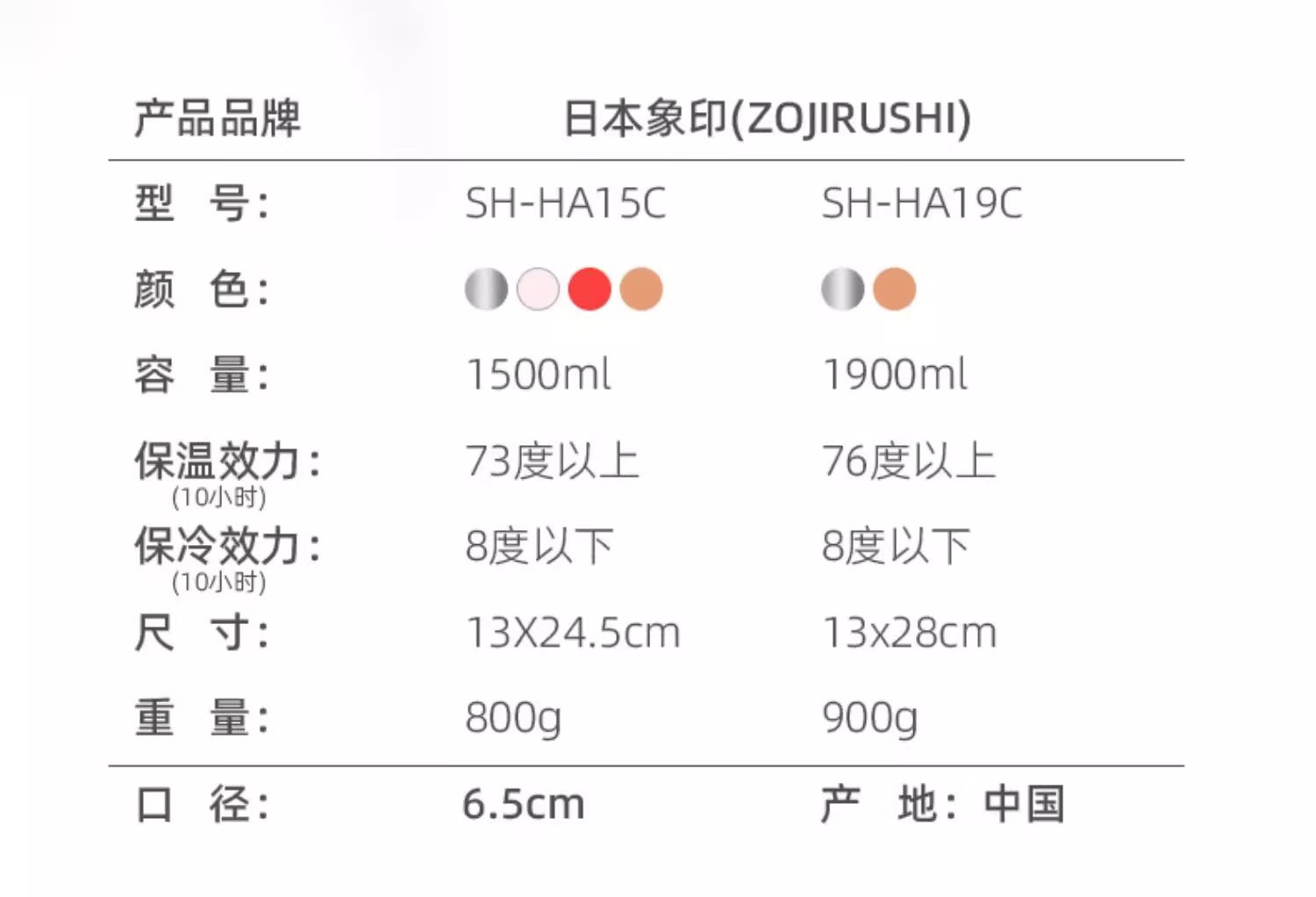 品 牌:象印ZOJIRUSHI 型 号:SH-HA15C 颜 色:DB橘红/NZ金铜色/PF香槟色/XA不锈钢色 容 量:1.5L 类 型:按压式保温壶 材 质:304不锈钢 保 温:6小时约60°C 保 冷:6小时约10°C以下 产 地:泰国