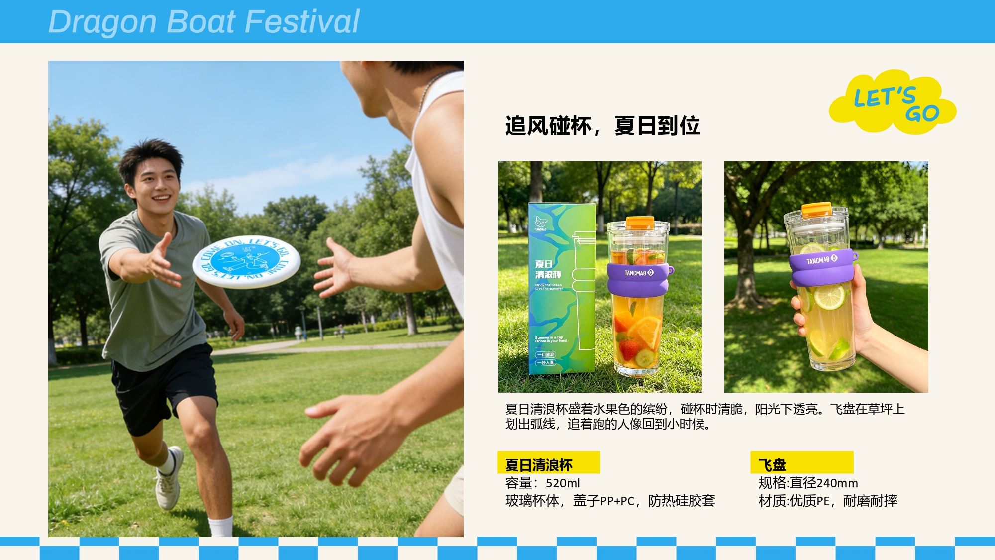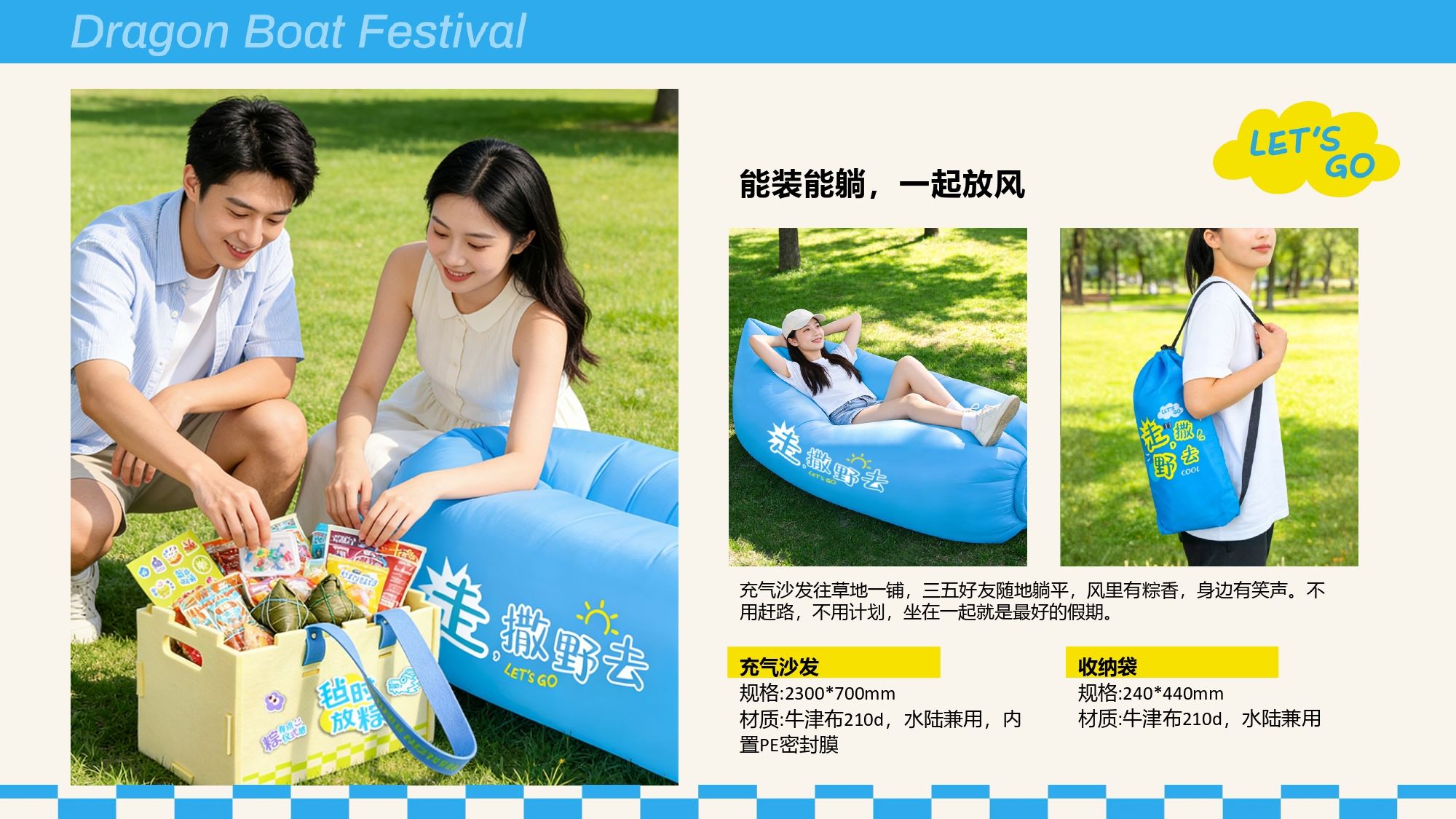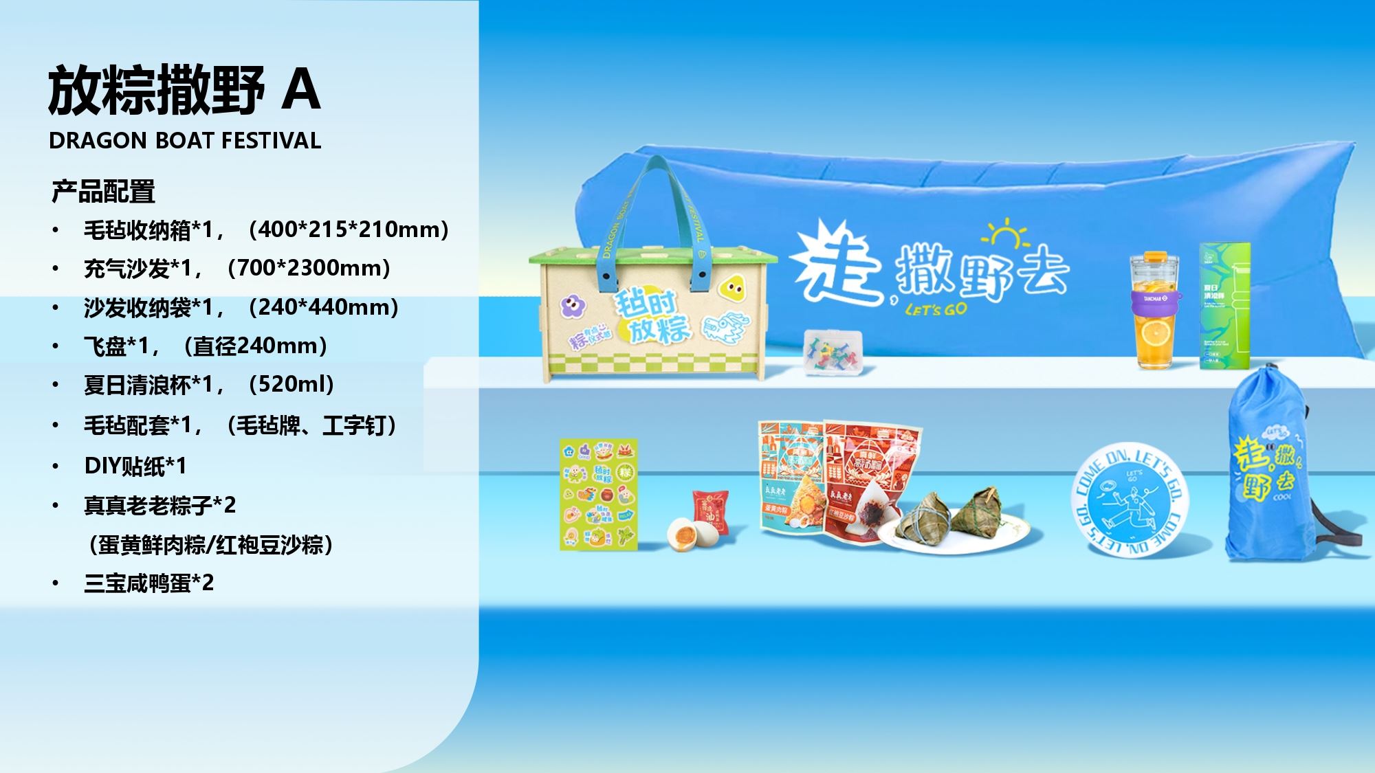 产品配置 毛毡收纳箱*1,(400*215*210mm) 充气沙发*1,(700*2300mm) 沙发收纳袋*1,(240*440mm) 飞盘*1,(直径240mm) 夏日清浪杯*1,(520ml) 毛毡配套*1,(毛毡牌、工字钉) DIY贴纸*1 真真老老粽子*2 (蛋黄鲜肉粽/红袍豆沙粽) 三宝咸鸭蛋*2