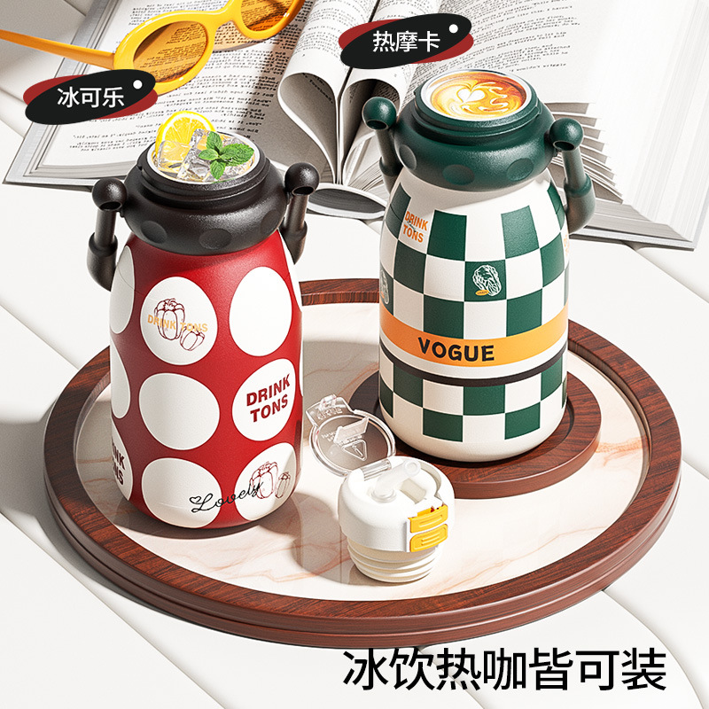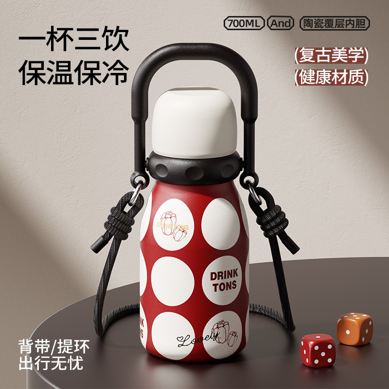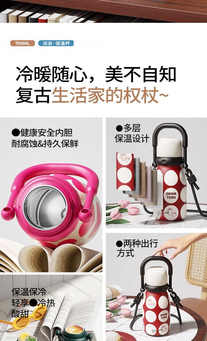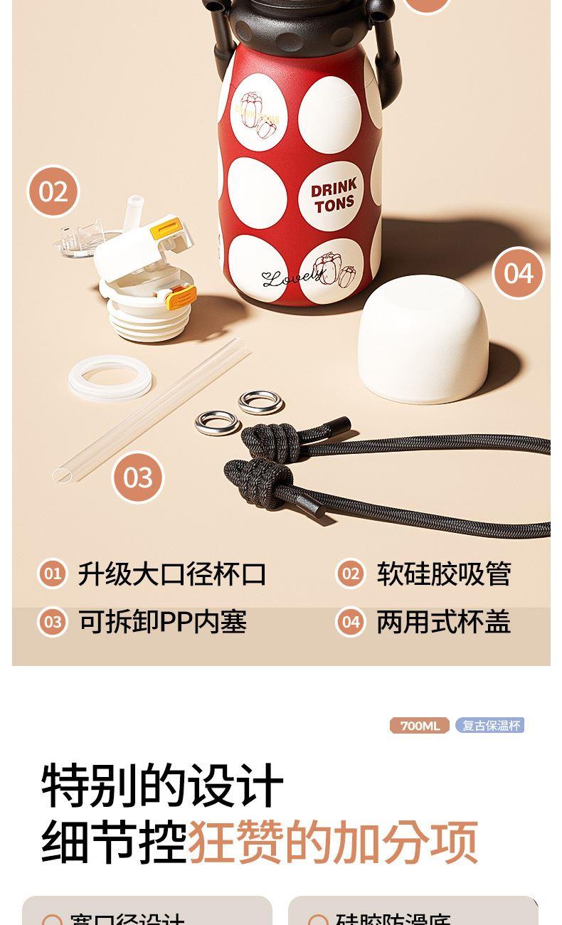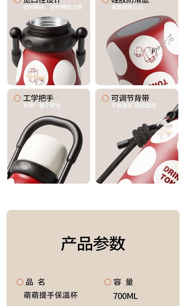 容量:700ml 颜色:红色/绿色 底片材质:316不锈钢 内胆材质:304不锈钢 保温时间:6-12小时 产品尺寸:90*219mm 1、6层保温黑科技,轻松守护如初口感 2、升级大口径杯口,软硅胶吸管,可拆卸PP内塞,两用式杯盖 3、可拎可背,双重选择,随心而动,出行不受限