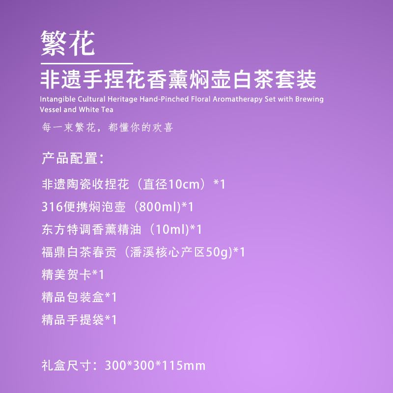 【产品配置】 非遗陶瓷手捏花(直径10cm)*1 316便携焖泡壶(800ml)*1 东方特调香薰精油(10ml)*1 福鼎白茶春贡(潘溪核心产区50g)*1 精美贺卡*1 精品包装盒*1 精品手提袋*1 【产品说明】 1、核心配置非遗手捏陶瓷花,兼具文化价值与艺术感; 2、316不锈钢焖泡壶,满足日常出行与办公泡茶需求; 3、一套涵盖焖壶、白茶、香薰,适配品茗、香氛、装饰场景; 4、潘溪核心产区福鼎白茶+特调香薰,口感与香气双优; 5、繁花主题+精美包装贺卡,适配女神节礼赠。