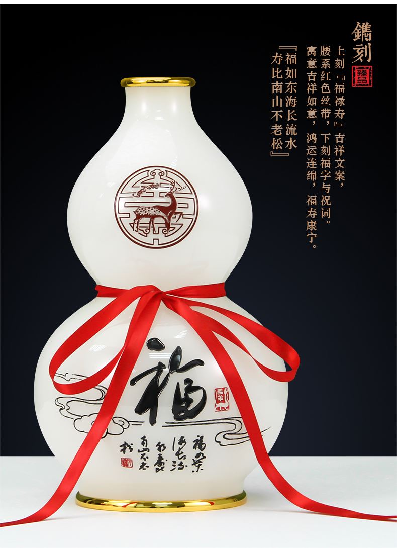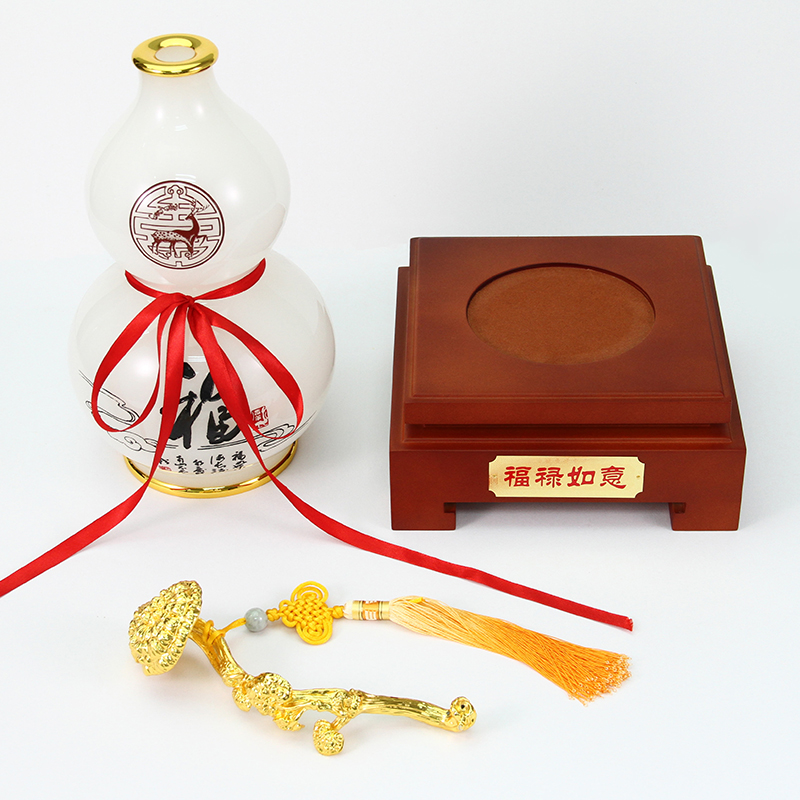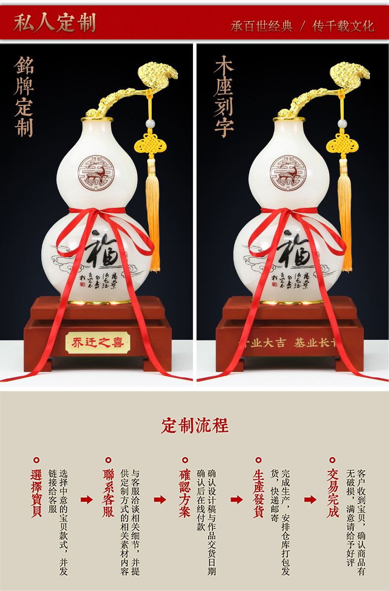 “葫芦”谐音“福禄”, 葫芦自古以来乃中国传统吉祥物之一,葫芦具有辟邪、招财,子孙万代,繁茂吉祥之寓意与象征。今以精湛的吹制和雕刻技艺而成之“五福临门”花瓶。上雕五福,瓶口插祥云灵芝,系流苏绳穗;配以吉祥红色木座。作品整体效果层次分明,端庄典雅,五福临门。瓶身和木座均可根据客户需求定制文案内容,乃家居装饰、开业庆典、商务馈赠和个人收藏之美好选择。 产品整体尺寸:205*205*440mm 产品净重:4.5KG 产品材质:琉璃+合金+木座 发货地:深圳龙岗区 快递:默认德邦快递