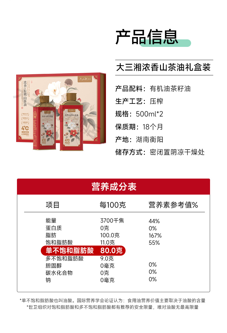 大三湘浓香山茶油500ml*2双支(铁罐)礼盒