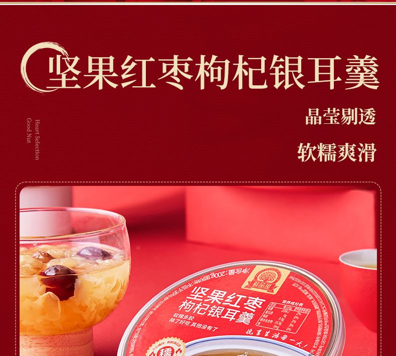 80g夏威夷果*1 100g高原核桃*1 300g新疆灰枣*1 22g迎福糕点*15 200g坚果红枣枸杞银耳羹*1