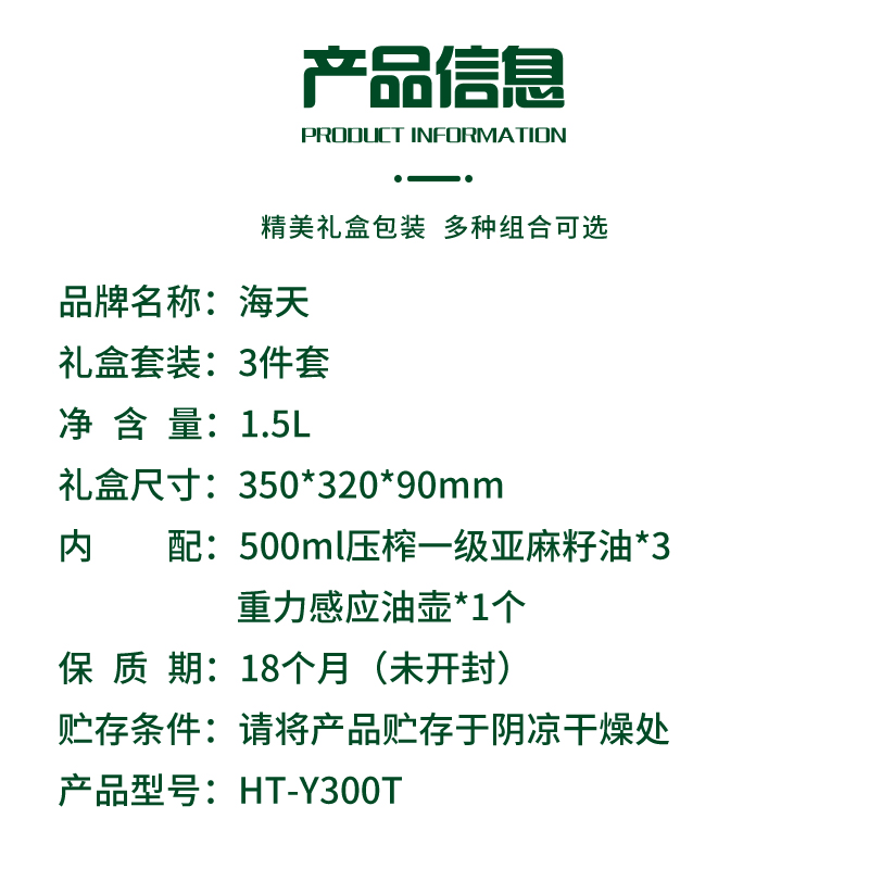 净含量:1.5L 内配:亚麻籽油(500mL铁罐*3) 重力感应油壶*1个 礼盒尺寸:331*296mm 推荐理由:员工福利、积分兑换、项目招标 物理低温冷榨 冷烹两用 油体清澈 味道清香 头道初榨 0胆固 醇 亚麻酸大于52%