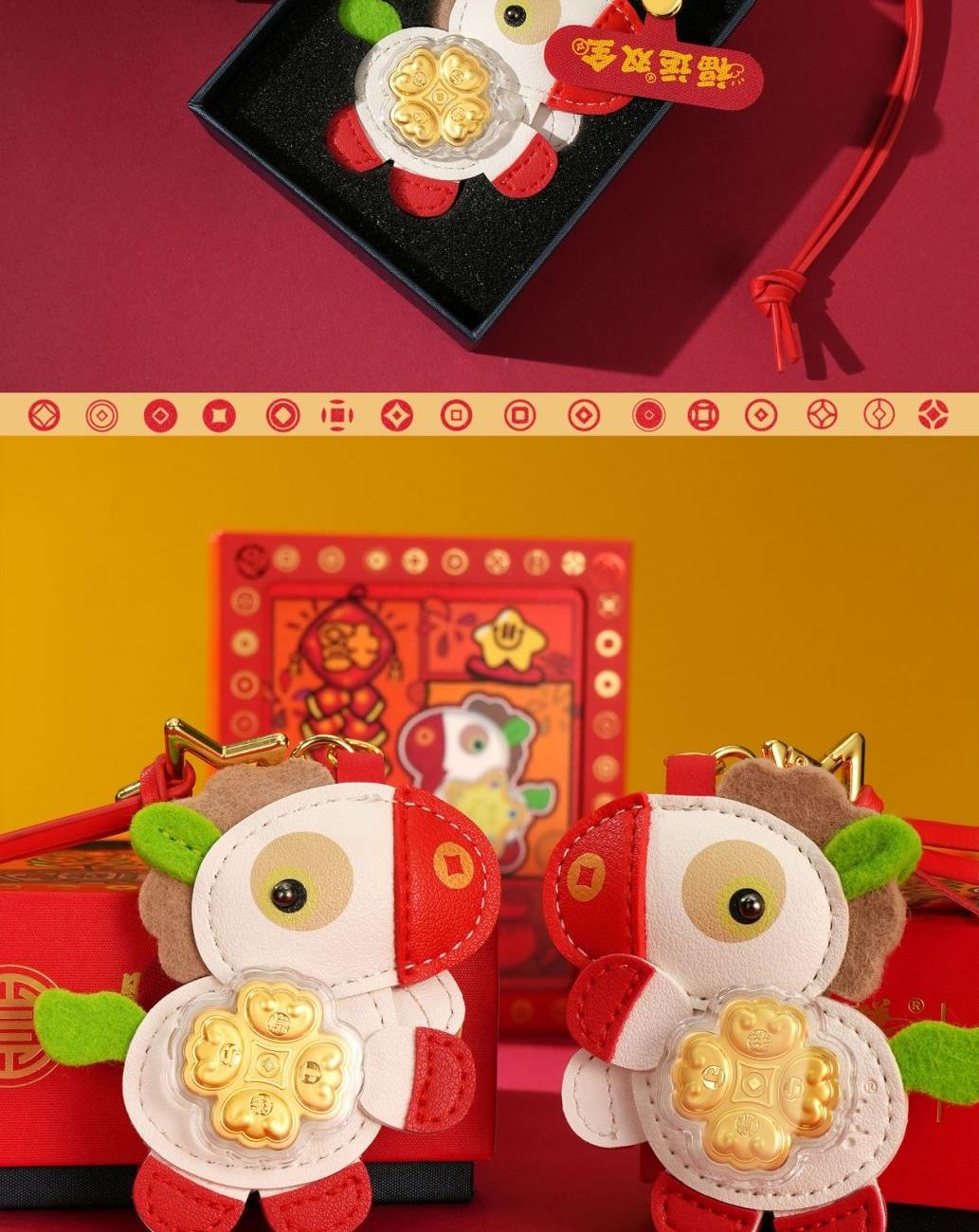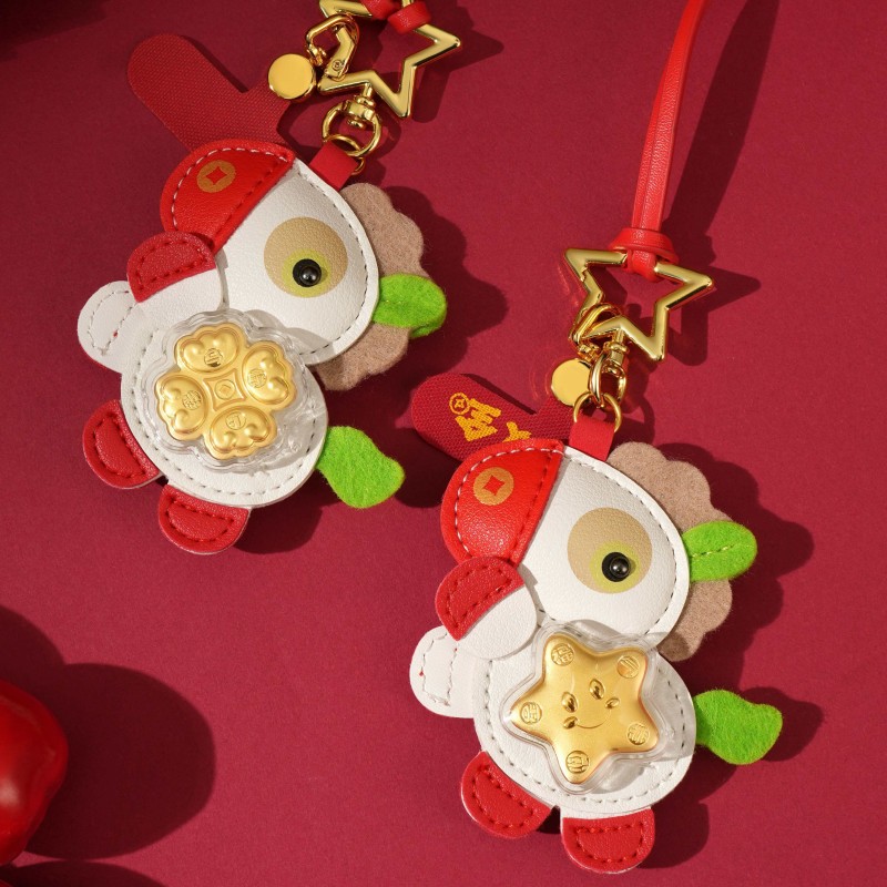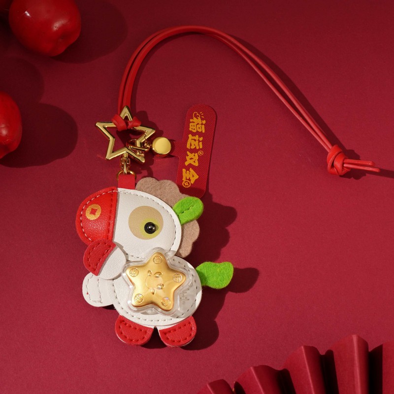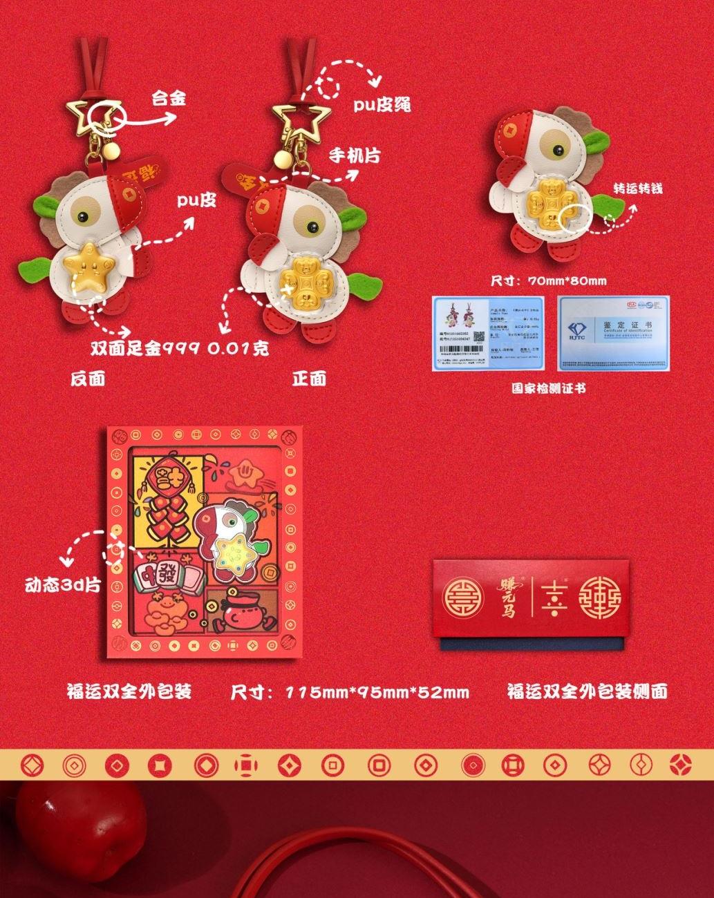 产品配置: 1.挂件x1个 2.质检证书x1张 3.精美包装x1个 4.贵金属规格:足金999 0.01 福运双全 马上招财 「赚元马」金挂件携祥瑞而来!以萌趣马驹为型,身披红白福纹,点缀璀璨金饰,绿翼跃动生机。胸前金色幸运花与四叶草闪耀,寓意财运与福气双丰收! 搭配传统喜庆礼盒,烫金“發”字与吉祥图案交织,满载“如意平安”“合家欢”祝福。无论是新春贺礼、佳节赠友,还是随身挂饰,都能将福运牢牢“赚”在手中!