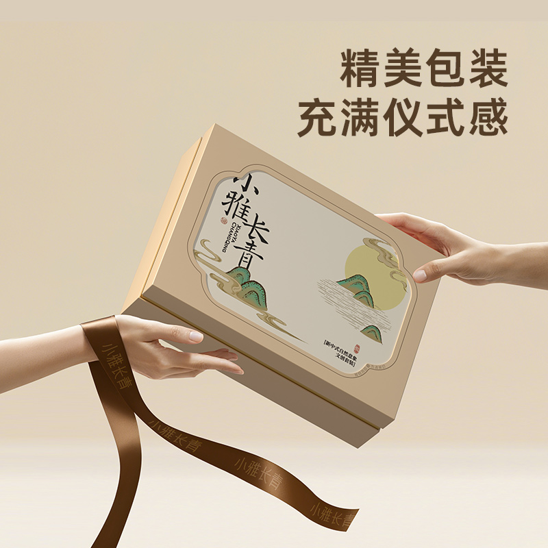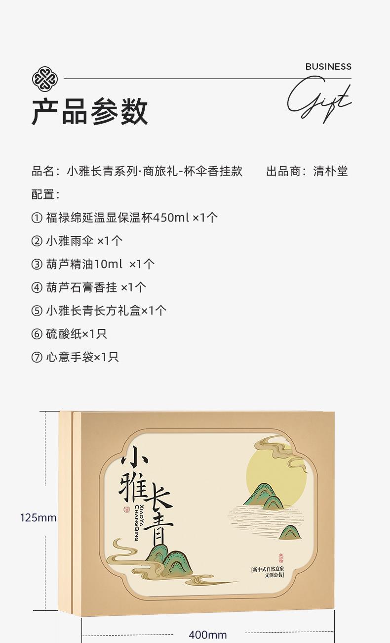 配置 · ① 福禄绵延·温显杯(450ml) ×1个 ② 小雅·晴雨伞×1个 ③ 葫芦·精油(10ml)×1个 ④ 葫芦·石膏香挂×1个 ⑤ 小雅·新中式礼盒手袋×1套