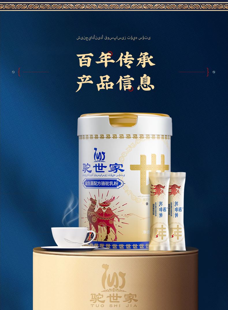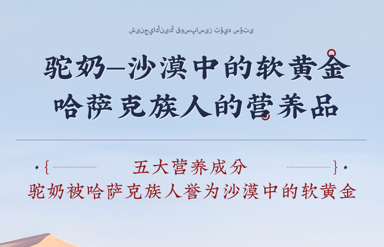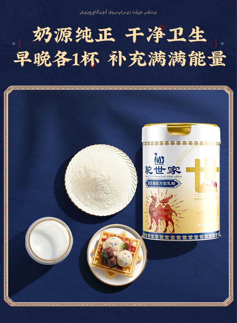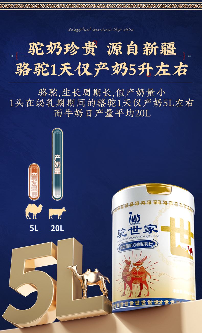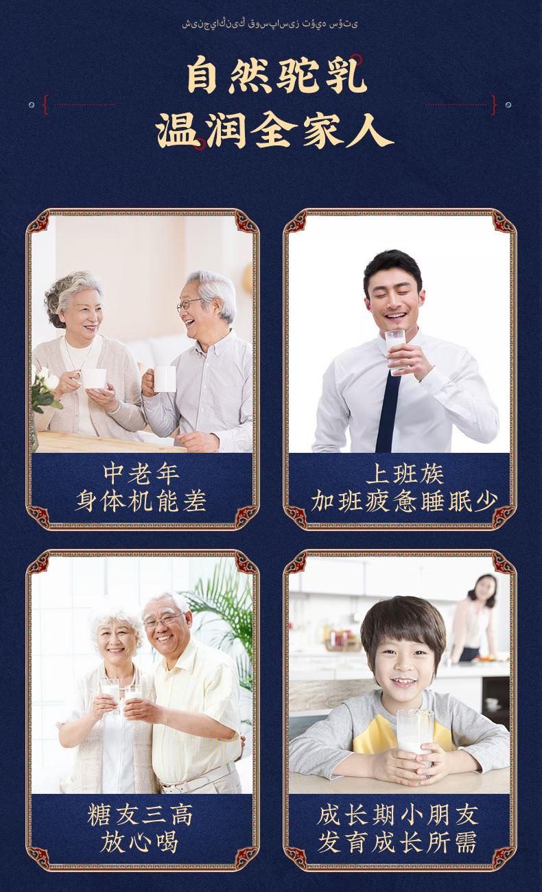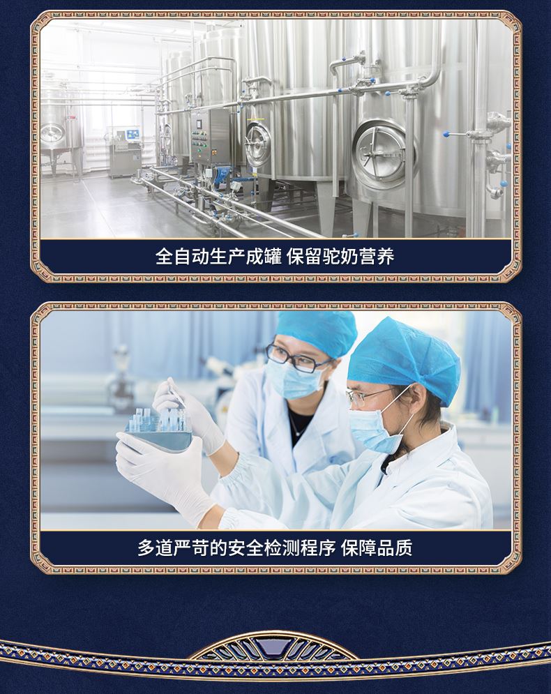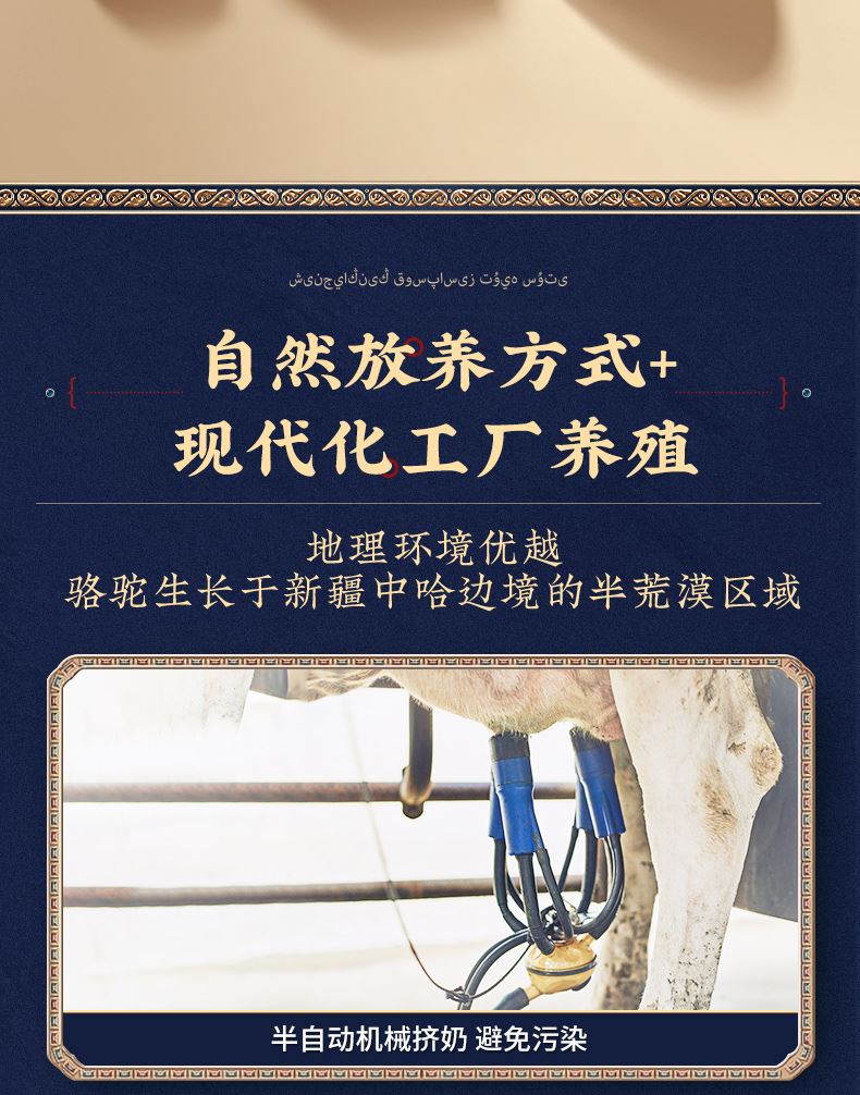 1、来自新疆伊犁,兵团八大牧场之一,专属奶源地,天然纯净无污 染,优选双峰骆驼,奶质更优,产奶更丰富 2、含3倍高钙,天然高蛋白,营养更全面 3、额外添加益生菌,更易吸收,消化 4、半自动机械挤奶;全自动生产成罐,保留驼奶营养;进口冷冻干燥技术