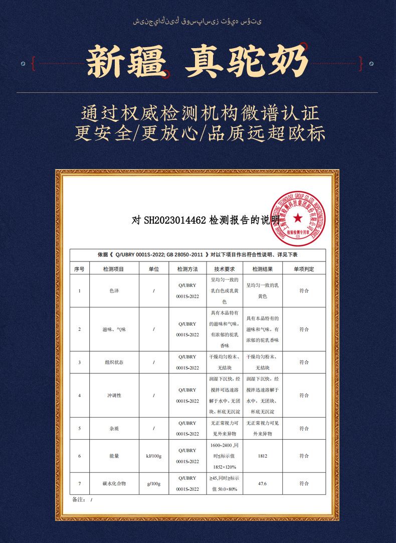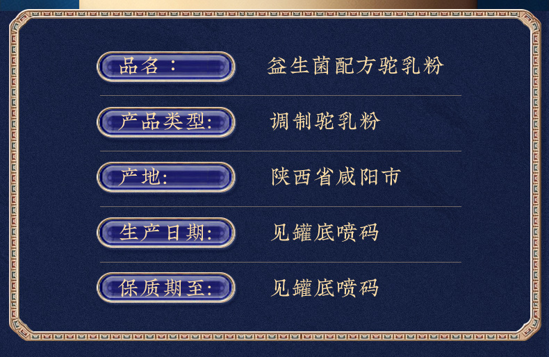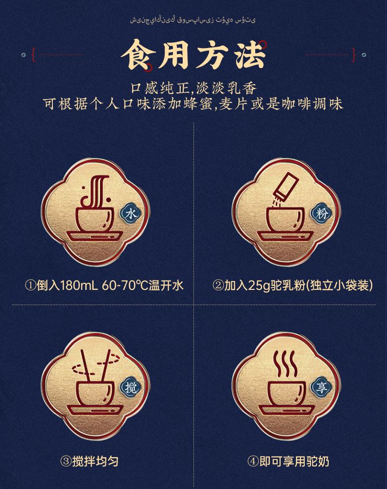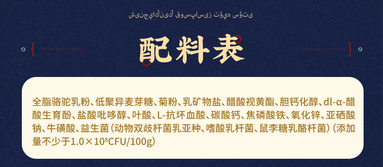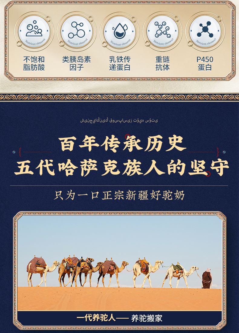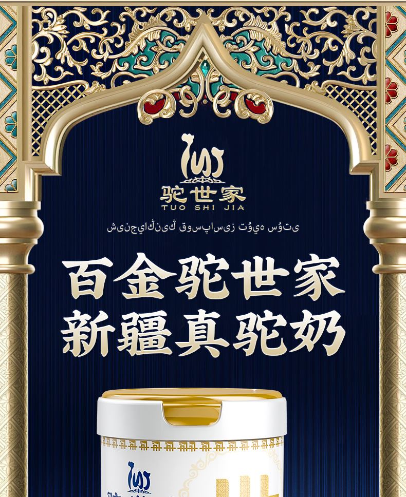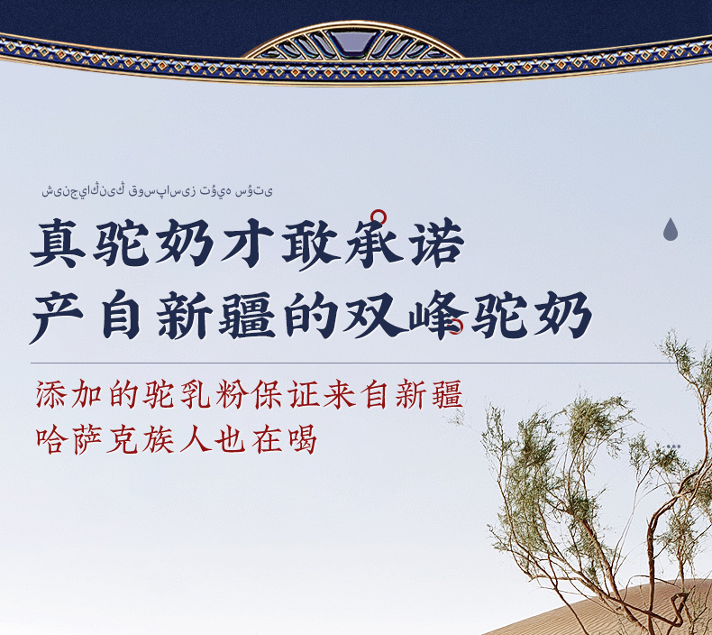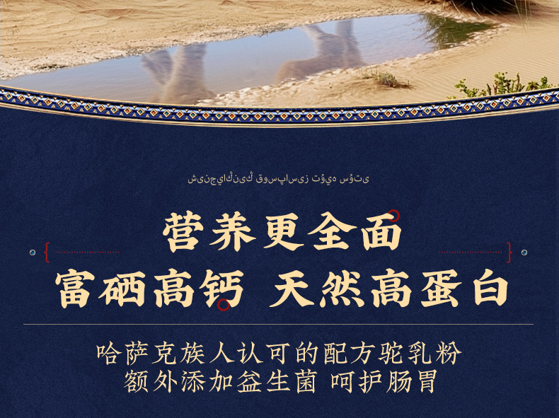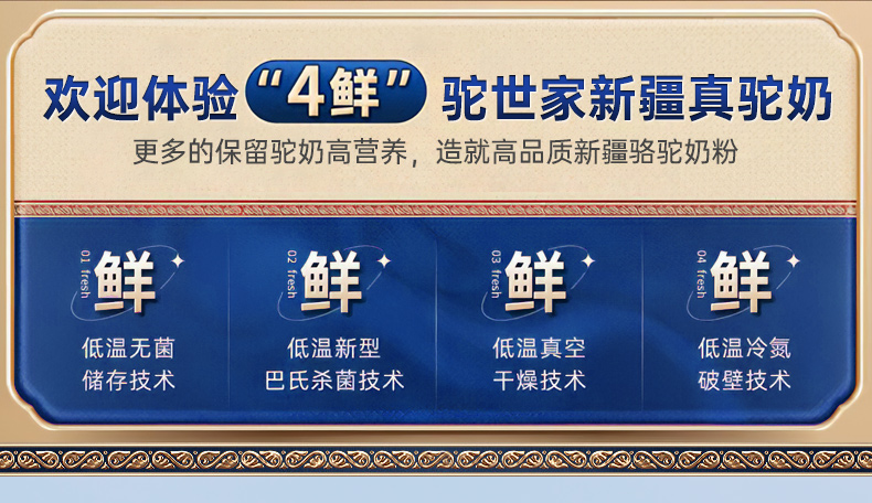 1、来自新疆伊犁,兵团八大牧场之一,专属奶源地,天然纯净无污 染,优选双峰骆驼,奶质更优,产奶更丰富 2、含3倍高钙,天然高蛋白,营养更全面 3、额外添加益生菌,更易吸收,消化 4、半自动机械挤奶;全自动生产成罐,保留驼奶营养;进口冷冻干燥技术