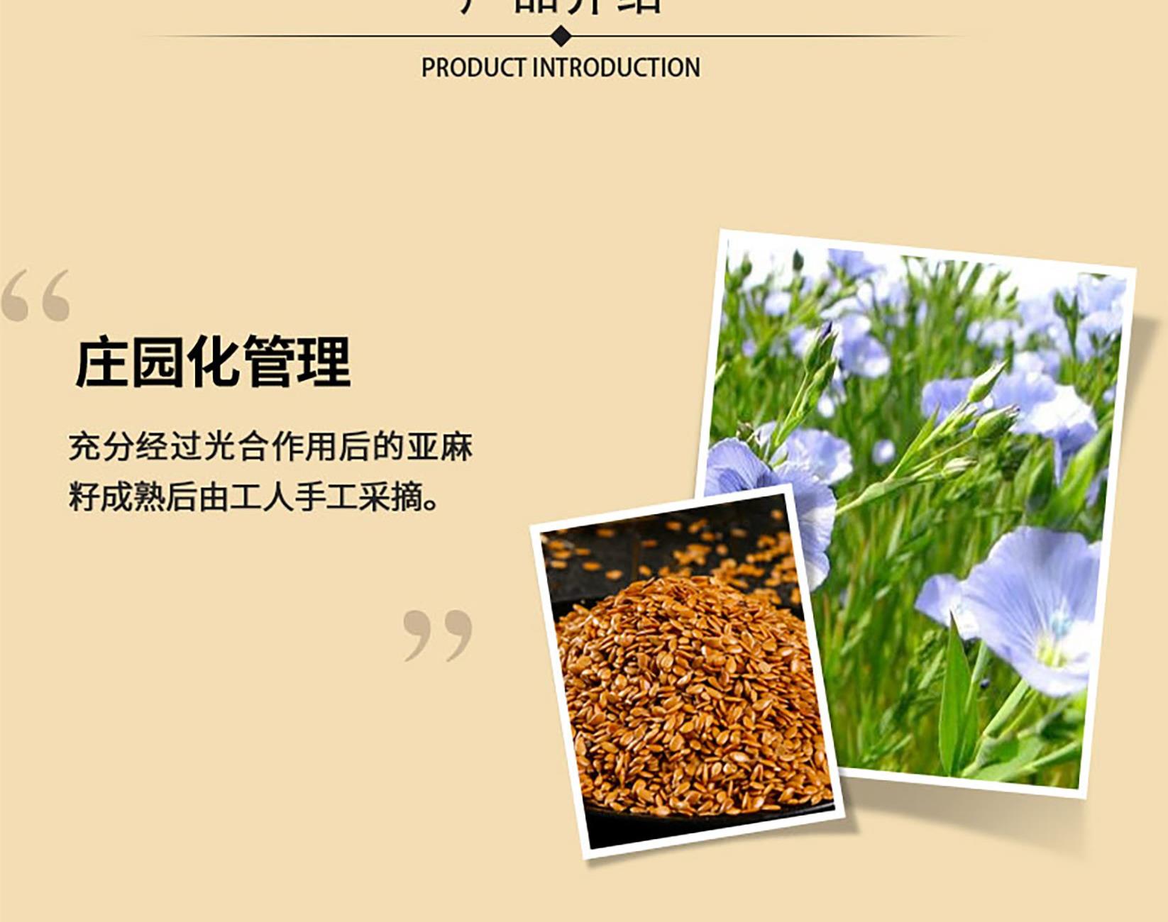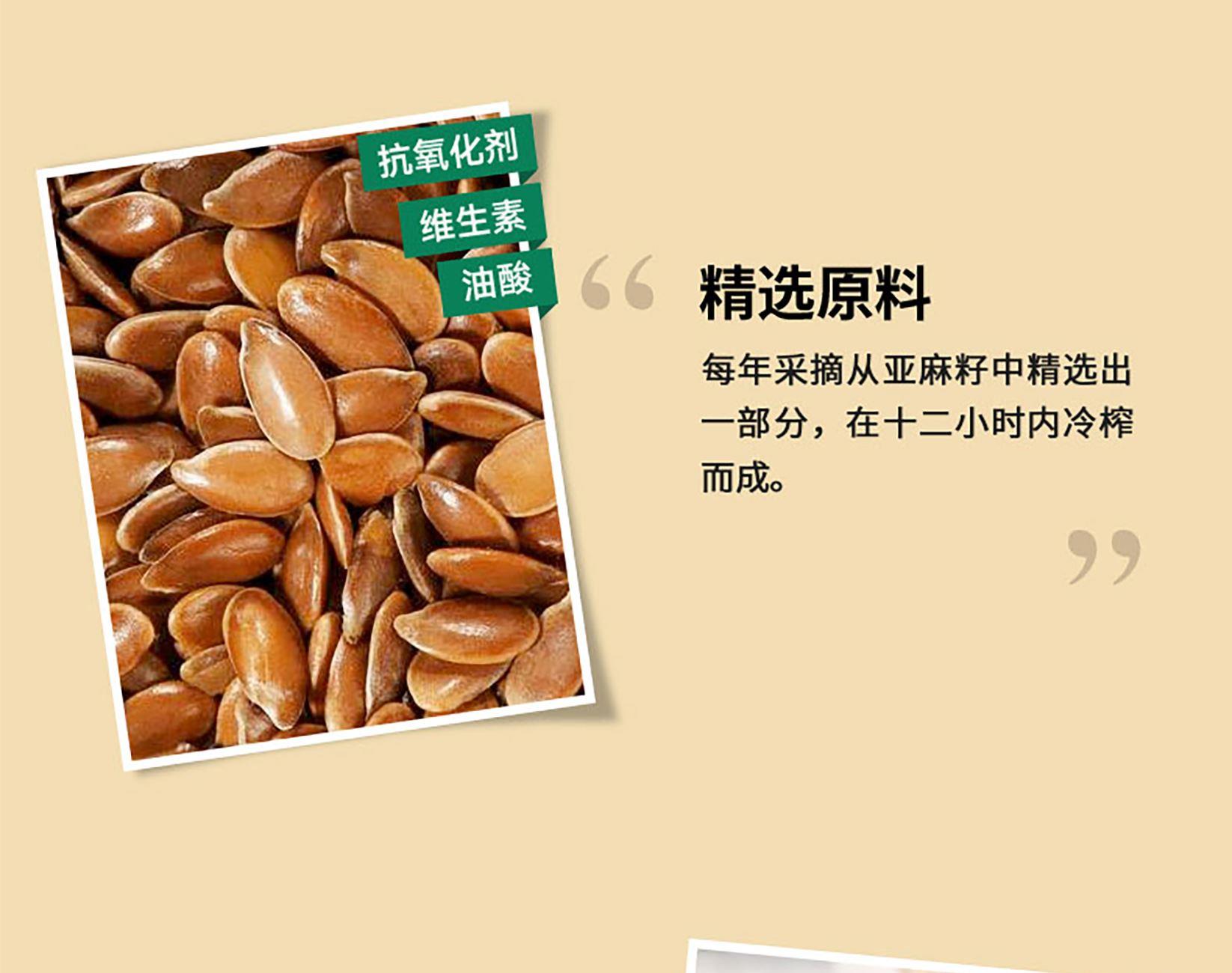 产地:中国 级别:冷榨亚麻籽油 土壤:石灰质土 净含量:750毫升X2 庄园化管理 充分经过光合作用后的亚麻籽成熟后由工人手工采摘。 品质保证 亚麻籽油口味香醇,颜色通透,被誉为厨房王子。 精选原料 每年采摘从亚麻籽中精选出一部分,在十二小时内冷榨而成。