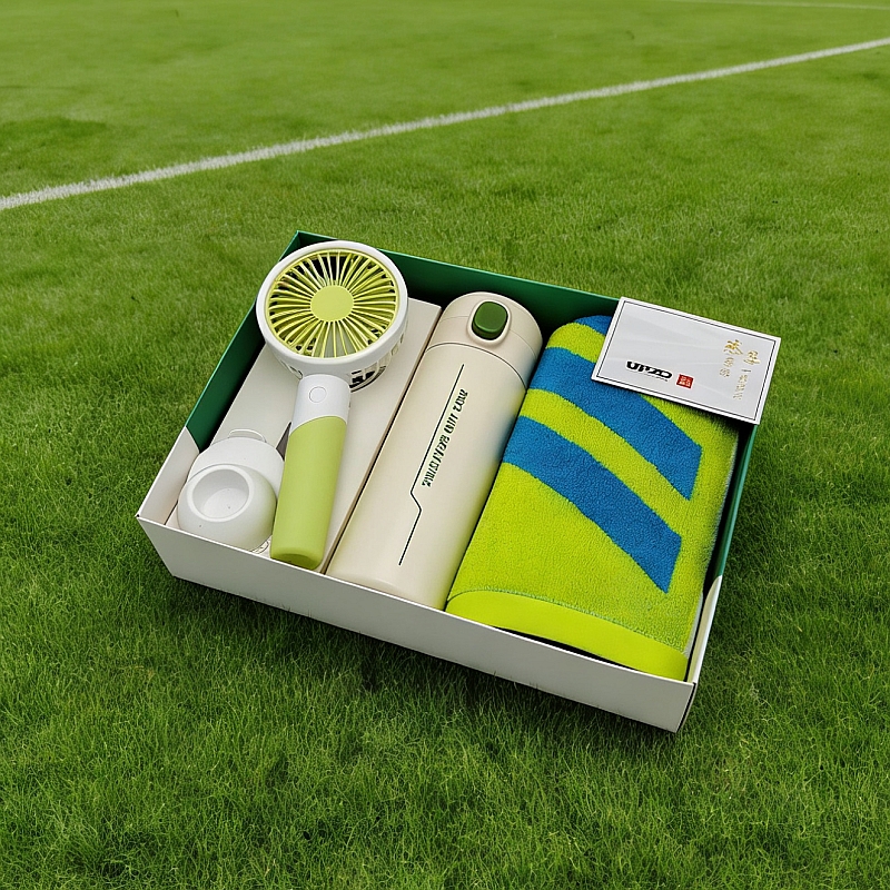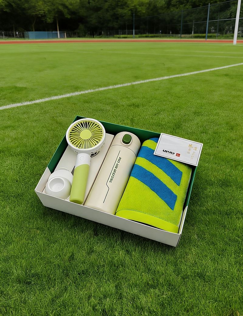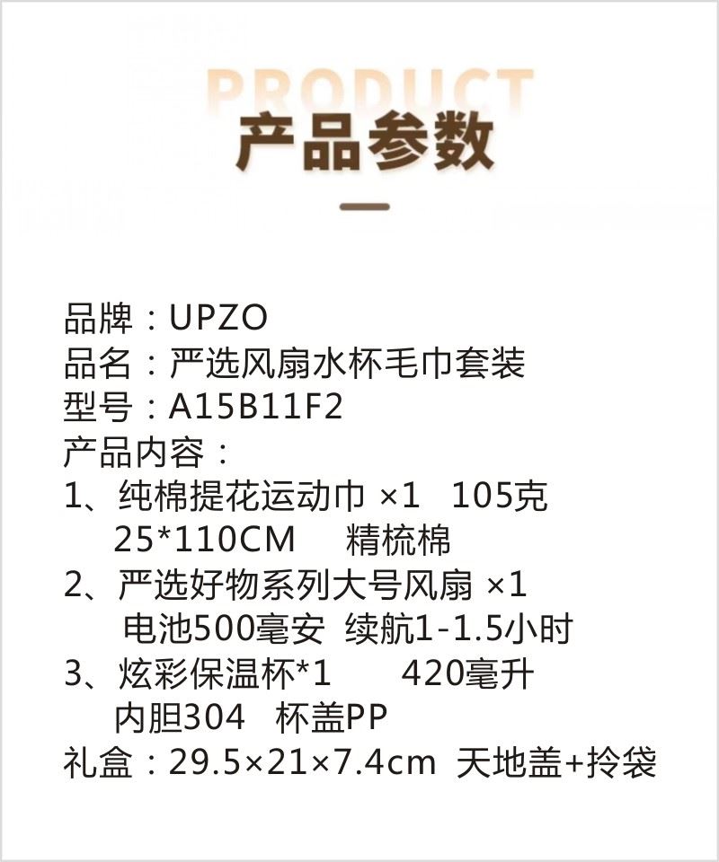 型号:A15B11F2 产品内容: 1、纯棉提花运动巾 ×1 尺寸:25*110CM 克重:105克 成份:精梳棉 2、严选好物系列大号风扇 ×1 电池容量 : 500毫安 续航1-1.5小时 3、炫彩保温杯×1 420ML容量 内胆304 杯盖PP 礼盒:29.5×21×7.4cm 天地盖+拎袋 手持大号风扇 500毫安 续航90分钟左右 风力三挡 炫彩保温杯 420毫升容量 304内胆 靓丽外观设计 纯棉提花运动巾精选精梳棉材质结合色织工艺 优质美观